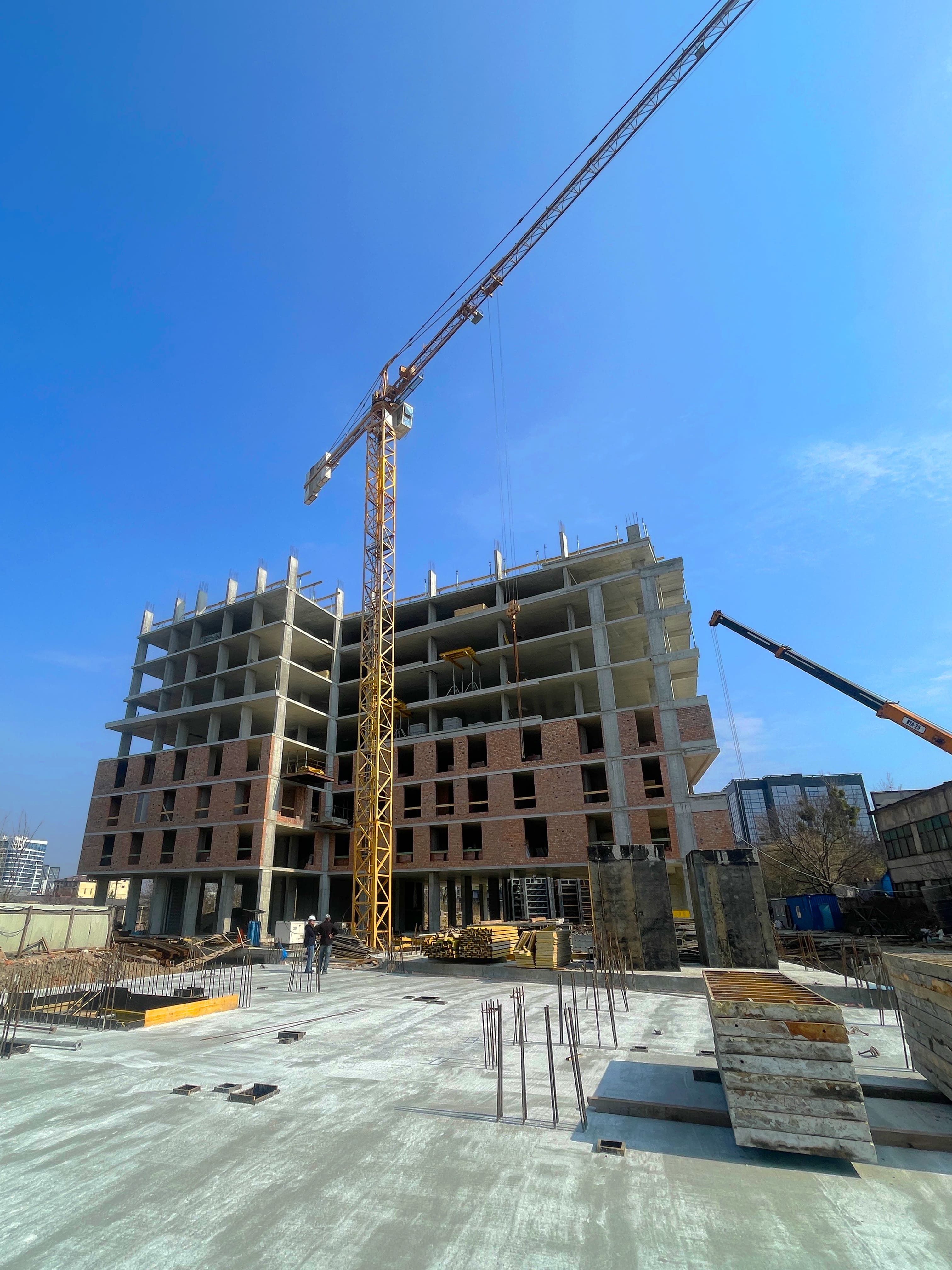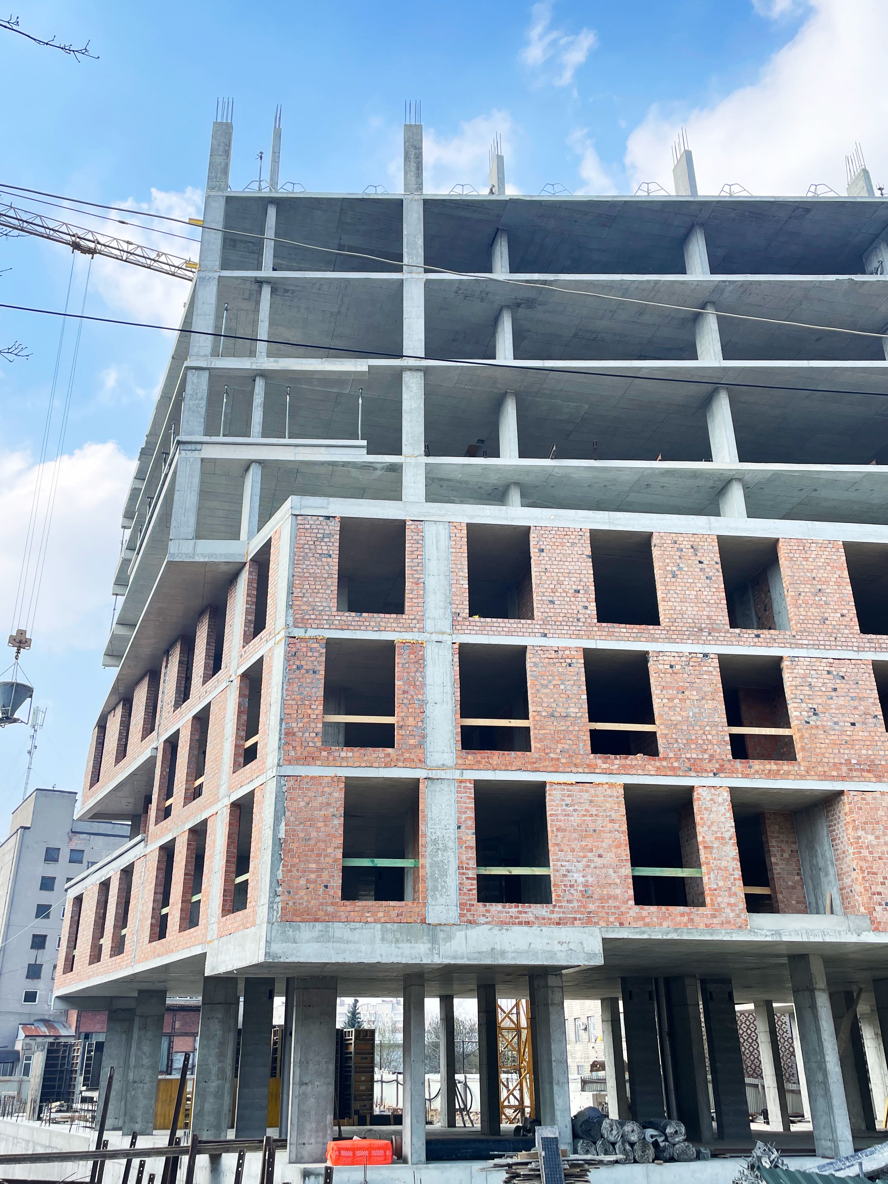 В рамках будівельних робіт активно ведуться роботи по двох чергах. Наразі у першій черзі заливають сходові марші, що є важливим етапом для забезпечення надійної та безпечної конструкції. Одночасно триває мурування стін 2-4 поверху, що дозволяє формувати основні обʼєми майбутньої будівлі. По другій черзі завершено монолітні роботи по влаштування двох підземних поверхів.