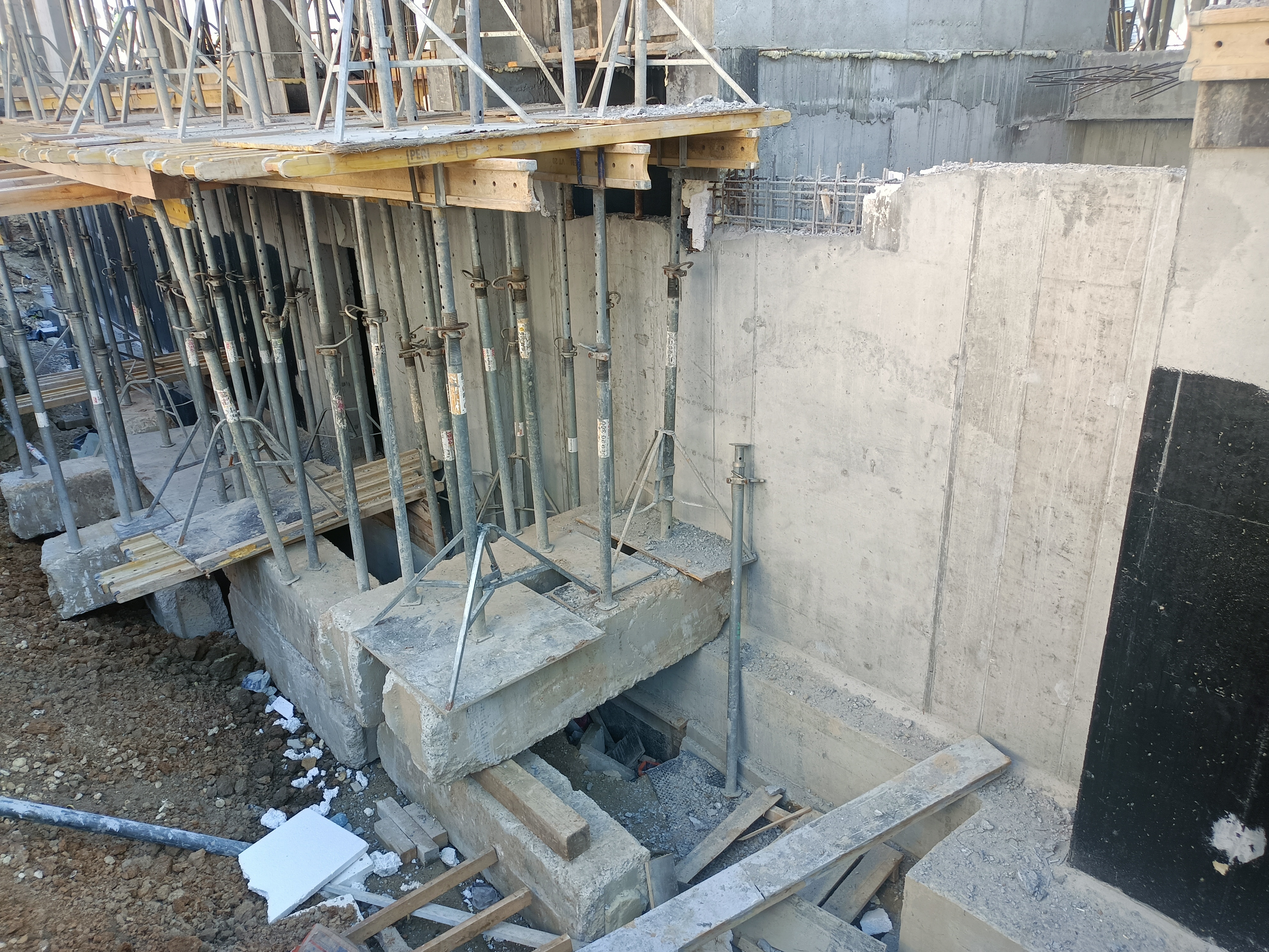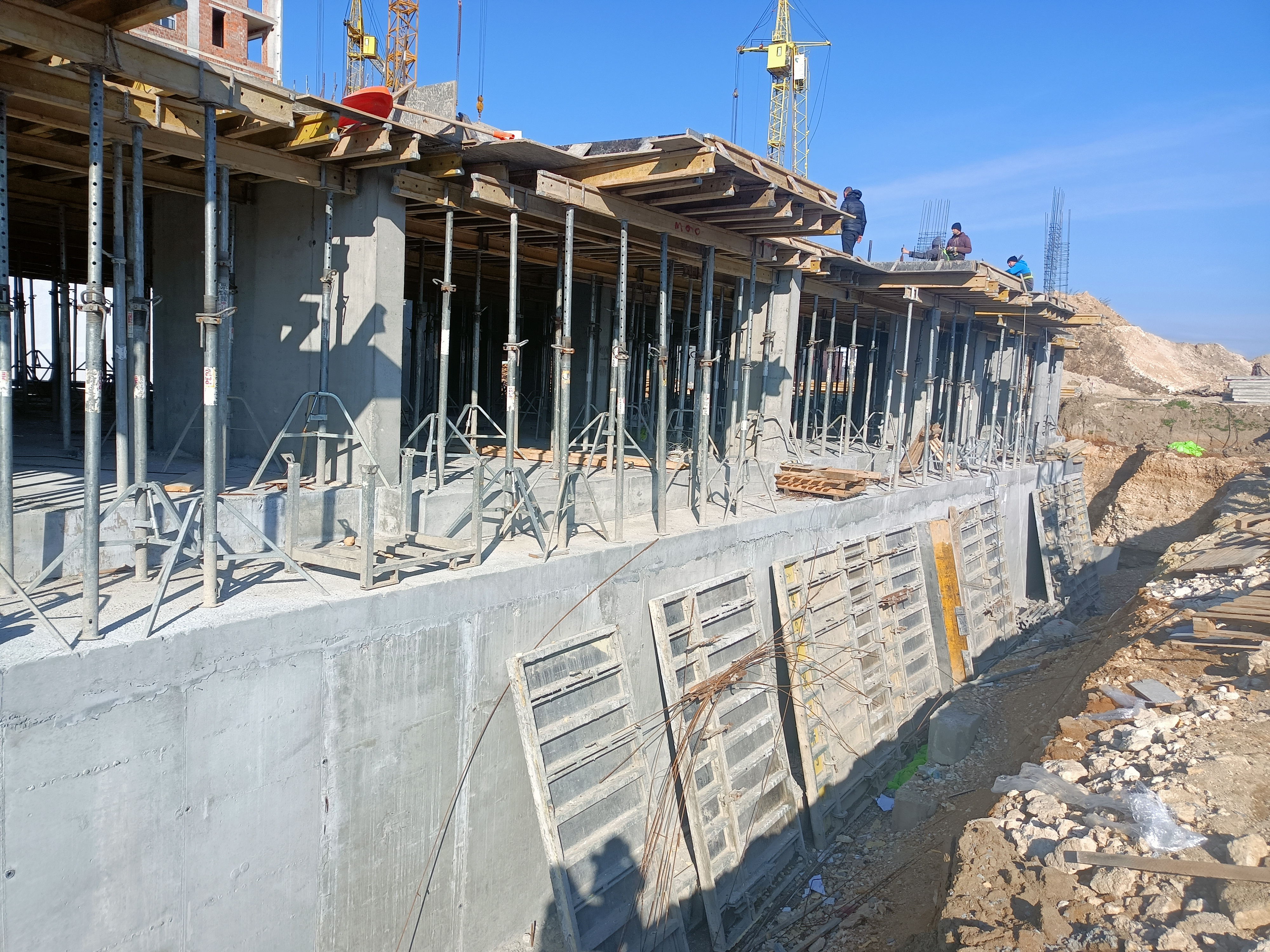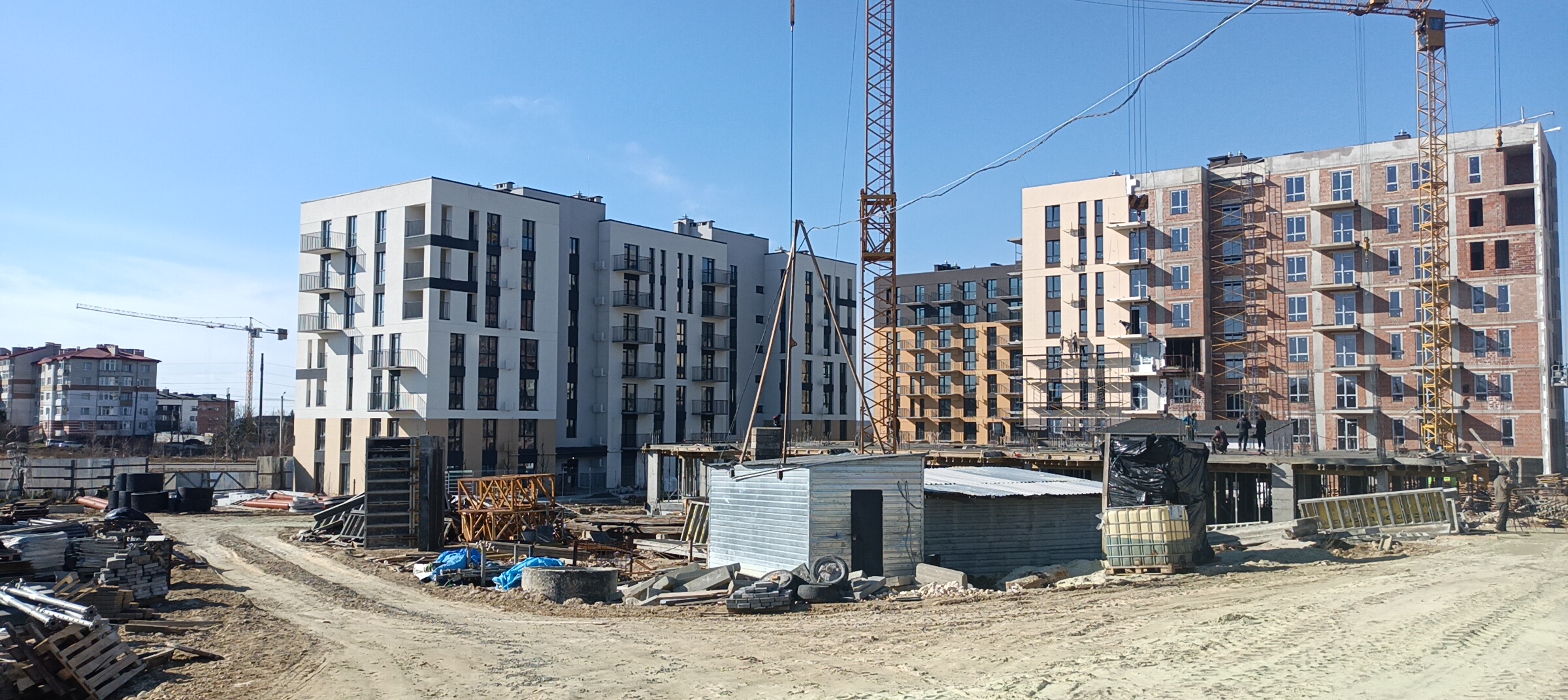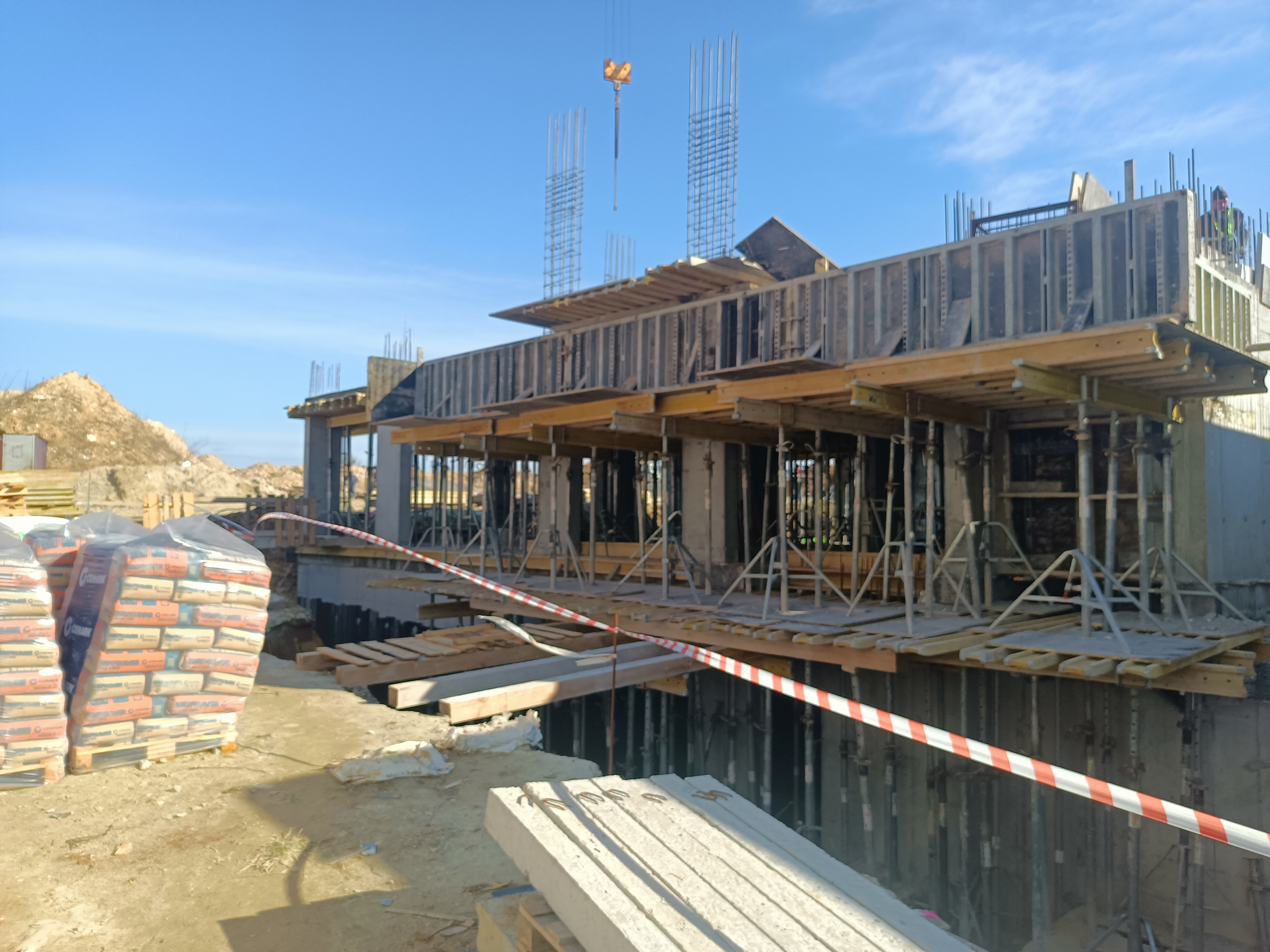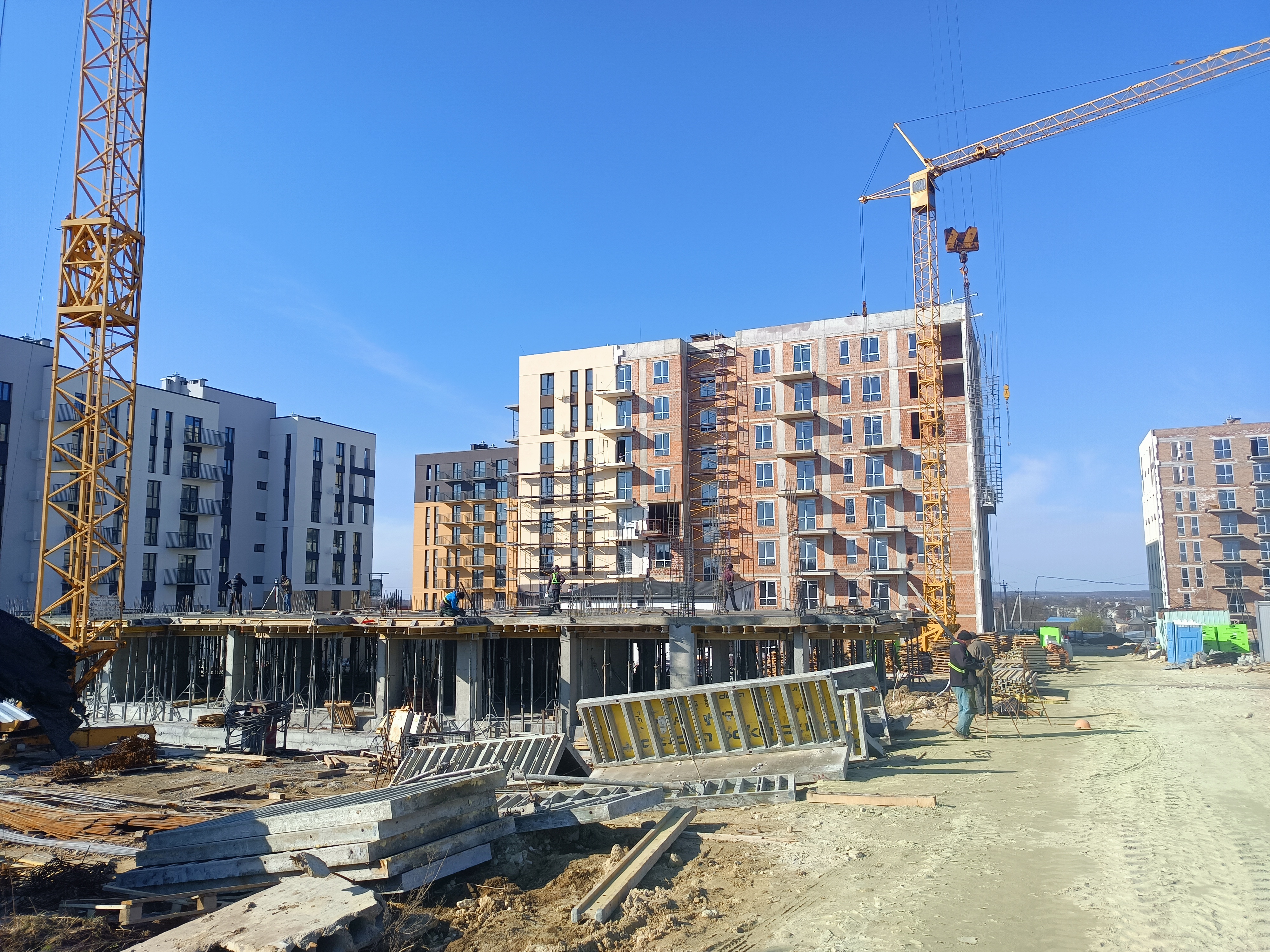 Наразі авторський нагляд здійснюється над будинком 4. Уже залита фундаментна плита, виконано паркінг, встановлено колони та перекриття між першим і другим поверхами. Зараз розкладають арматуру та готуються до заливки колон другого поверху.