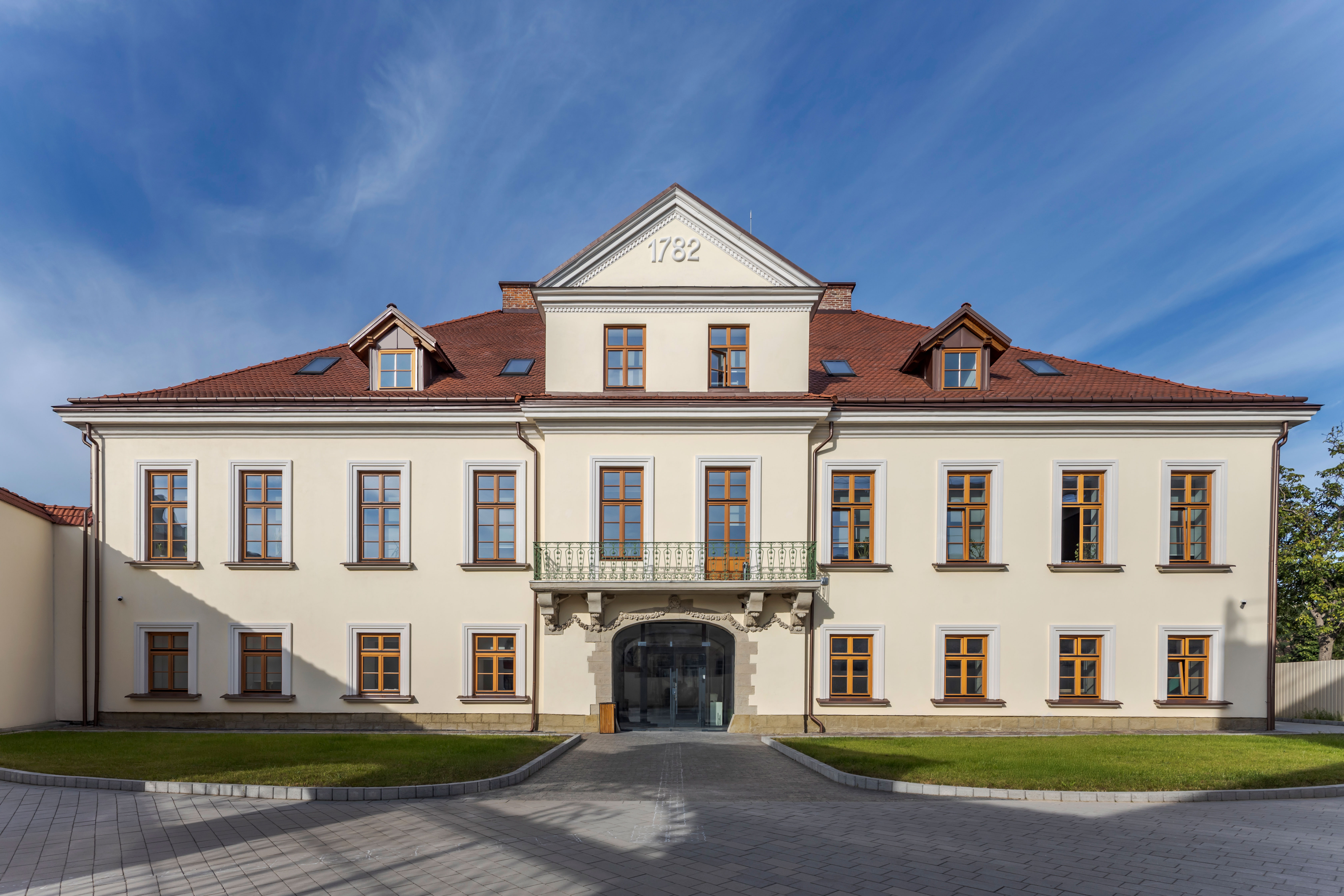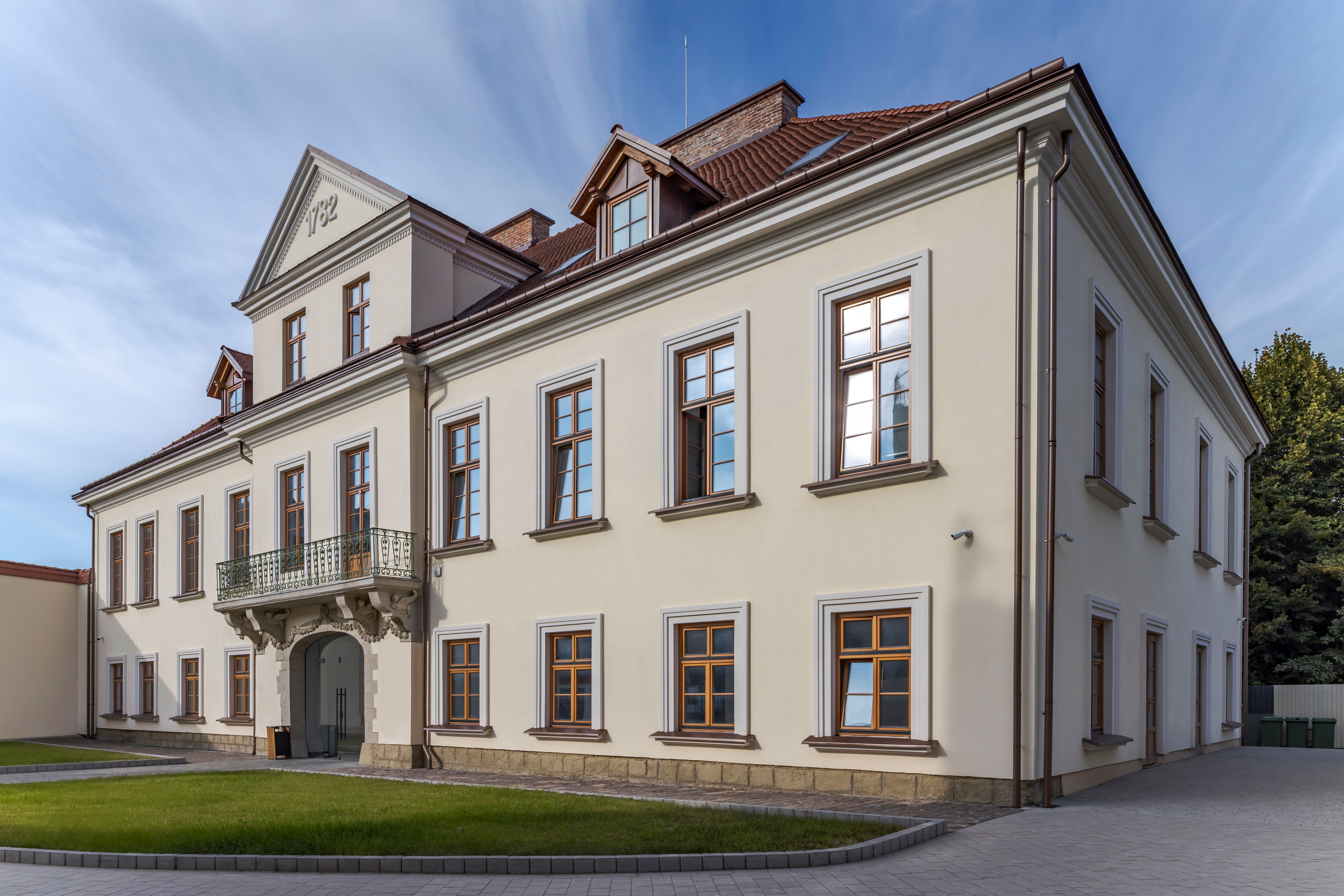 The historic Celjski Palace, built in the early 19th century by architect Fryderyk Bauman, featured a classical façade, an enfilade layout of ceremonial rooms, a balcony on carved brackets, and a grand entrance gate with stone lion sculptures. The interiors were decorated by renowned sculptors Anton Schimser and Herman Wittwer.