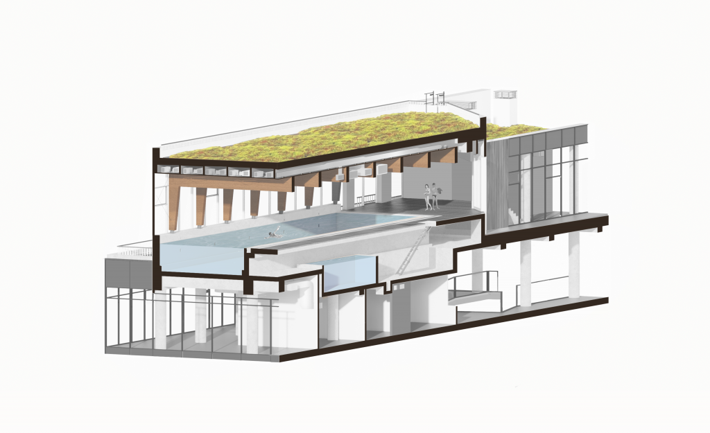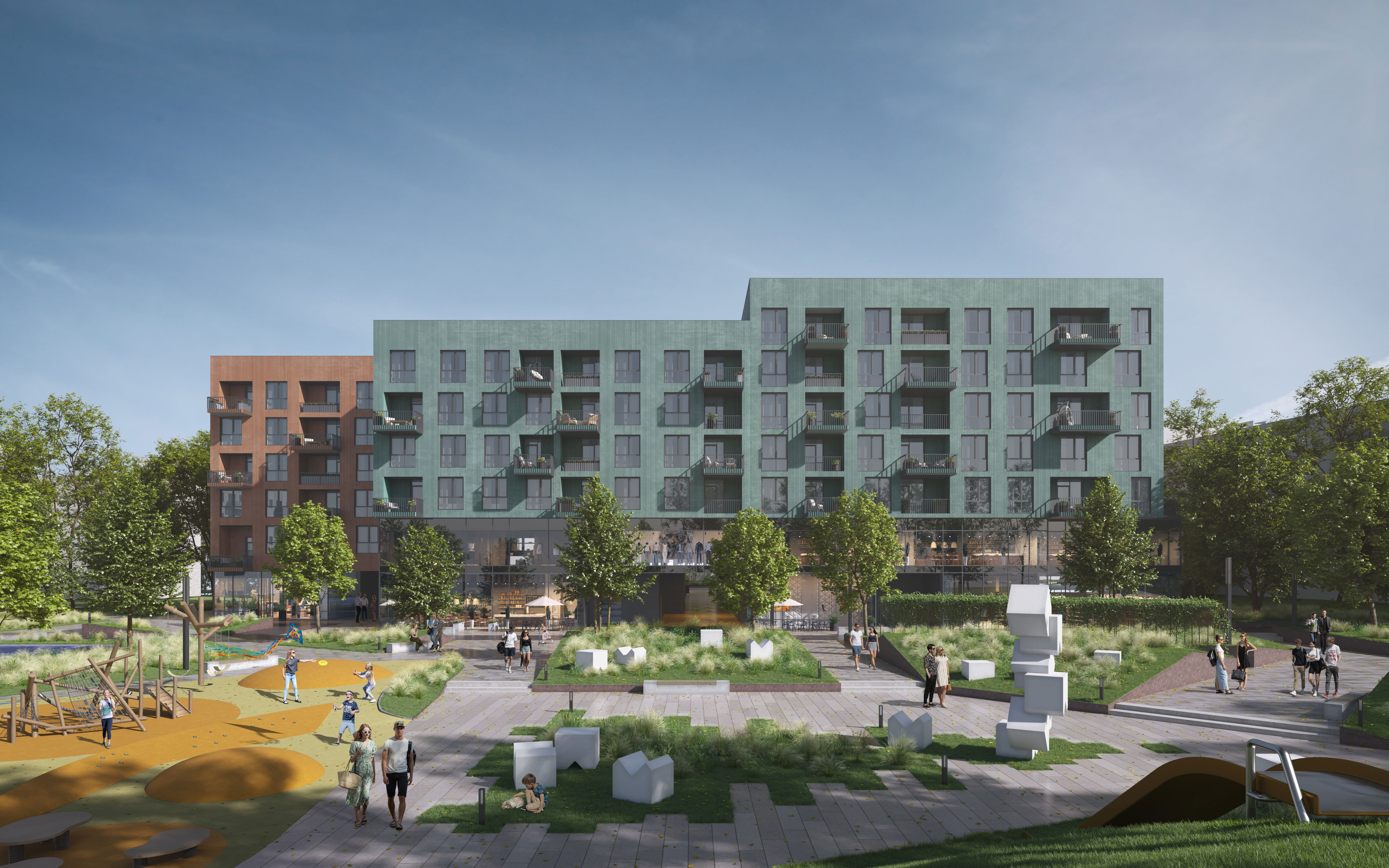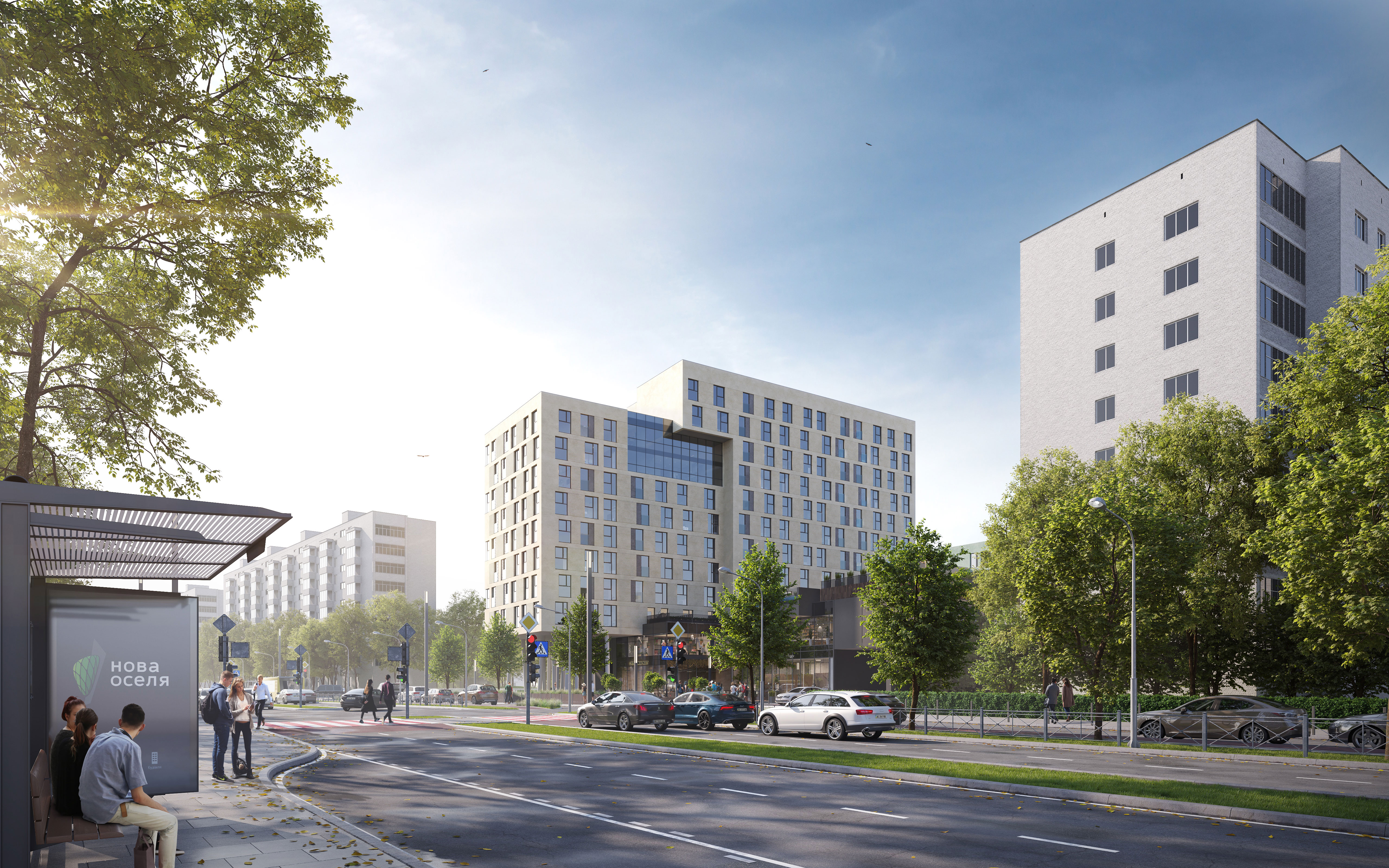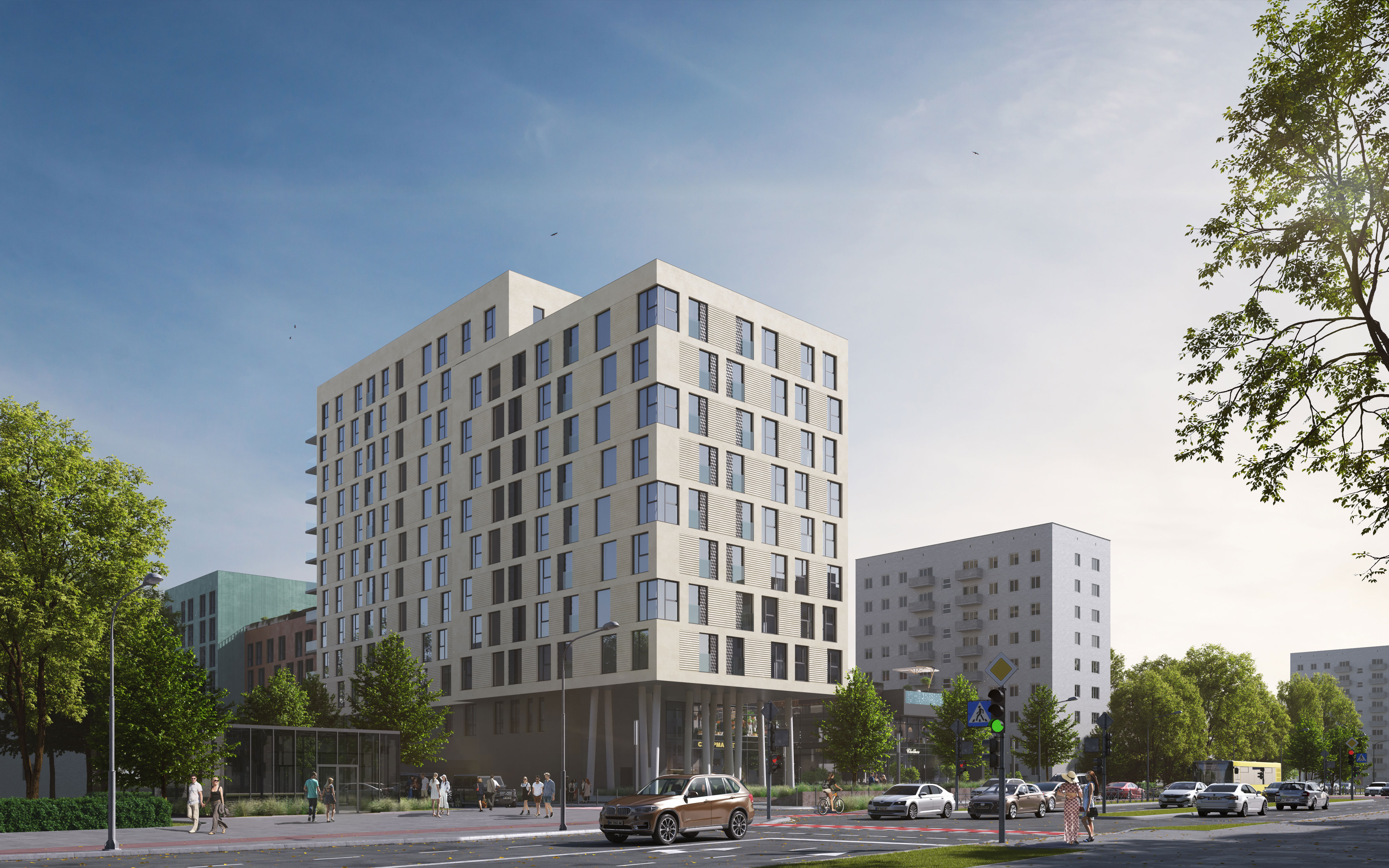На третьому поверсі цього комплексу розташована експлуатована покрівля з озелененням, що створює комфортну та затишну атмосферу. Тут також розташований басейн, яким можуть користуватись як мешканці будинку, так і відвідувачі торгового центру. На вищих поверхах розташовані квартири з різноманітним плануванням. Помешкання з видом на сквер поряд із комплексом мають літні приміщення, де завдяки парку створене тихе та затишне місце для відпочинку та комфорту. Однорівнена підземна автостоянка розділена на дві незалежні зони: для мешканців житлових секцій та відвідувачів торгового центру. Проект також включає зарядні станції для електромобілів, демонструючи увагу до сталого розвитку та турботу про навколишнє середовище.