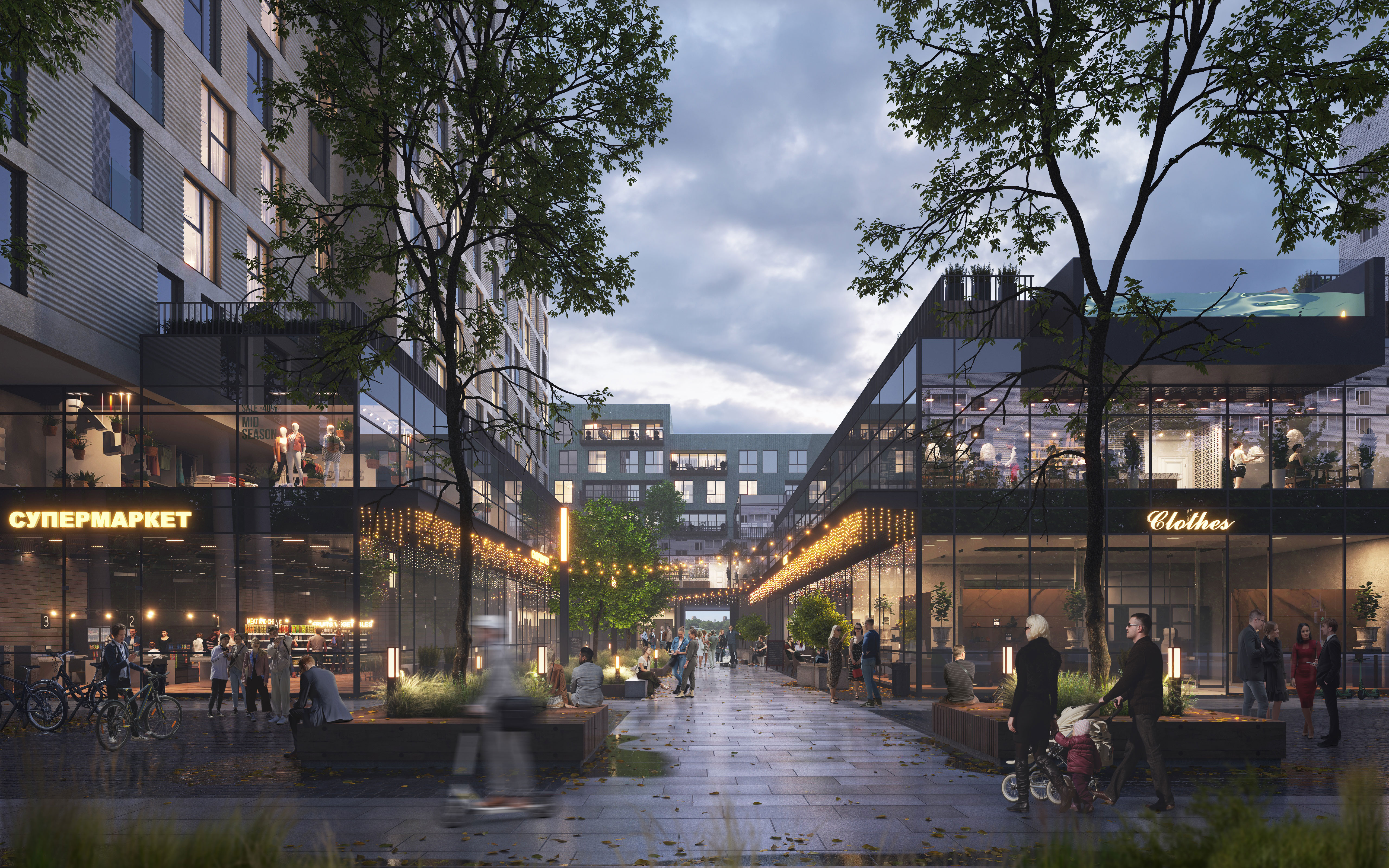 Перші два поверхи призначені для великого торгового центру, що включає кафе, магазини та продуктовий рітейл. На першому поверсі створений унікальний зв’язок між вулицею Любінською та прилеглим сквером, надаючи комфортне місце для відвідування торгових приміщень чи закладів харчування.