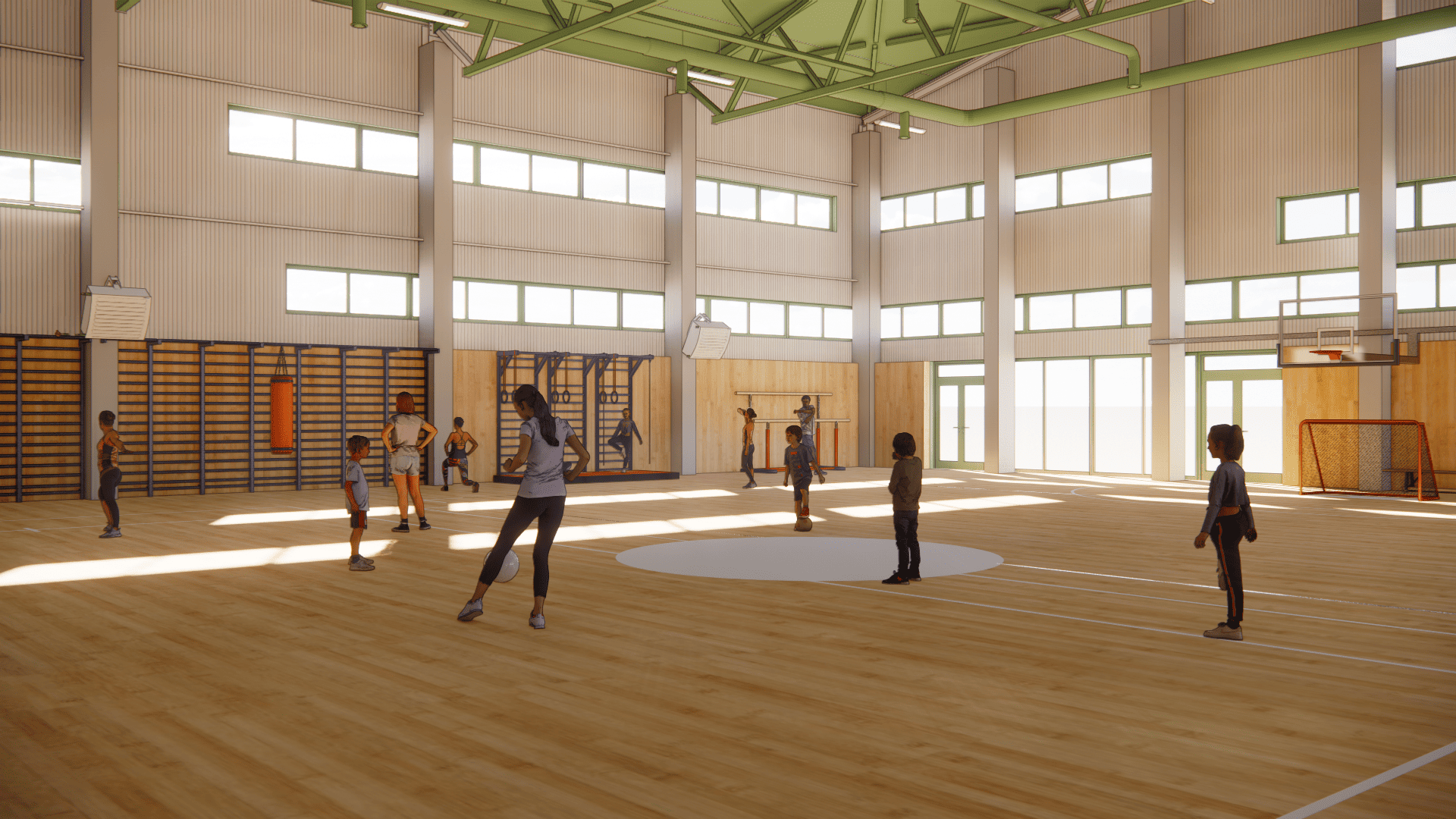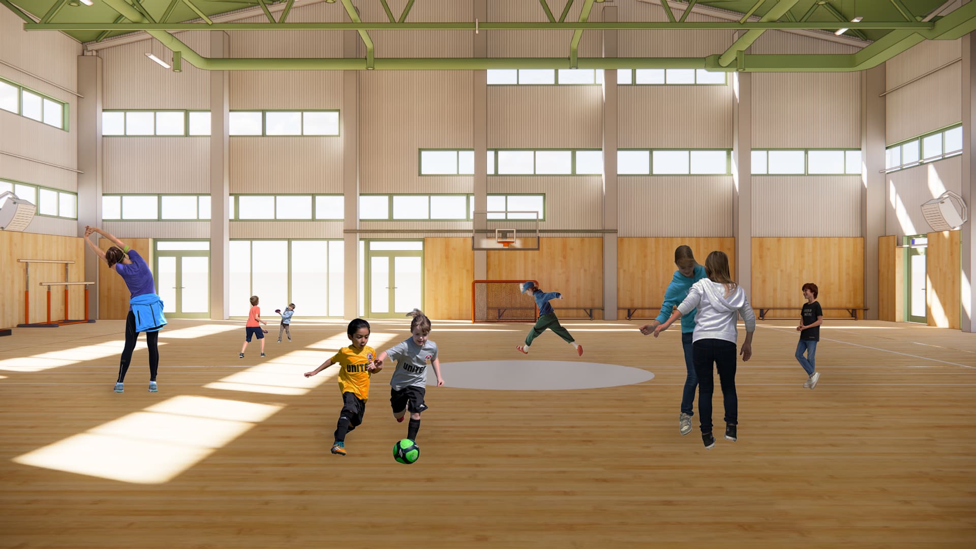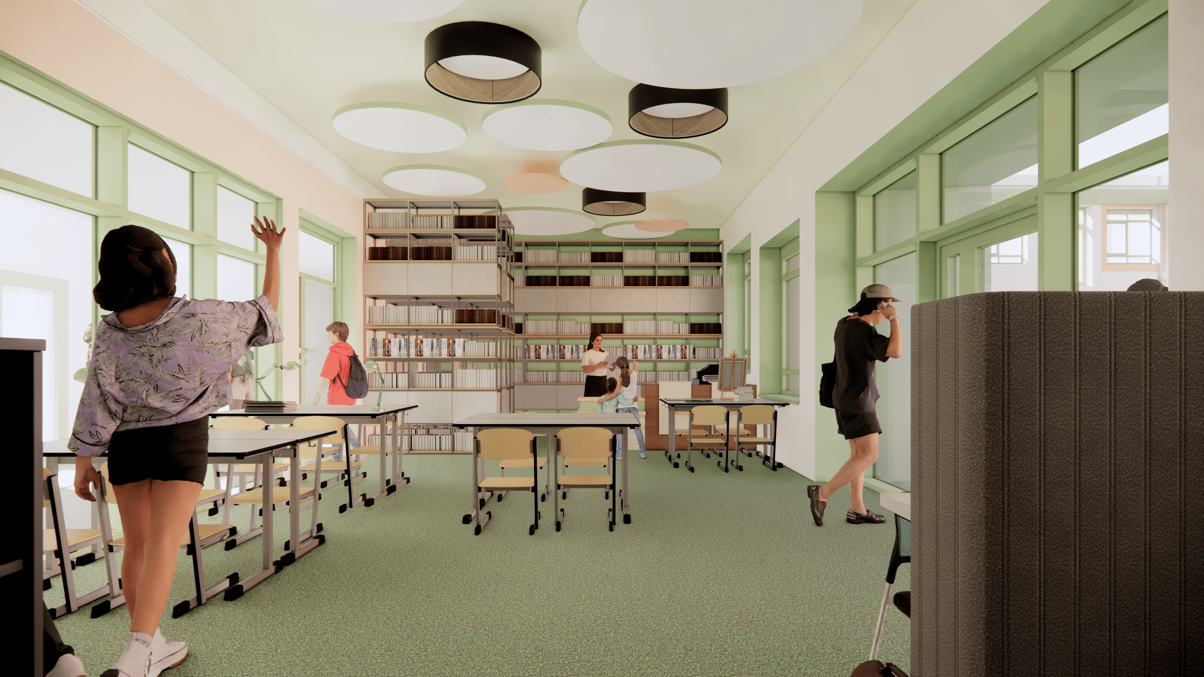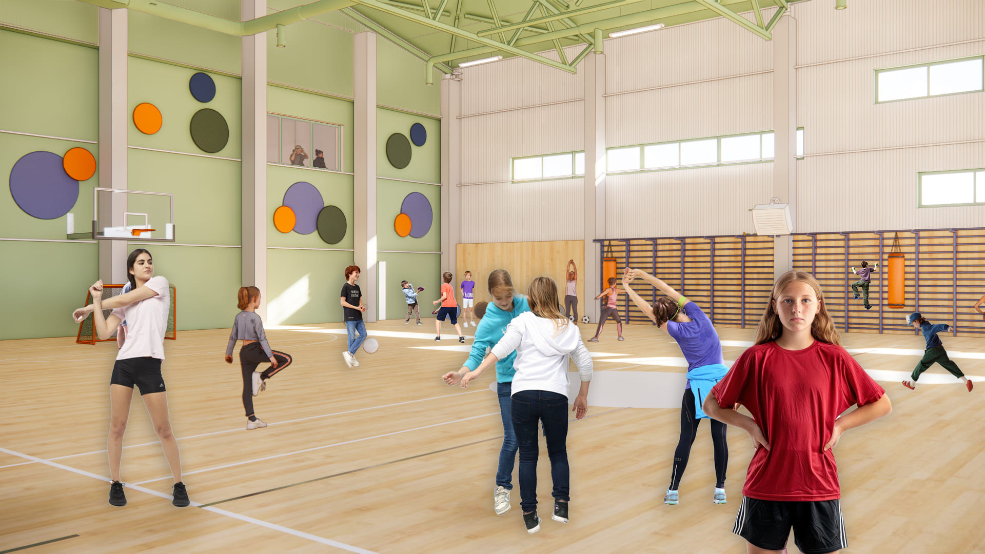 The reconstruction also includes the creation of a new cafeteria and an assembly hall. Beneath the newly added section of the gymnasium, there is a dedicated event space. The corridors of the existing building will be renovated to create recreational areas throughout the gymnasium. The sports hall, cafeteria, and library are located on the first floor, allowing them to be used outside school hours for clubs, community events, and extracurricular activities.