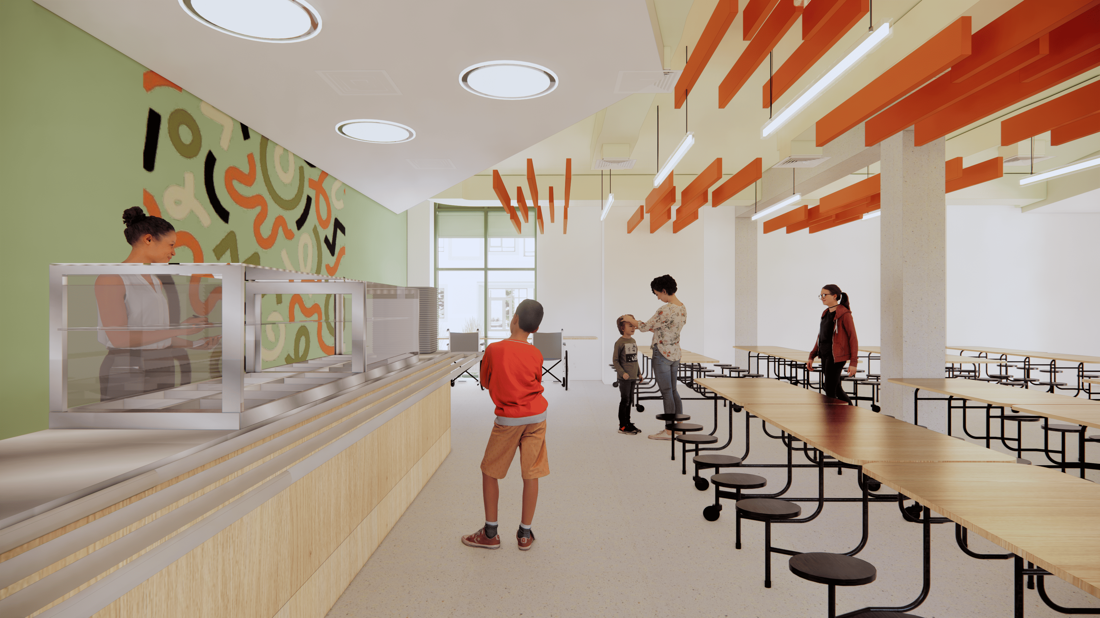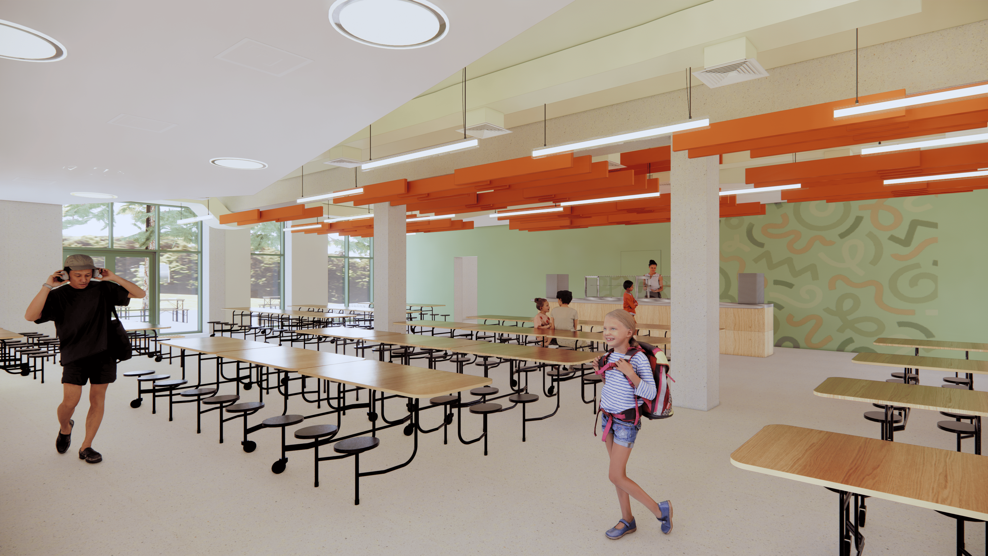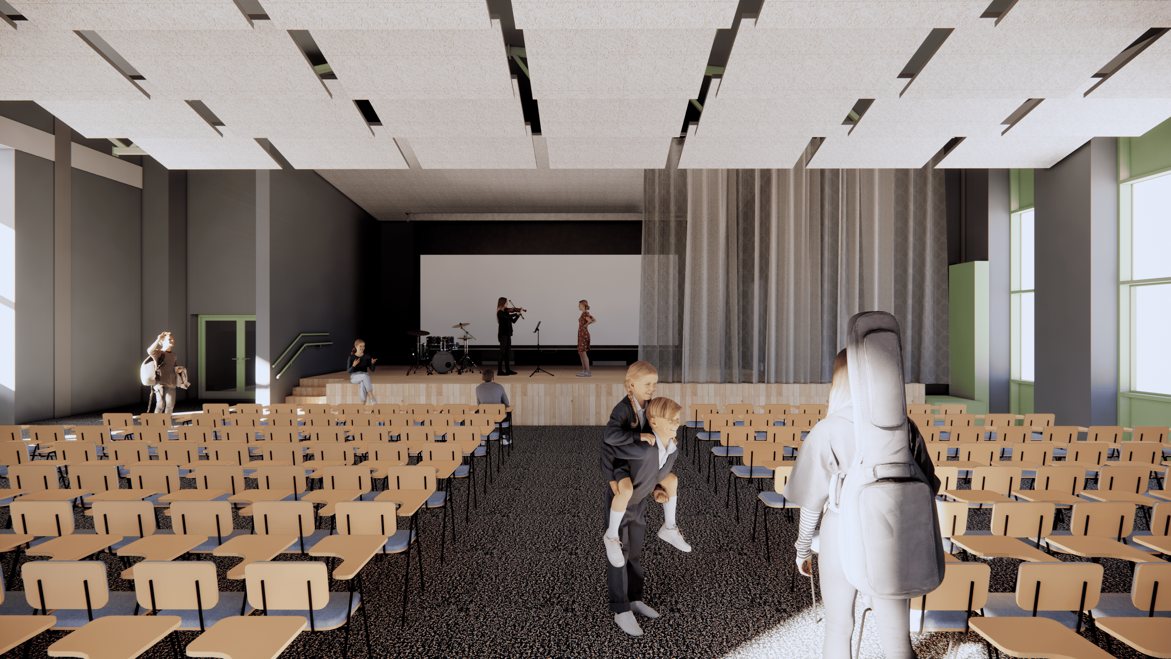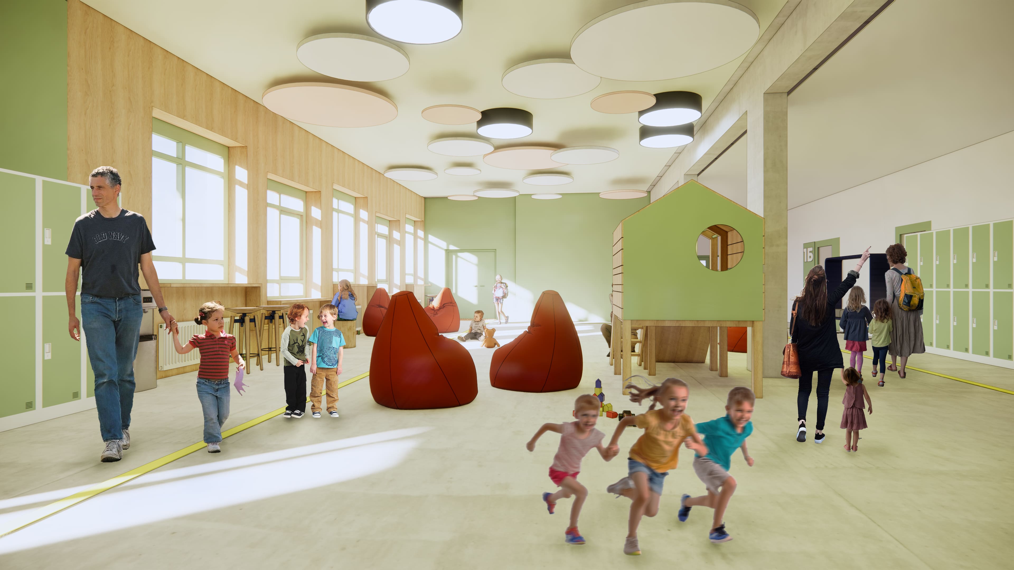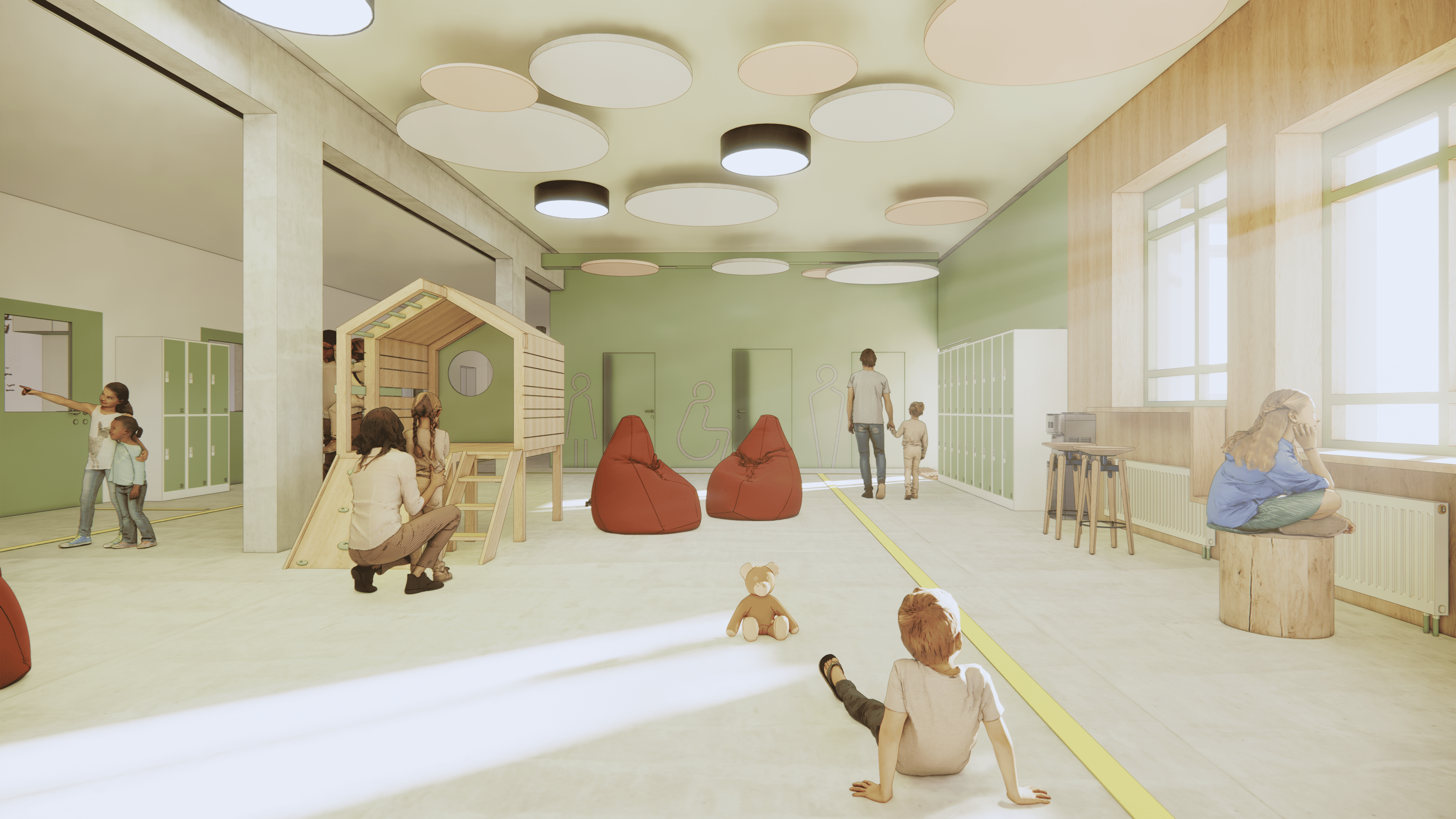 The reconstruction also includes the creation of a new cafeteria and an assembly hall. Beneath the newly added section of the gymnasium, there is a dedicated event space. The corridors of the existing building will be renovated to create recreational areas throughout the gymnasium. The sports hall, cafeteria, and library are located on the first floor, allowing them to be used outside school hours for clubs, community events, and extracurricular activities.