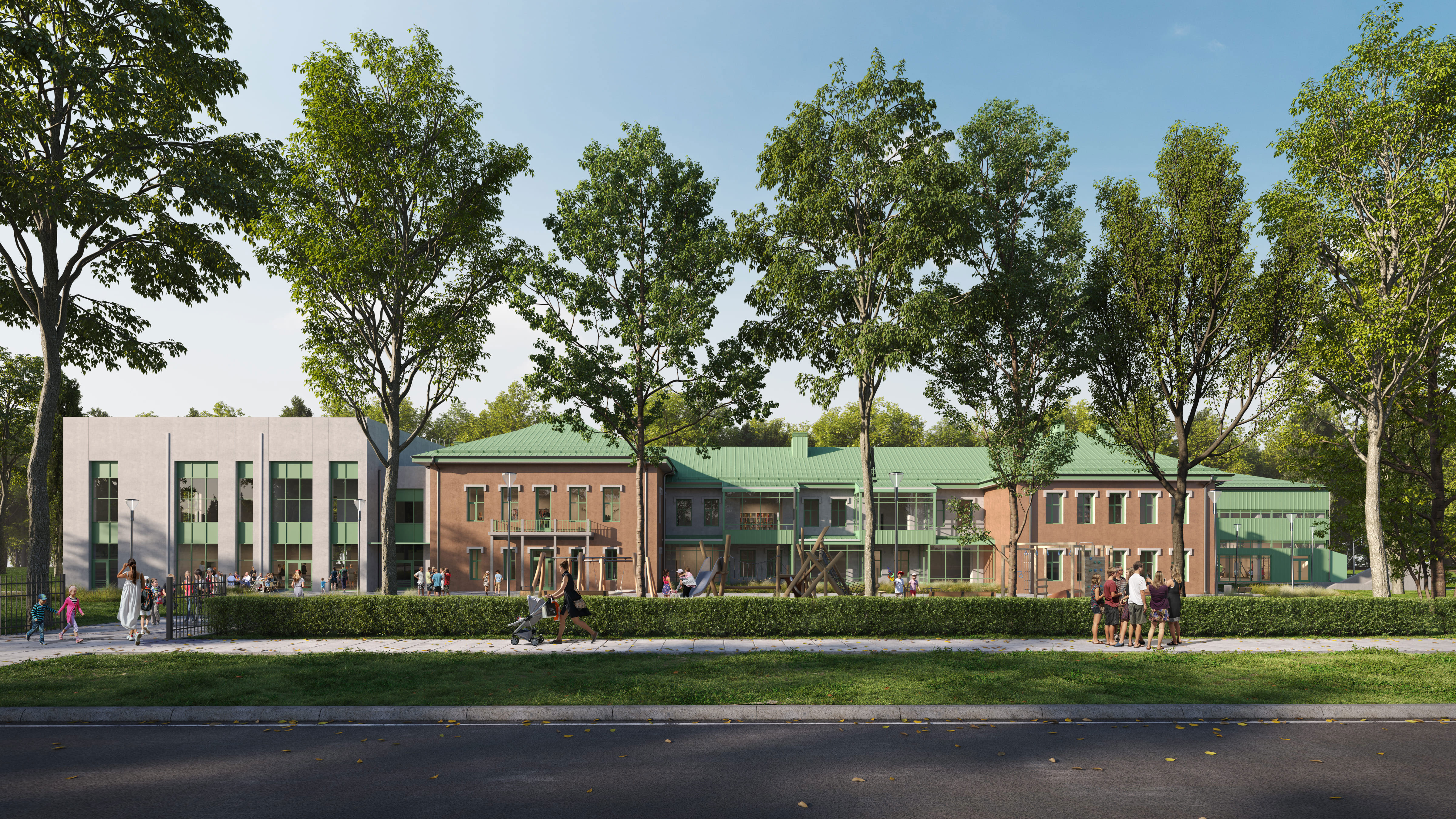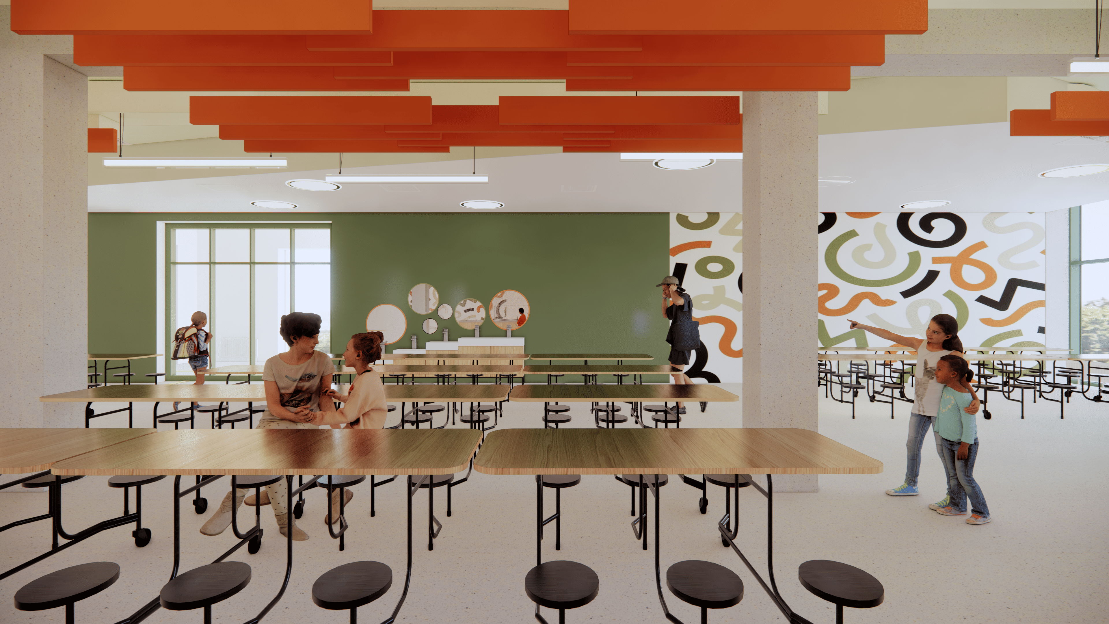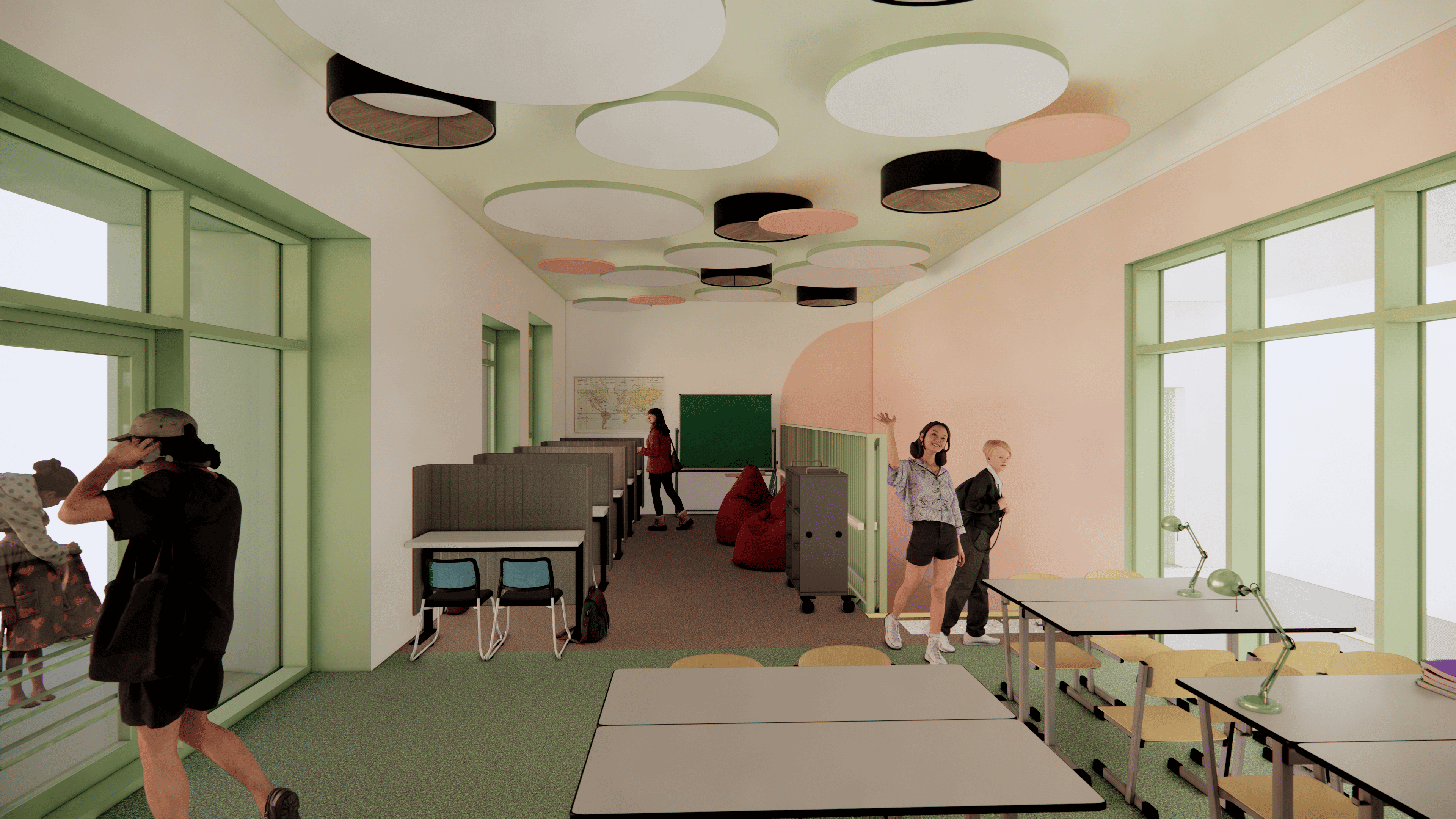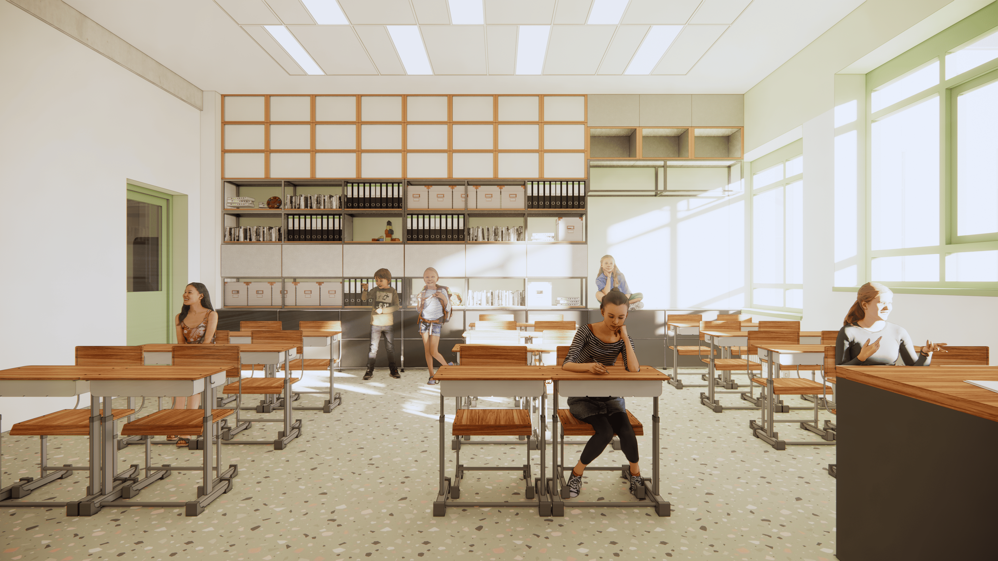 The reconstruction also includes the creation of a new cafeteria and an assembly hall. Beneath the newly added section of the gymnasium, there is a dedicated event space. The corridors of the existing building will be renovated to create recreational areas throughout the gymnasium. The sports hall, cafeteria, and library are located on the first floor, allowing them to be used outside school hours for clubs, community events, and extracurricular activities.