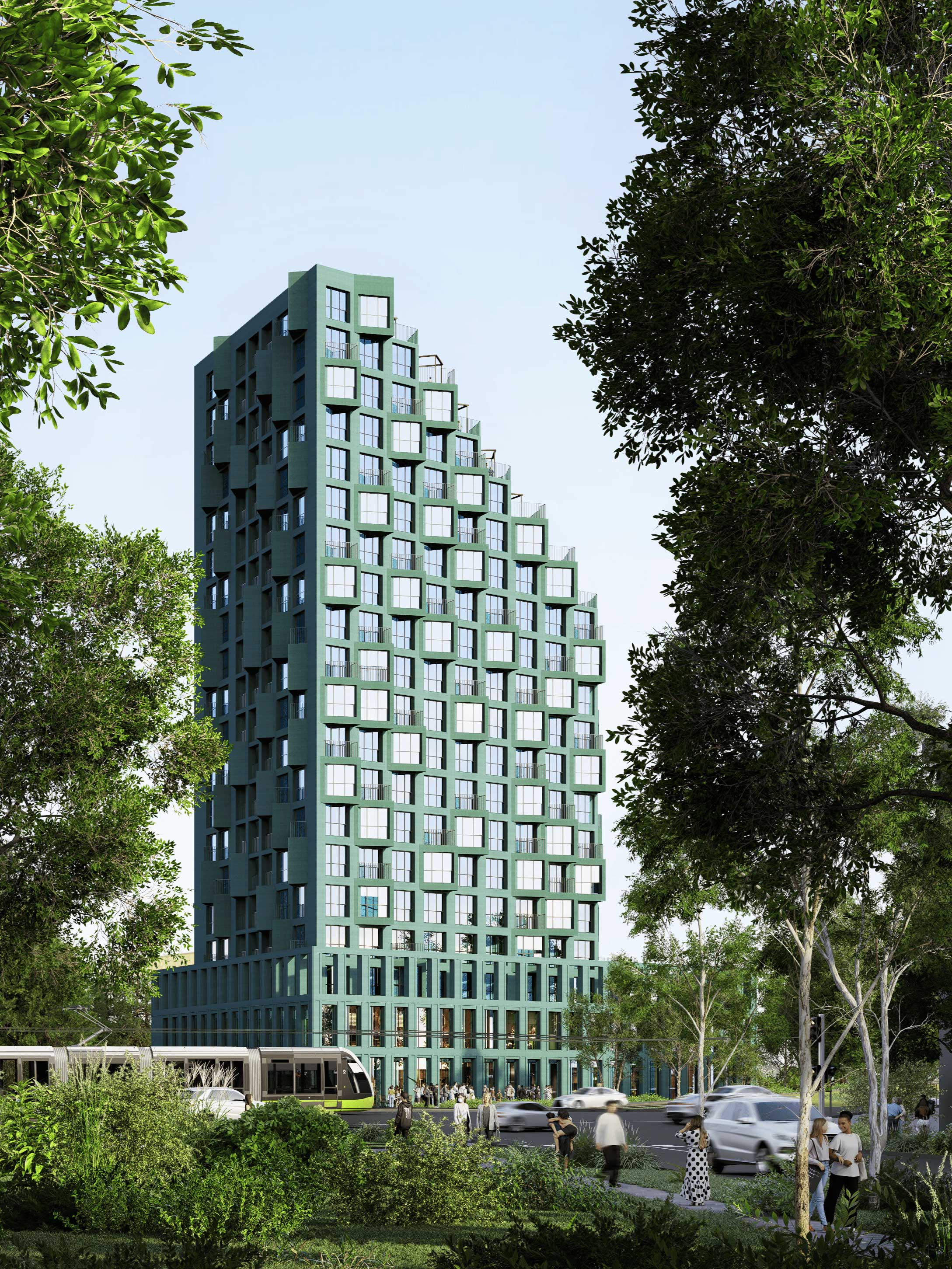 The plasticity of the façade and the volumetric-spatial composition of the building evoke a sense of movement, lightness, and rhythmic development. This is expressed through varying heights, cascading levels, and diverse terraces that give the building a living, “breathing” form. The result is not a monolithic structure but an organic composition, open to interaction with the city.