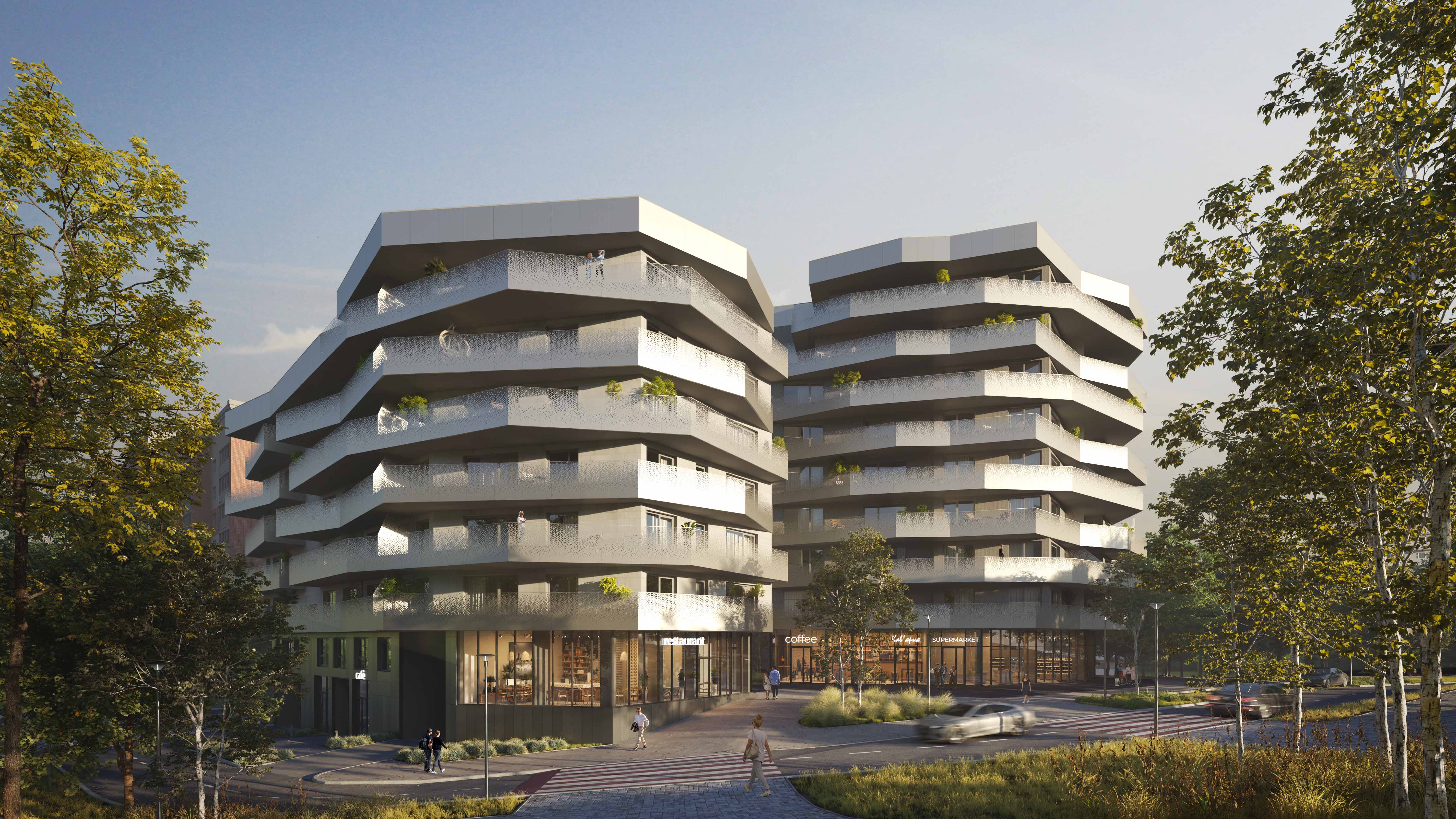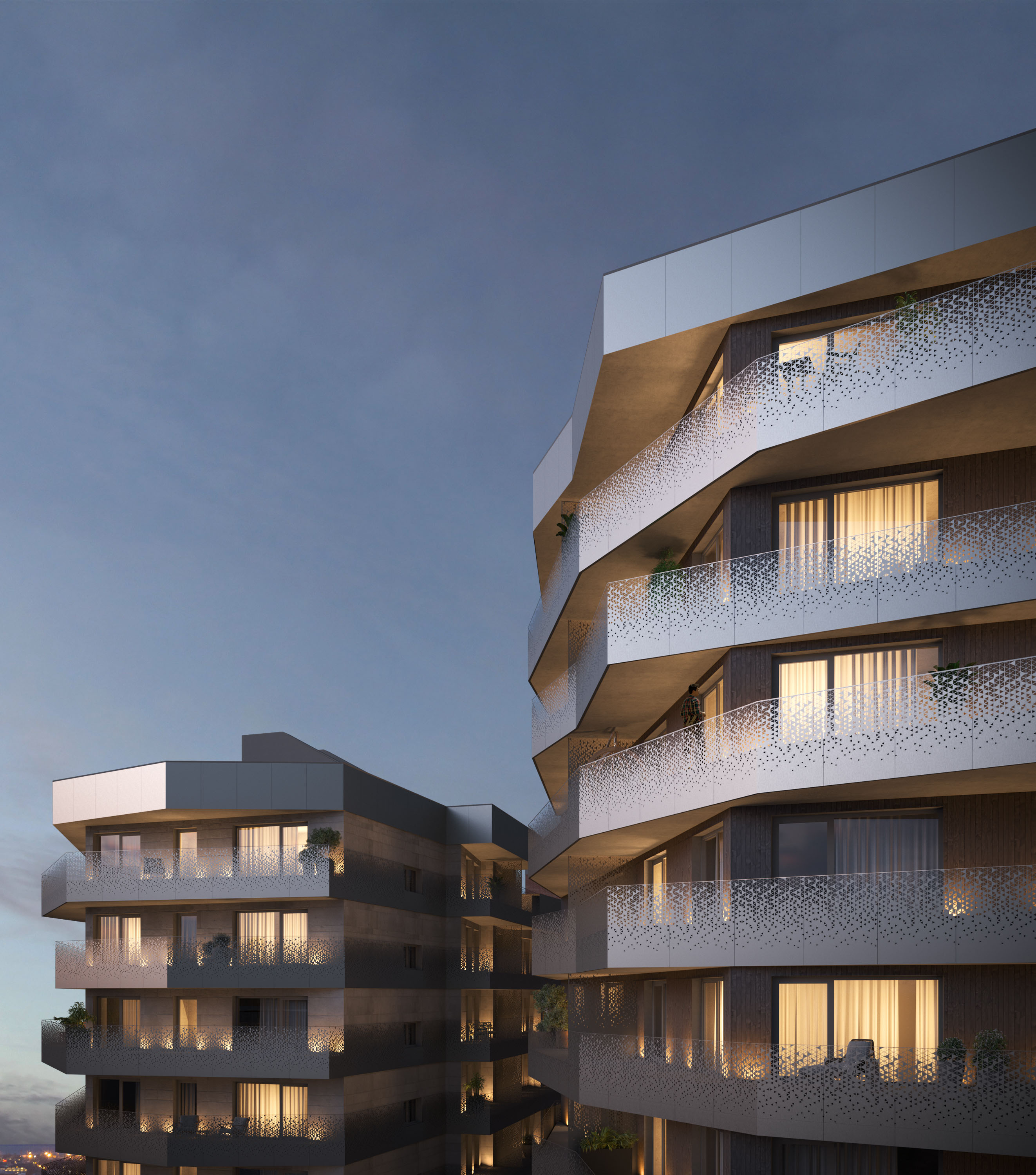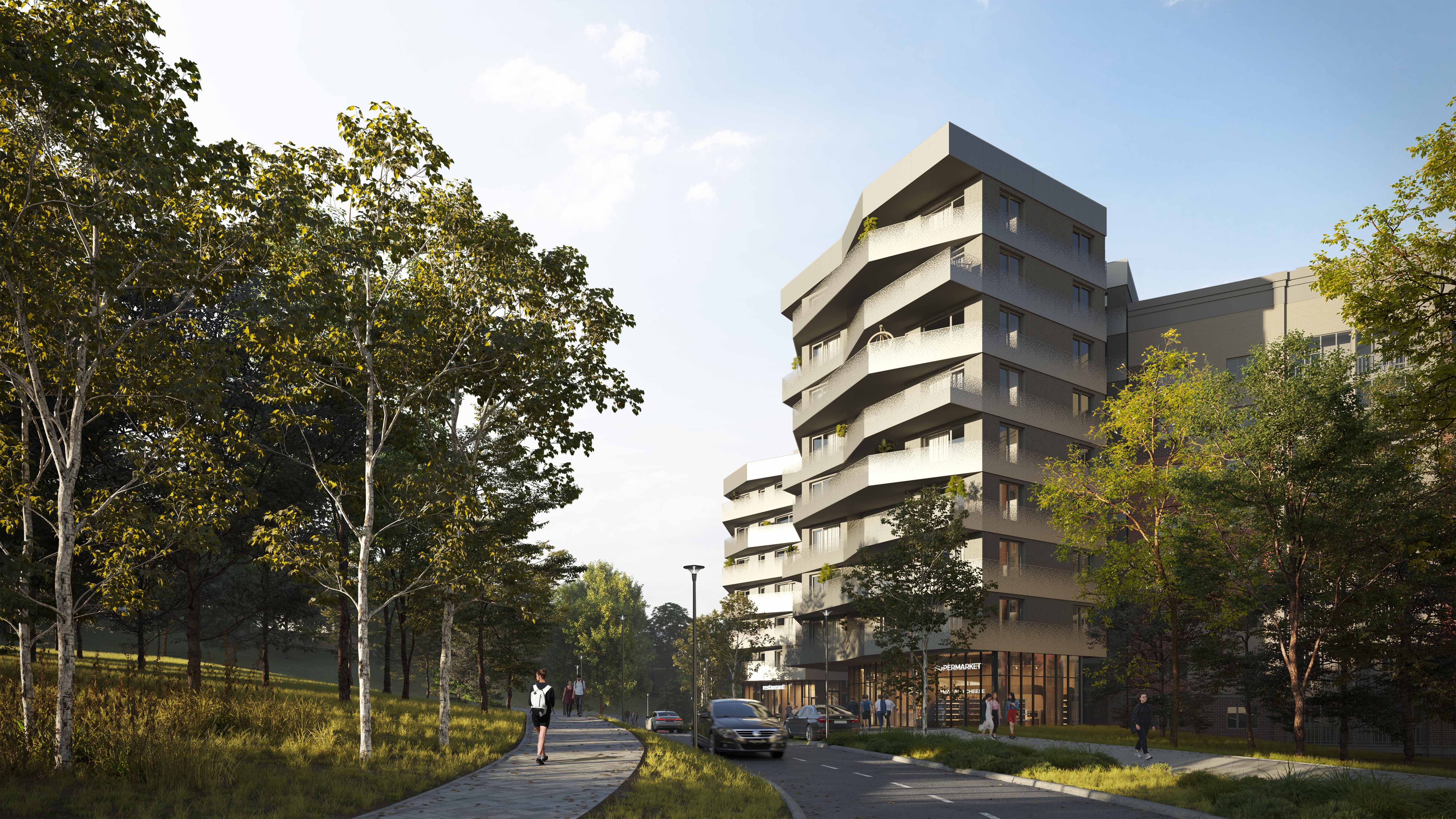 The facade solutions are expressive and contrasting, their composition is based on protruding terraces and balconies, the fencing of which will be finished with aluminum composite panels with perforations, which will distinguish the complex from other buildings.