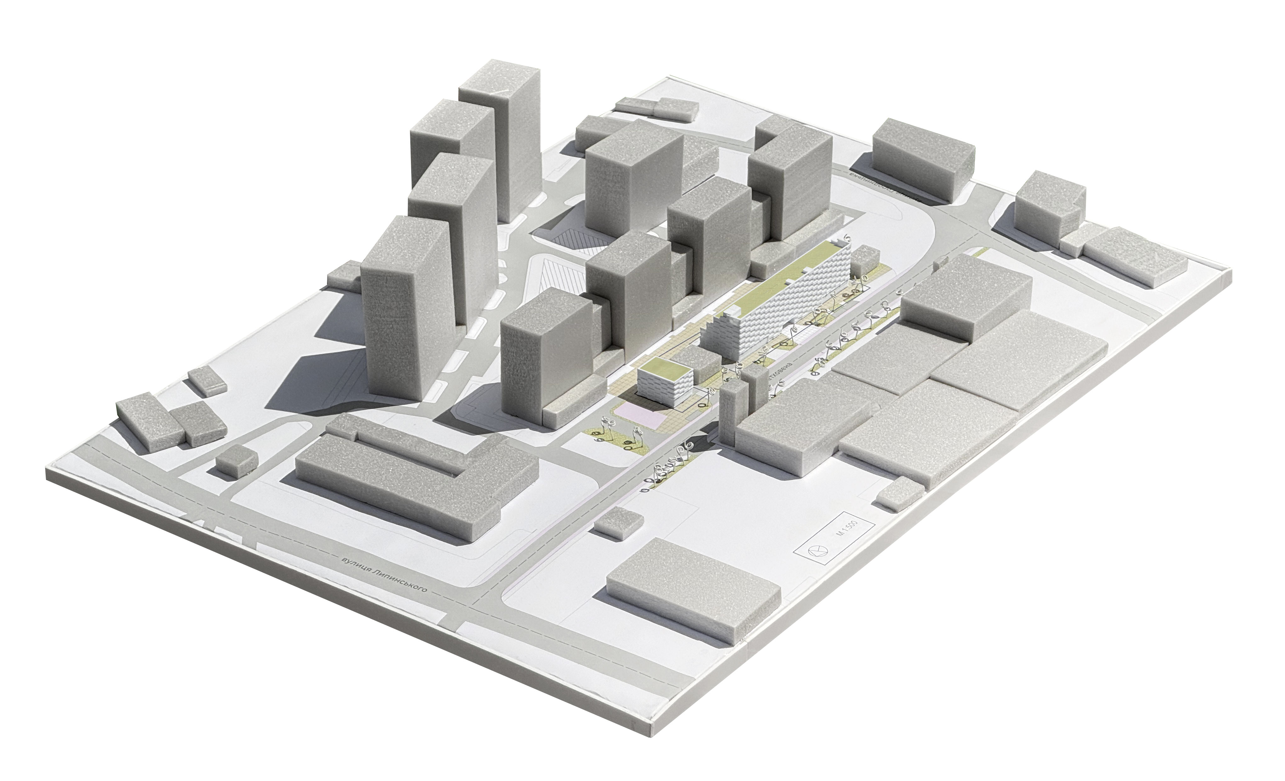 У процесі пошуку об’ємно-просторової композиції ключову роль відіграв фізичний макет, створений на ранньому етапі проєктування. Саме він дозволив наочно оцінити масштаб майбутньої будівлі в контексті навколишньої забудови та визначити найбільш збалансовану просторову конфігурацію. Завдяки роботі з макетом було знайдено оптимальне вирішення загального об’єму, а також прийнято рішення про терасованість, та екстенсивне озеленення поверхів — що забезпечує як пом’якшення силуету, так і формування додаткових відкритих просторів для користувачів будівлі.