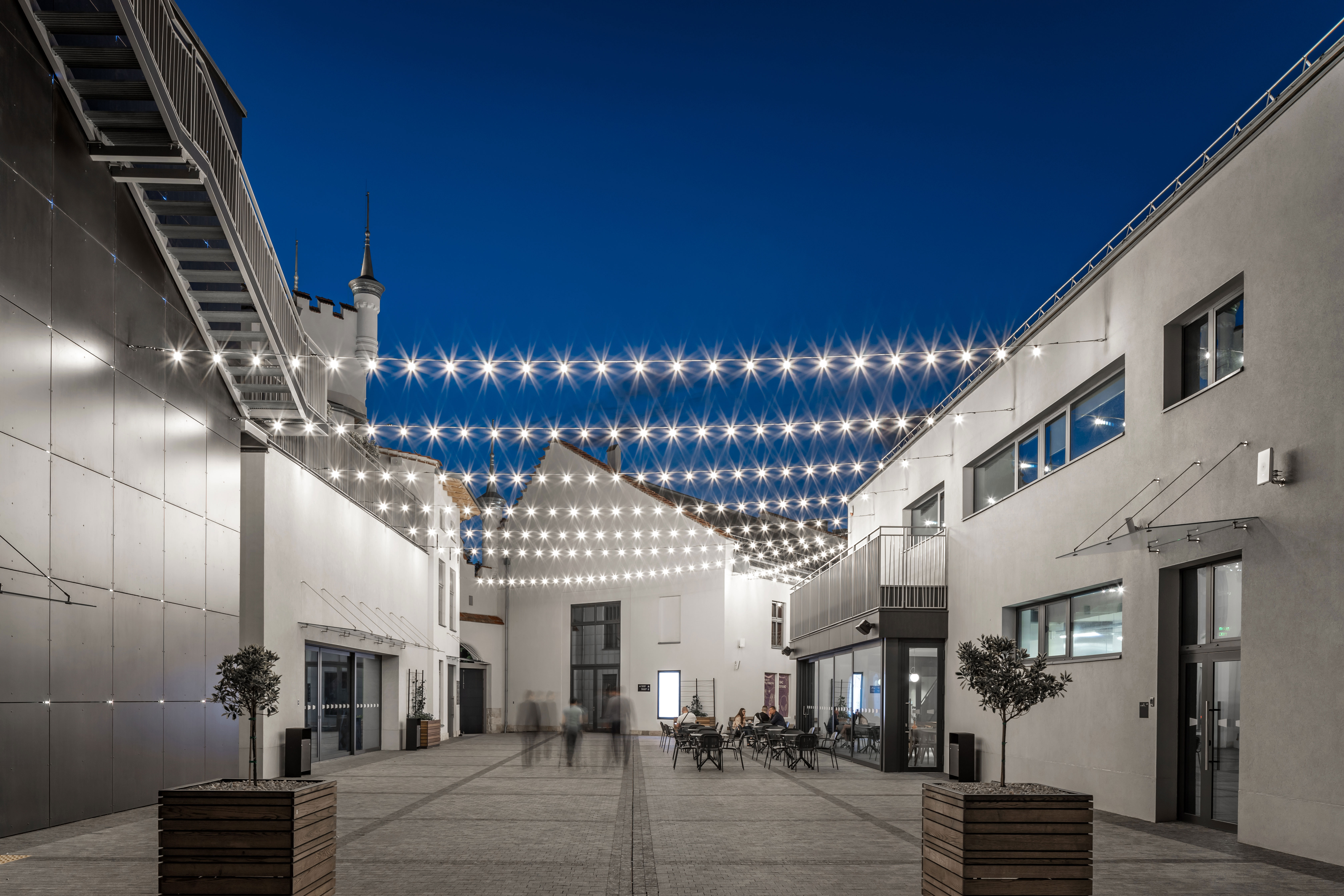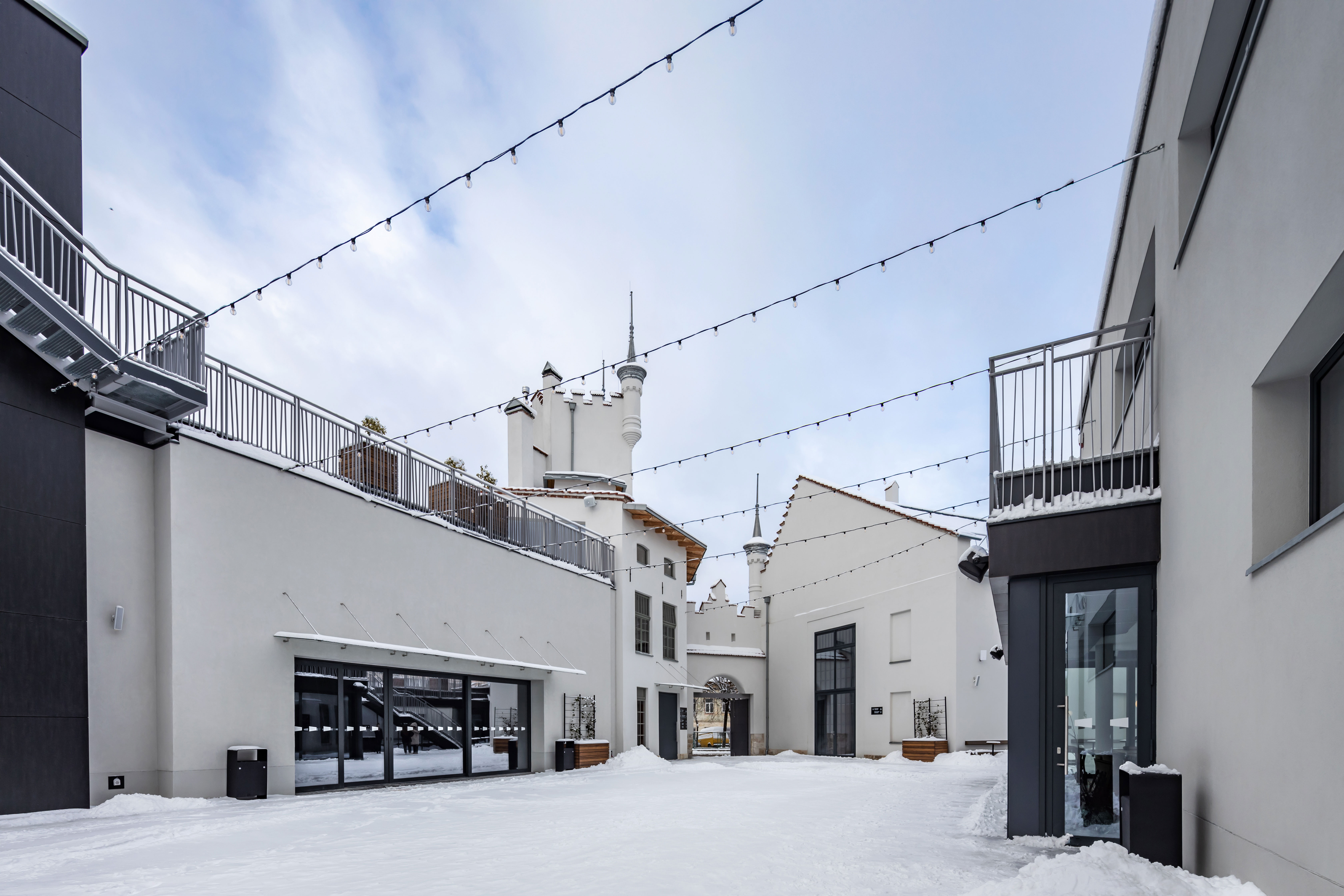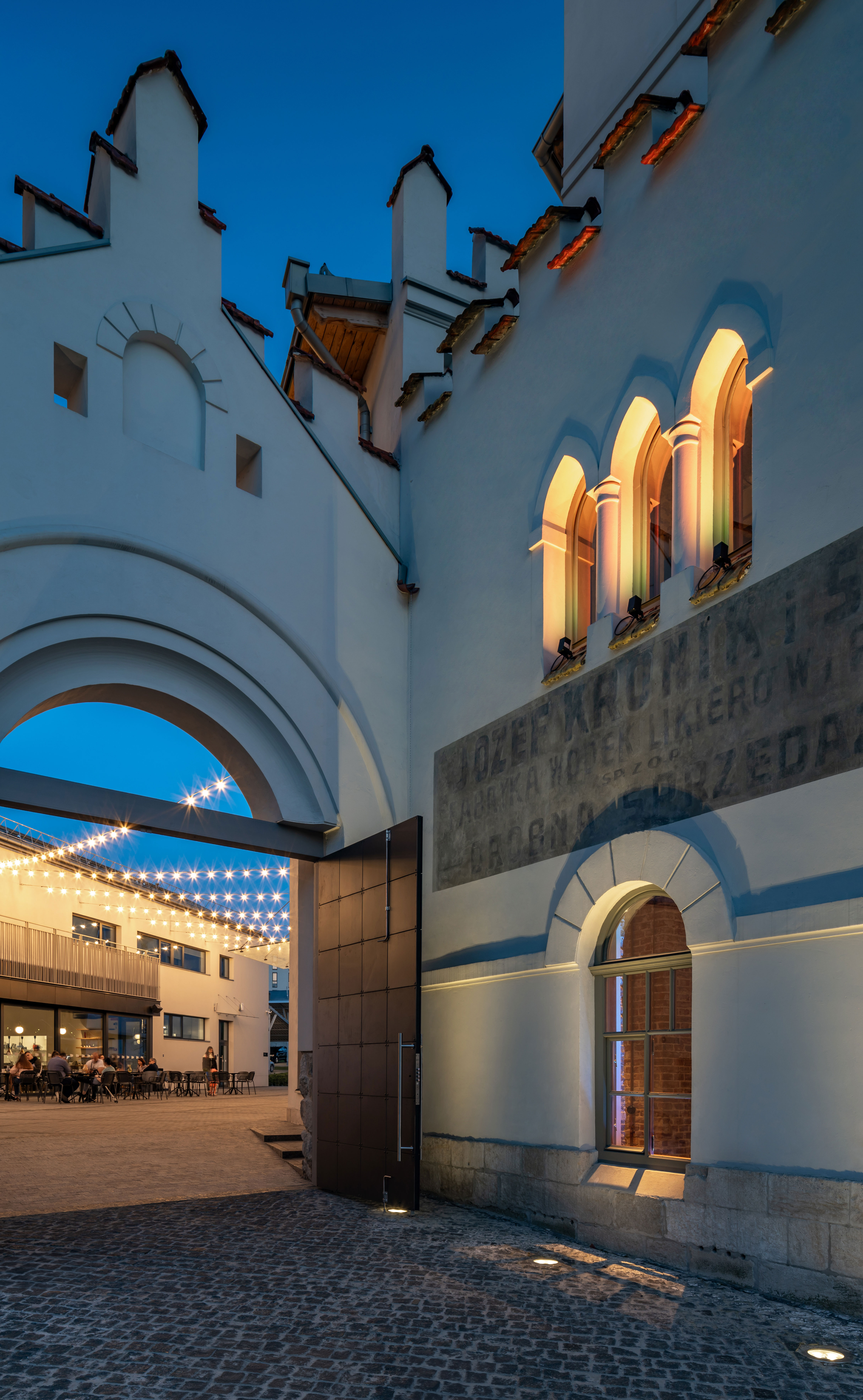 The historic structure of the former Josef Kronik and Son distillery was preserved, while various spaces were adapted for cultural use. The Neo-Gothic tower, likely a private residence built around 1910, now houses relaxation areas, a small exhibition, and a shop. Former production and administrative areas have been transformed into zones for exhibitions, theater, music, administration, and a café-restaurant.
