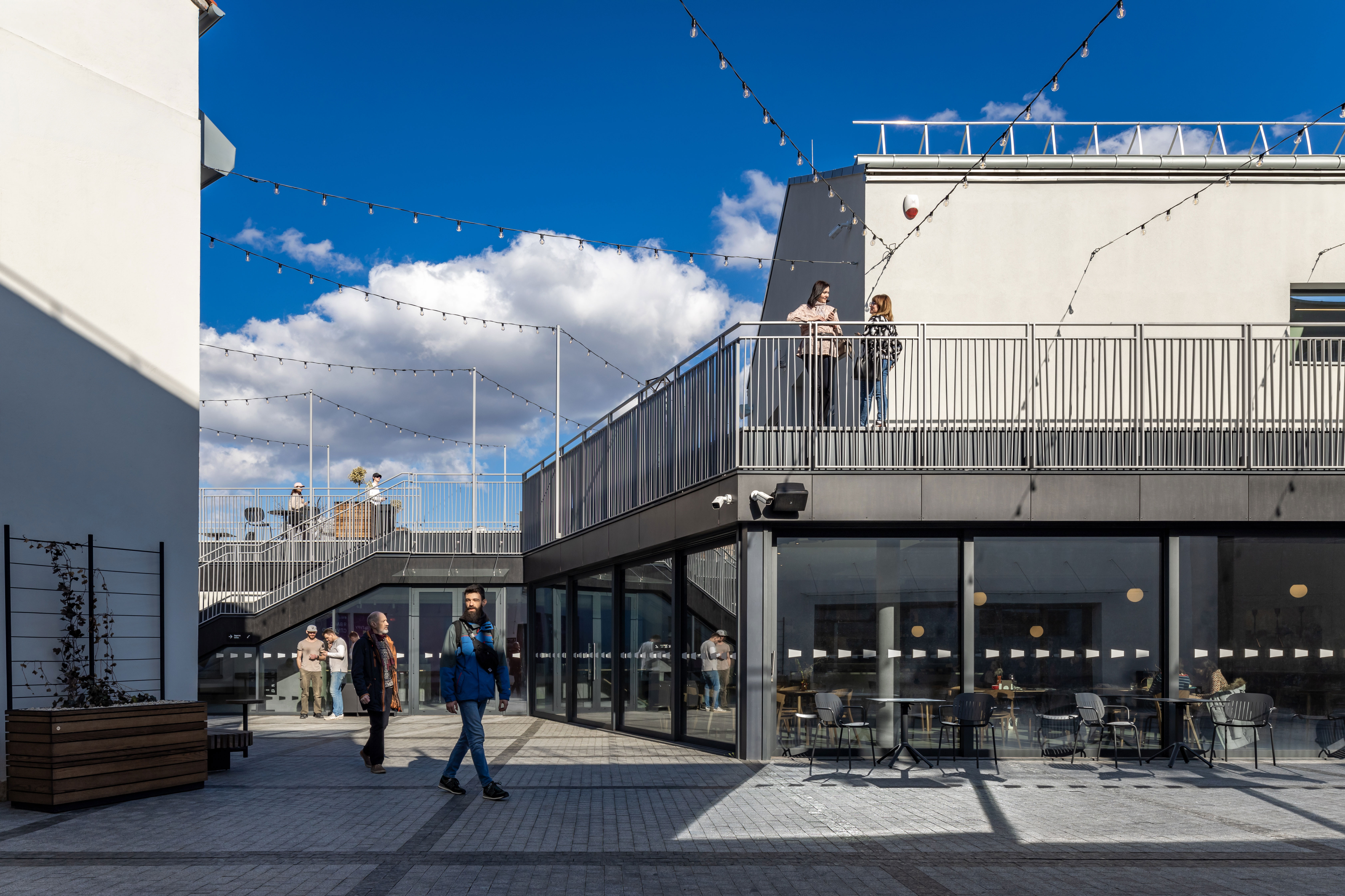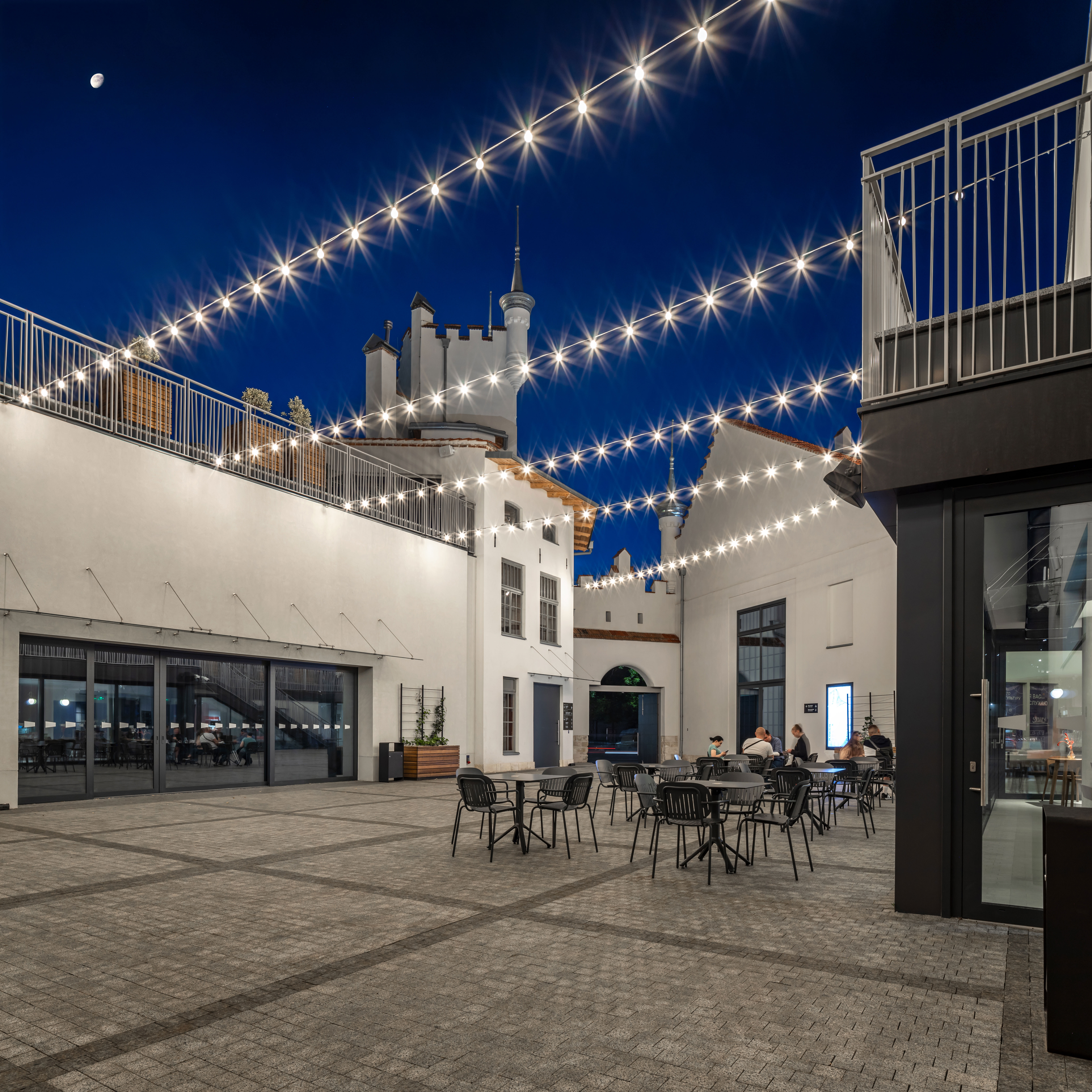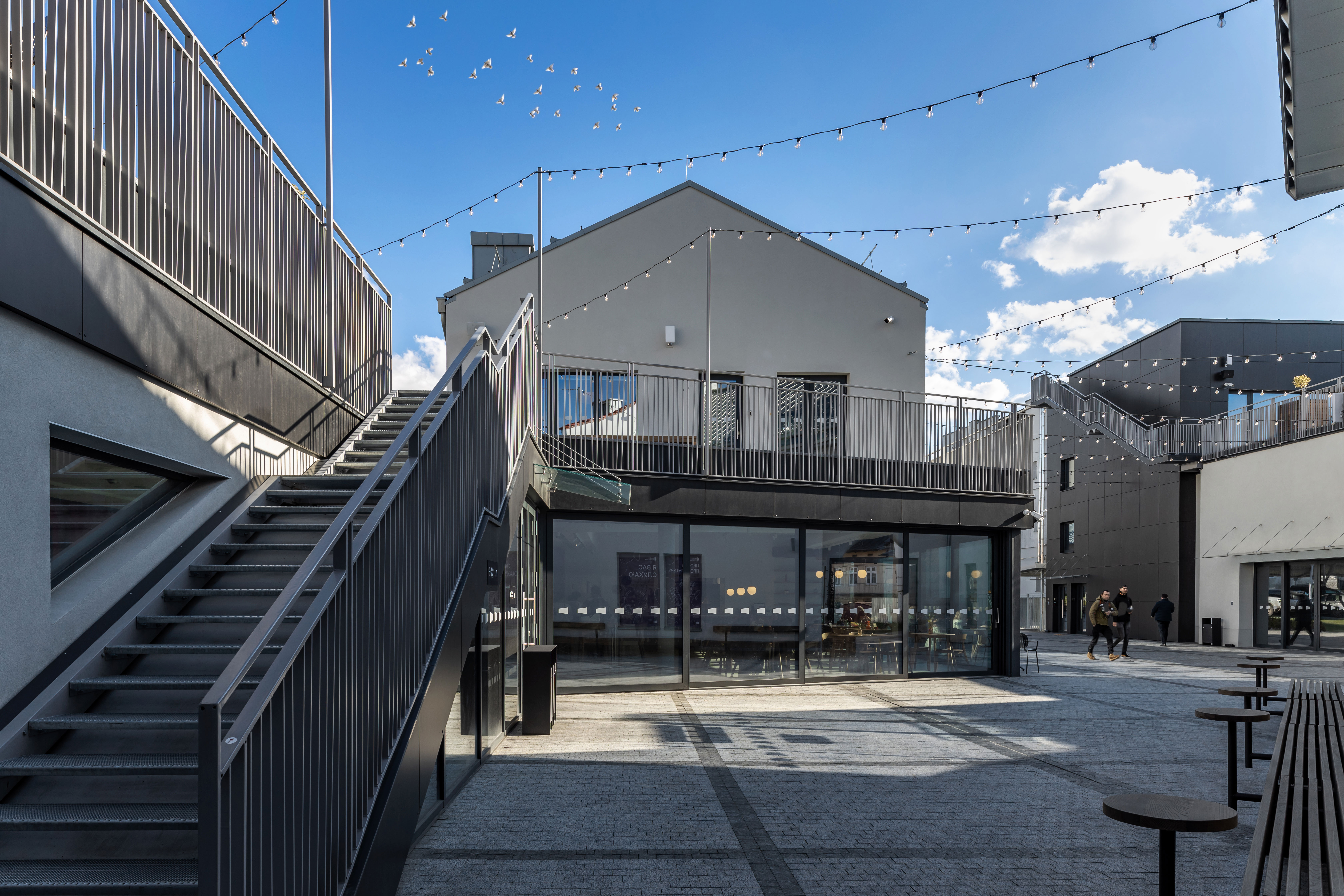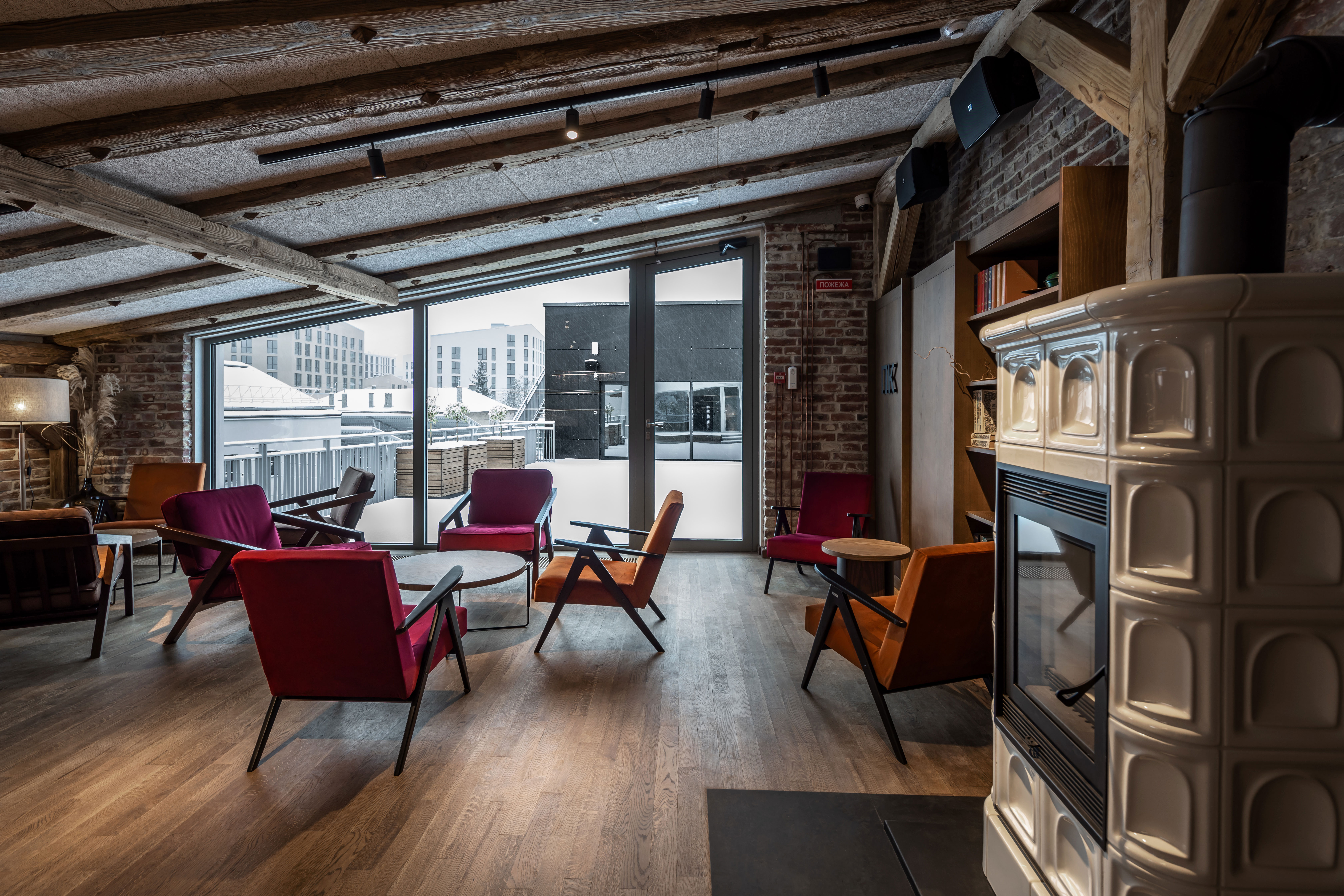 The historic structure of the former Josef Kronik and Son distillery was preserved, while various spaces were adapted for cultural use. The Neo-Gothic tower, likely a private residence built around 1910, now houses relaxation areas, a small exhibition, and a shop. Former production and administrative areas have been transformed into zones for exhibitions, theater, music, administration, and a café-restaurant.