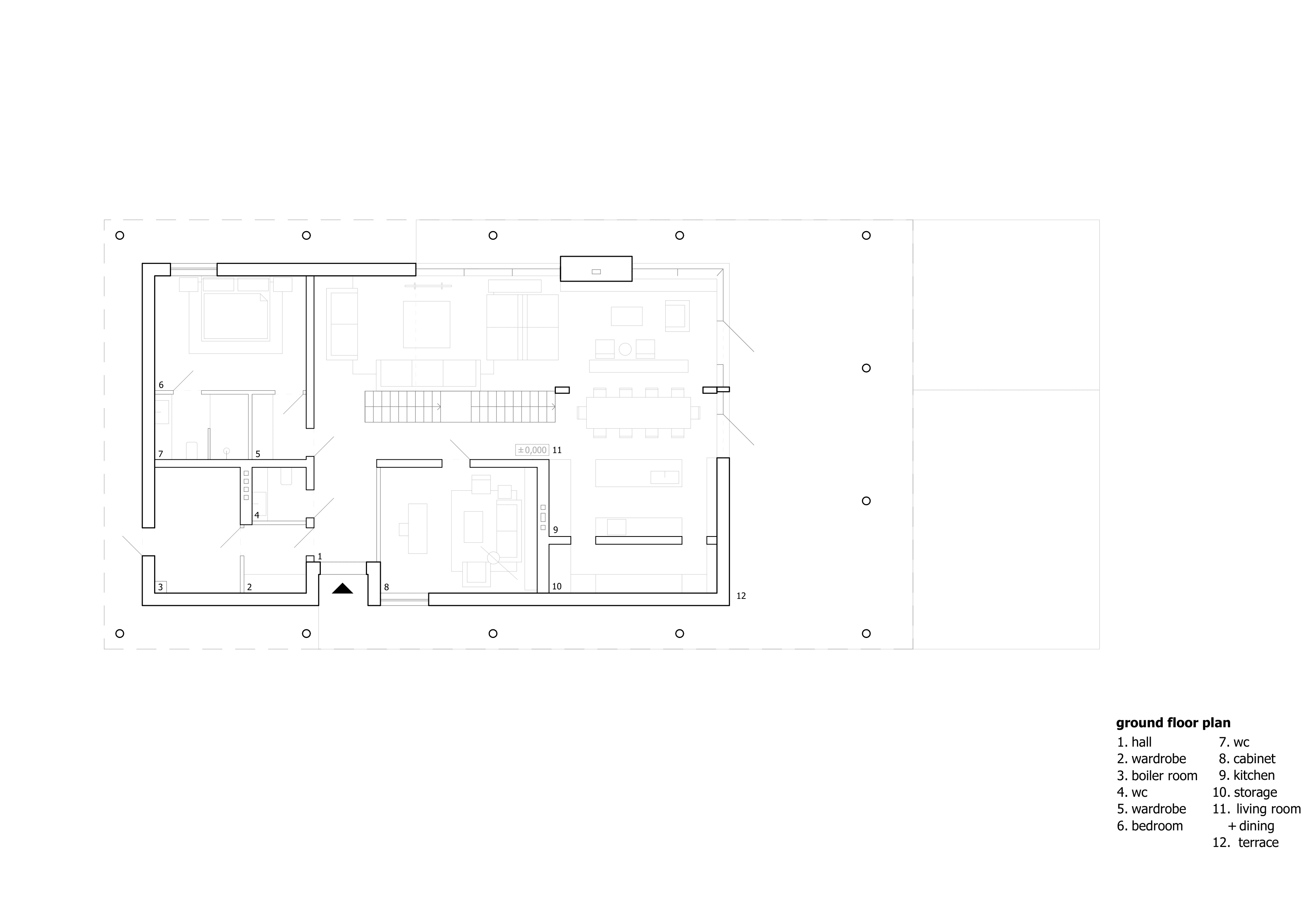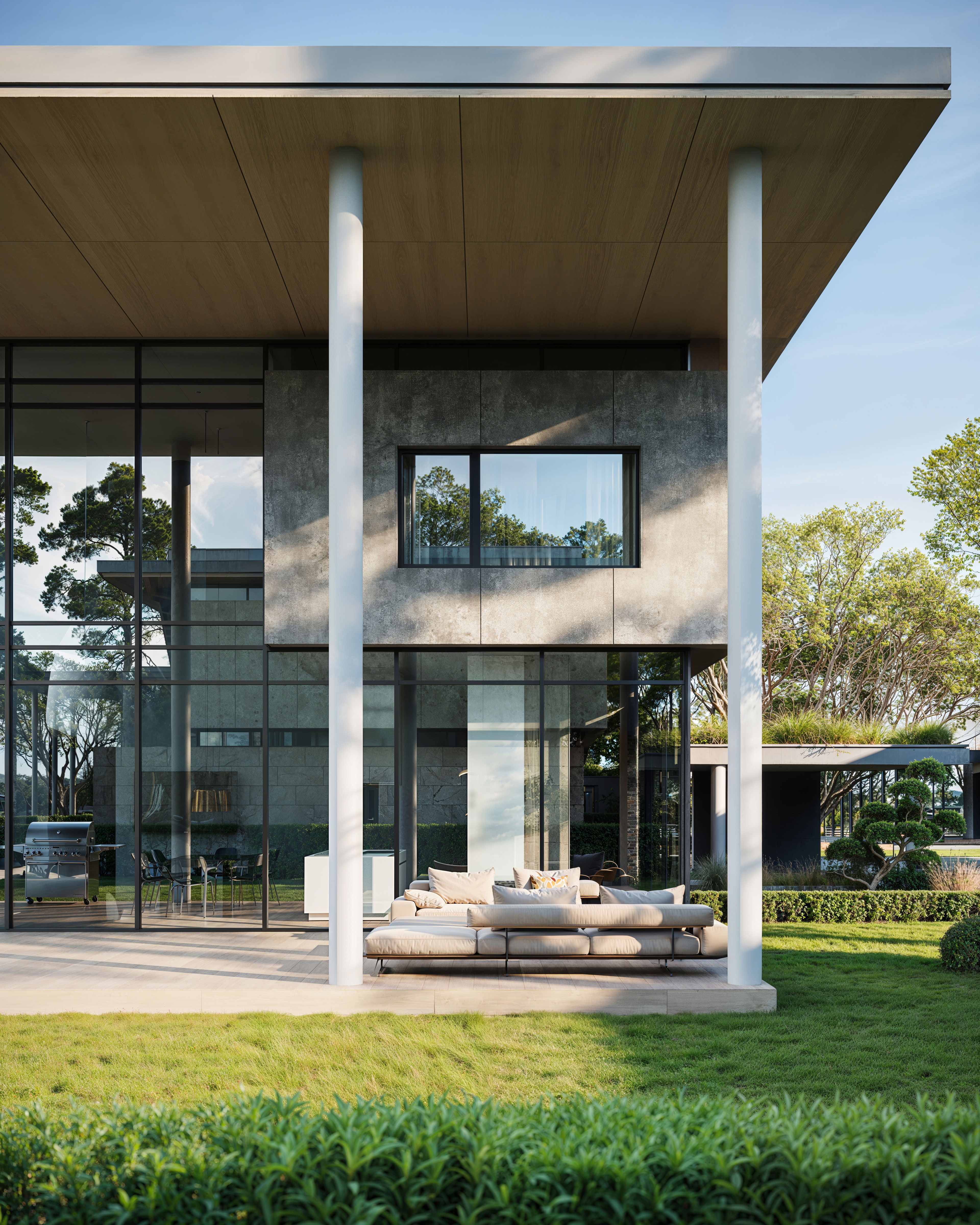 The house is conceived as a space for everyday scenarios – from a morning connection with nature on the terrace to evening retreat within a sheltered interior. Clean, restrained volumes with a pronounced horizontal roofline create a sense of lightness, while the slender columns beneath the roof appear to float, simultaneously serving a technical function: rainwater downpipes are concealed within them, preserving the clarity of the building’s silhouette and its overall elegance.