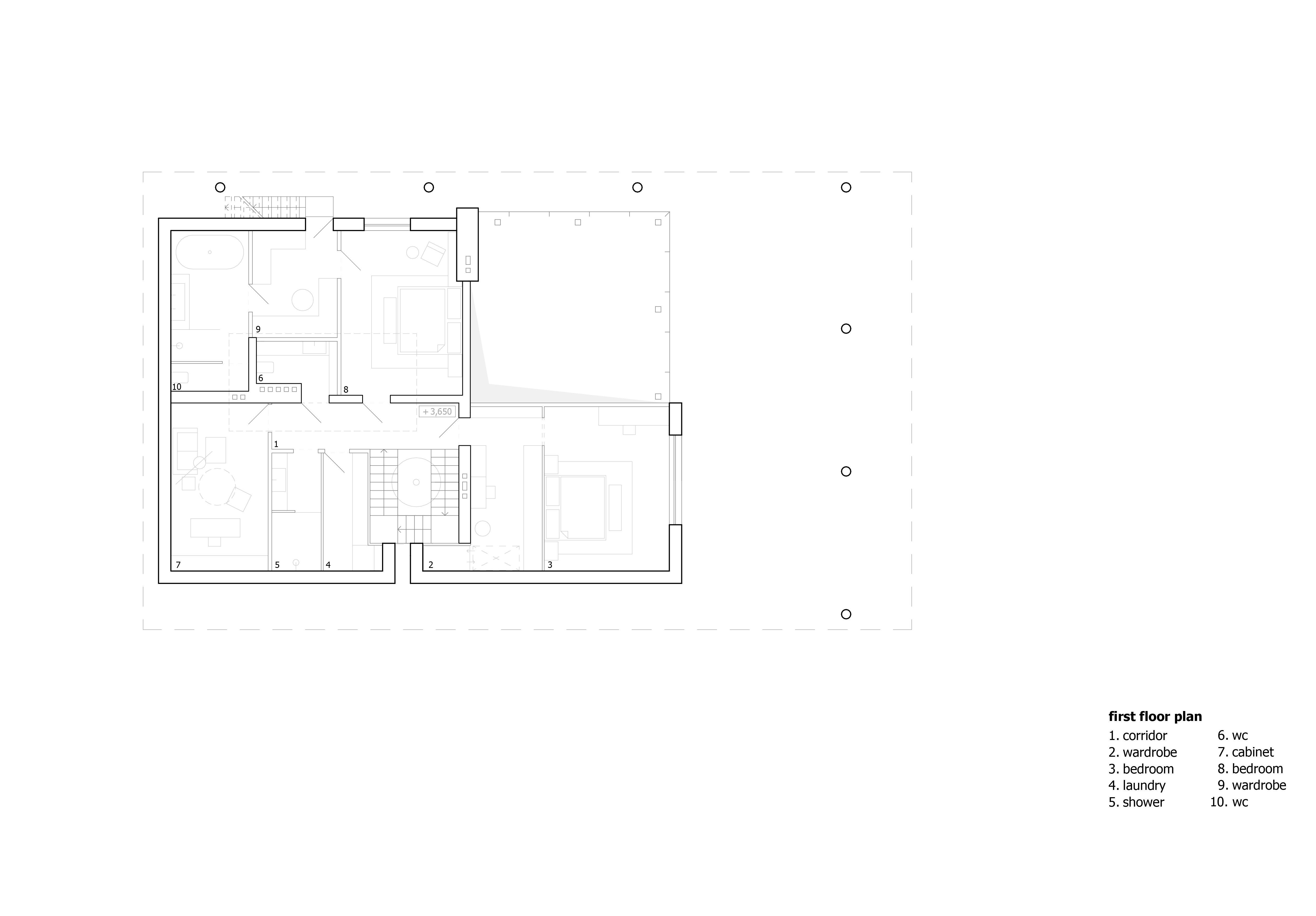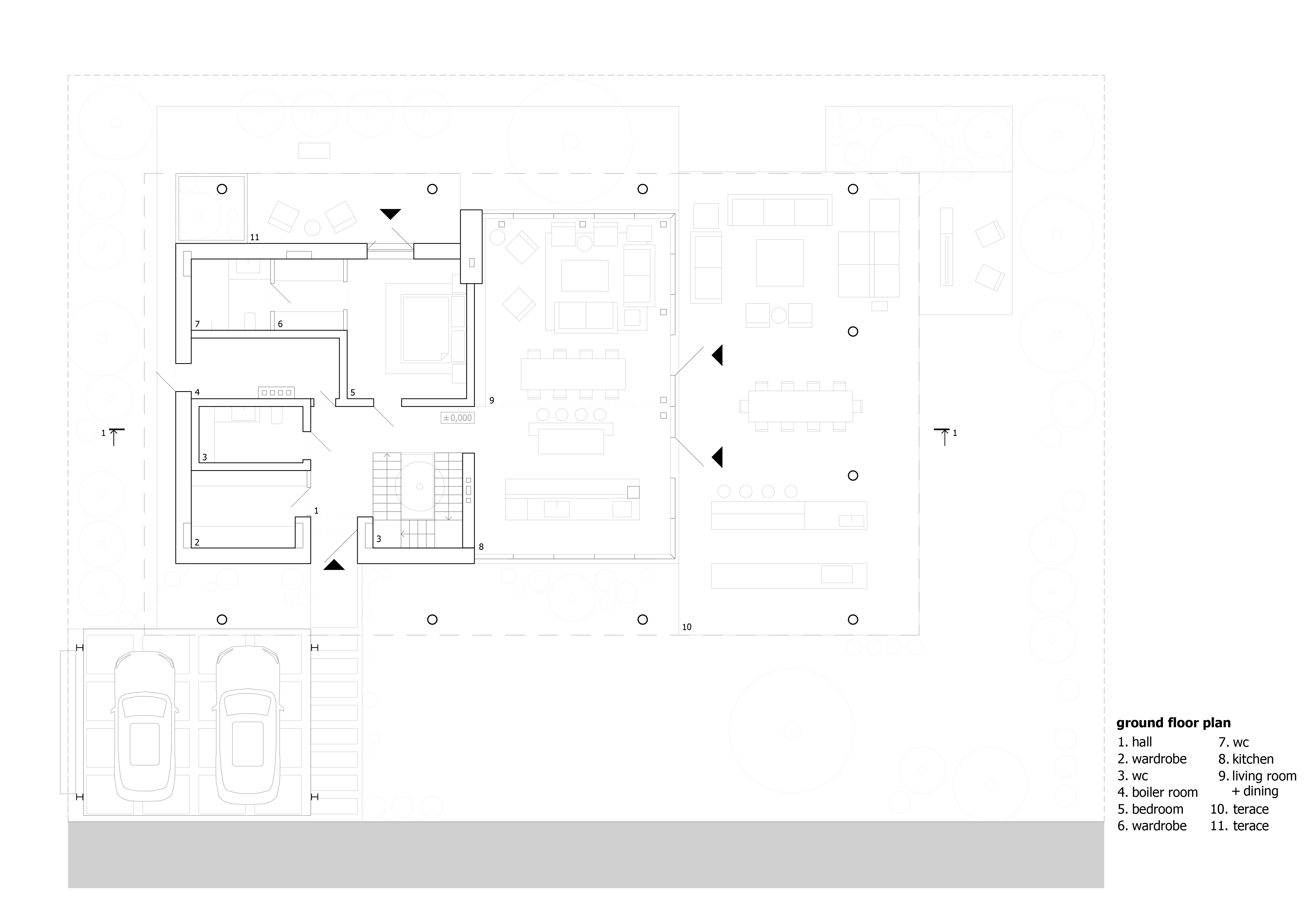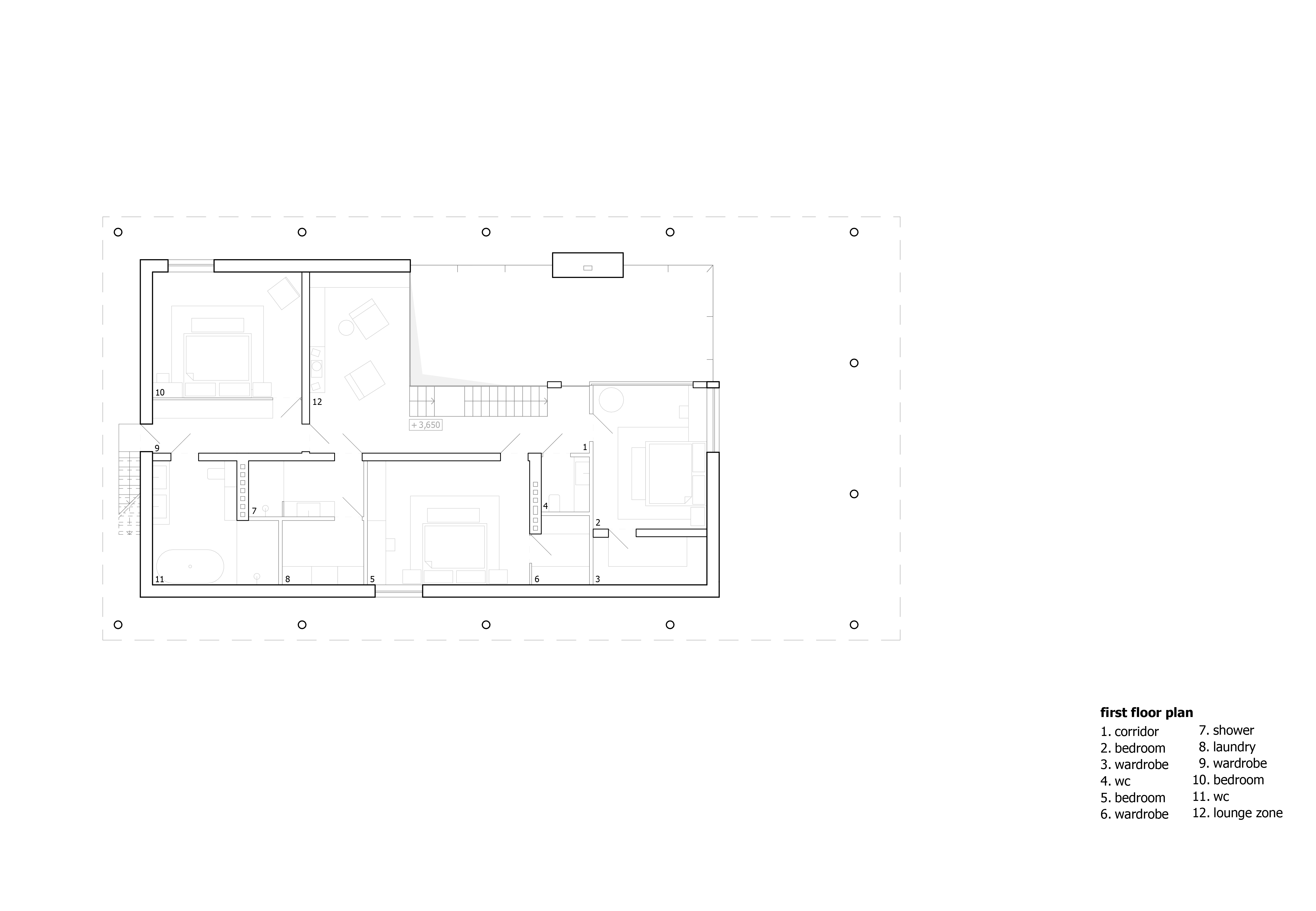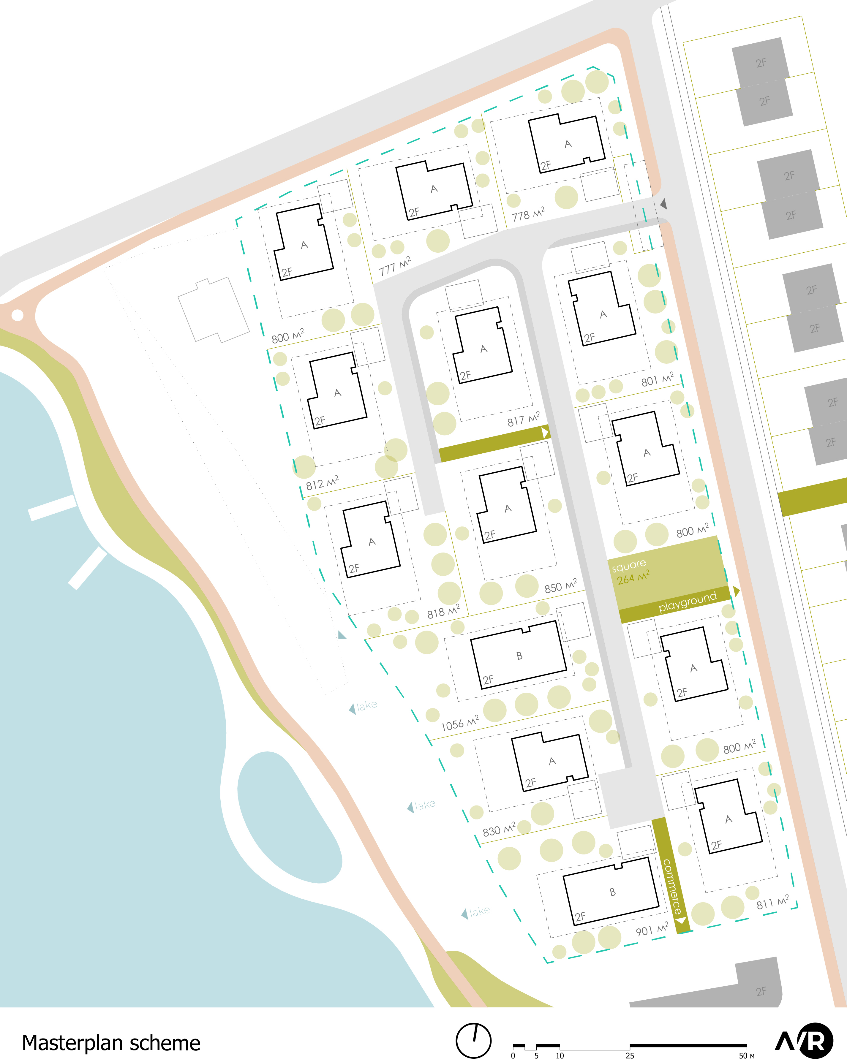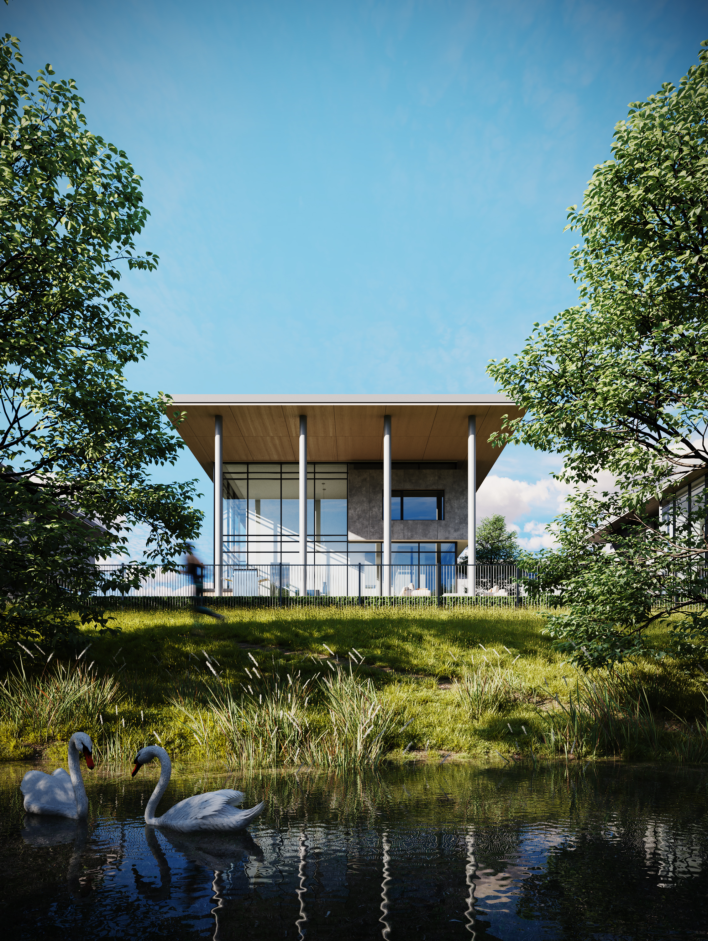 The spatial structure is conceived as a sequence of layers with gradually shifting degrees of openness and privacy. Closer to the entrance, the architecture creates a sense of protection; in the central area, the space becomes more open; while the deeper zone near the lake offers room for individual scenarios and a stronger connection to nature.