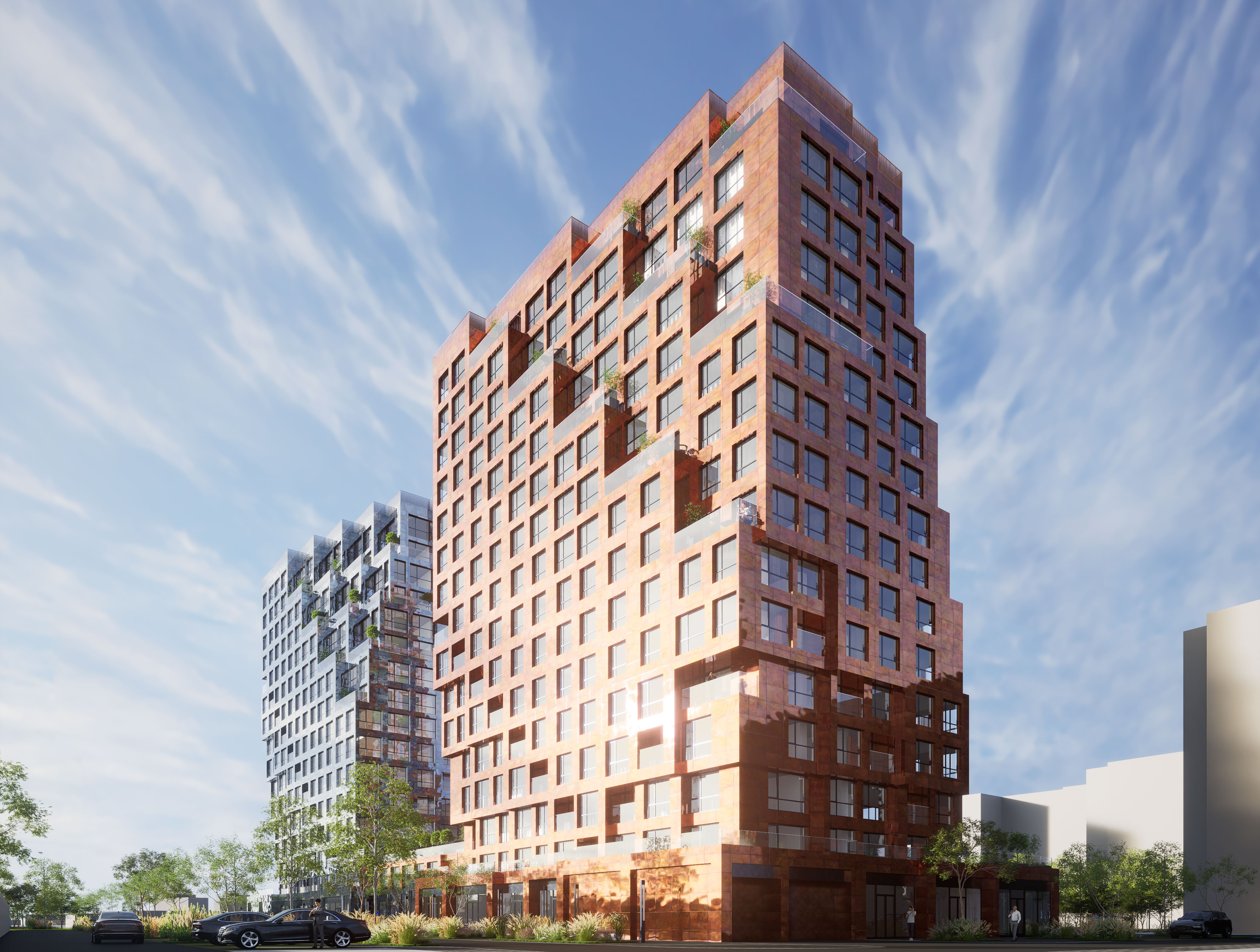 The following were proposed as finishing materials use two types of aluminum composite panels for each of the towers, which are mono-material facings: warm copper and cold chrome colors, which in their contrasting combination create a bright ensemble image of the complex.