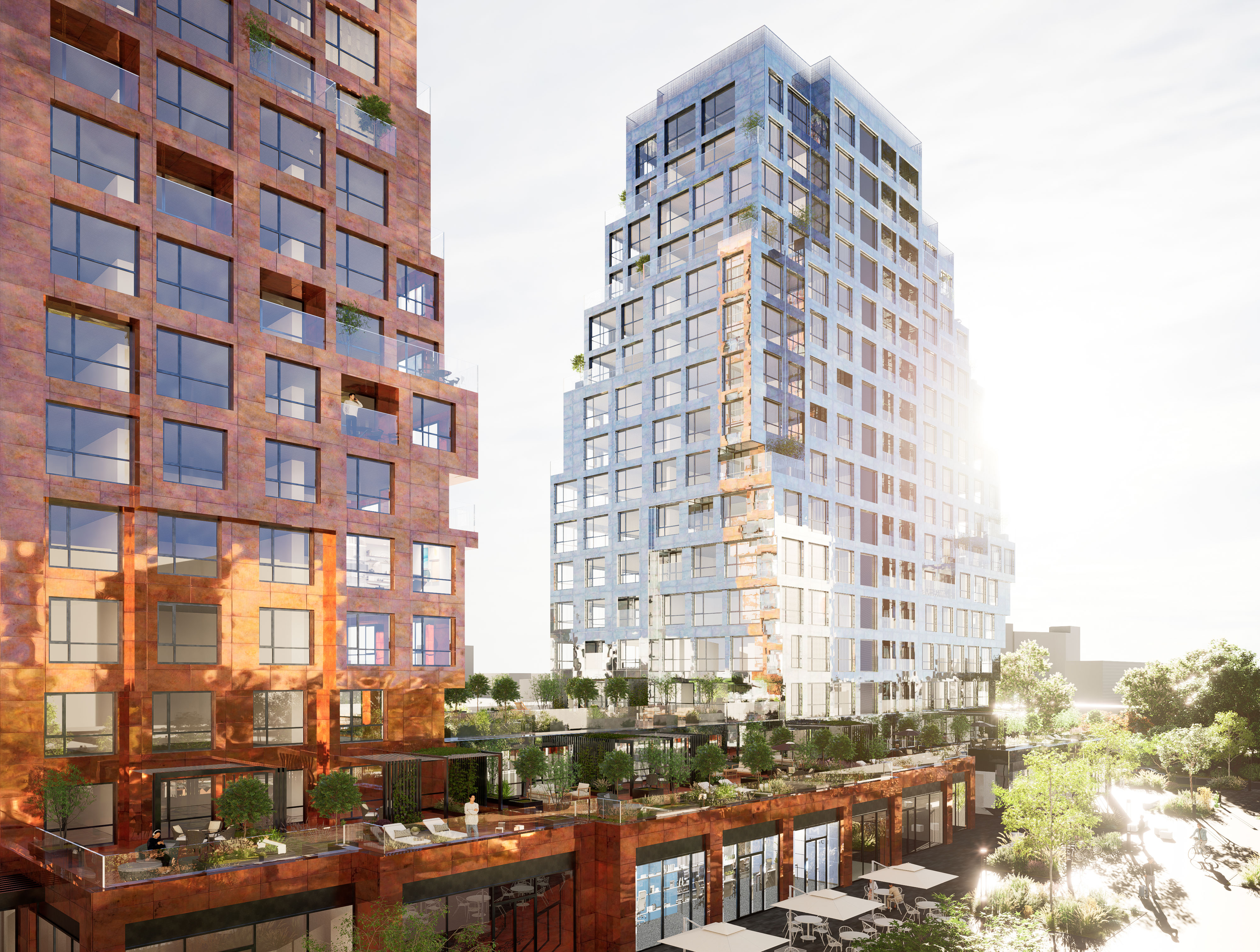 A square pedestrian square with with landscaping and amenities for residents, which is surrounded on all other sides surrounded by existing nine- and twelve-story buildings.
