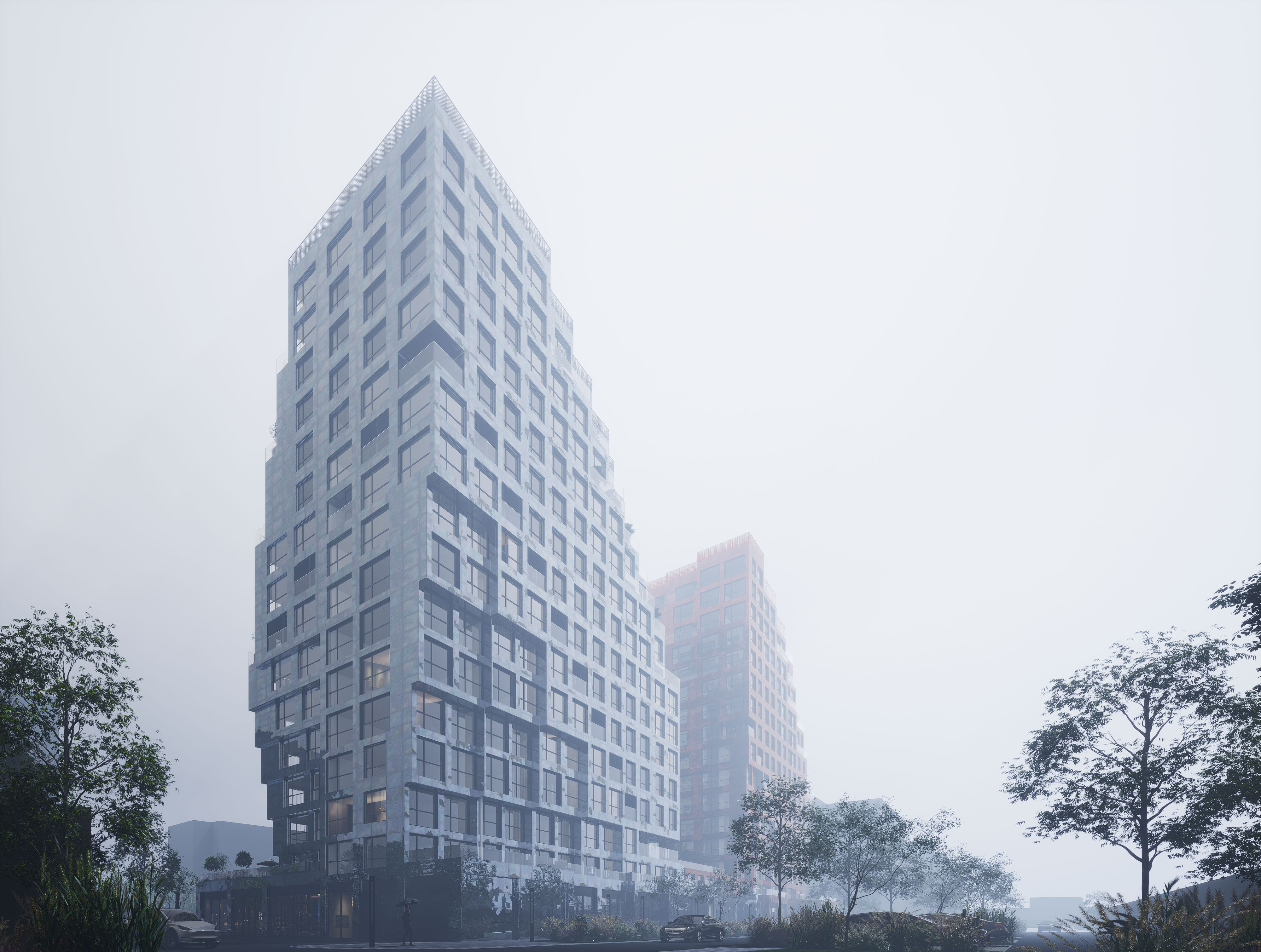 The facility consists of two sixteen-story towers united by one and two-level stylobate, which is filled with commercial premises.