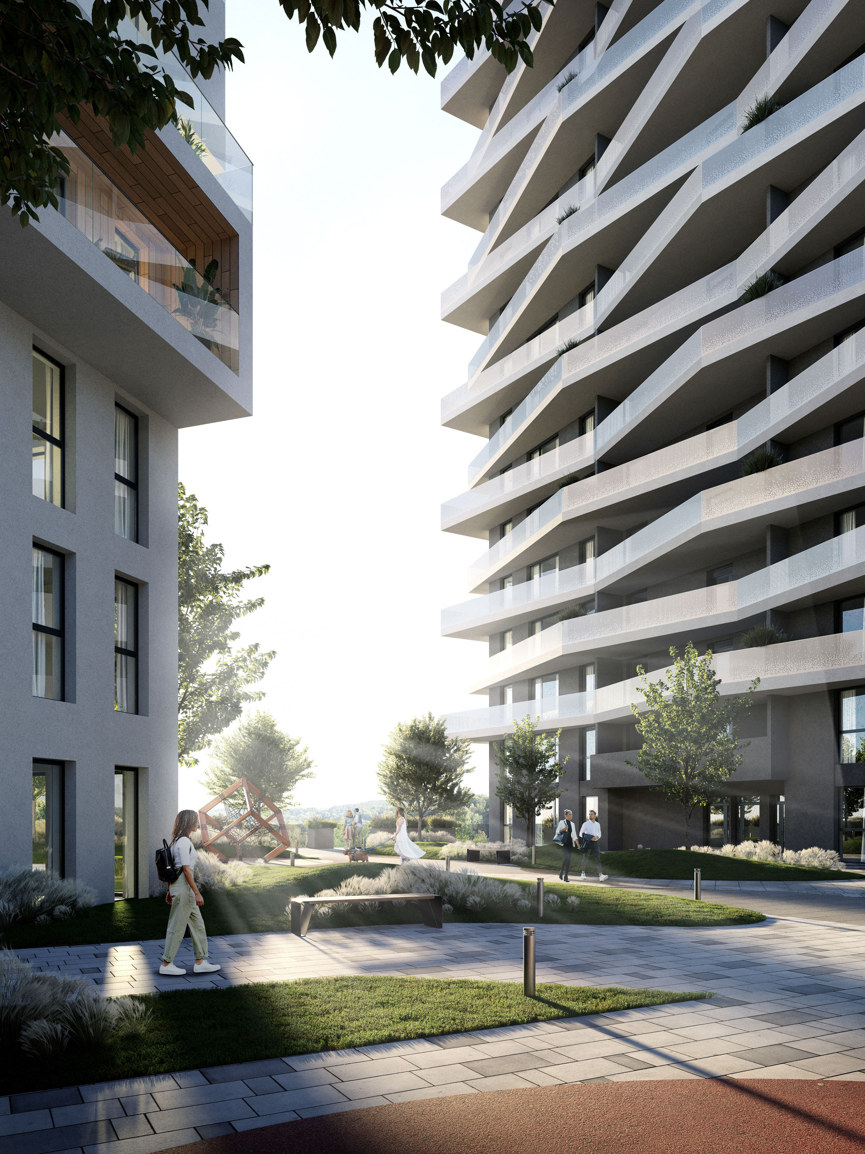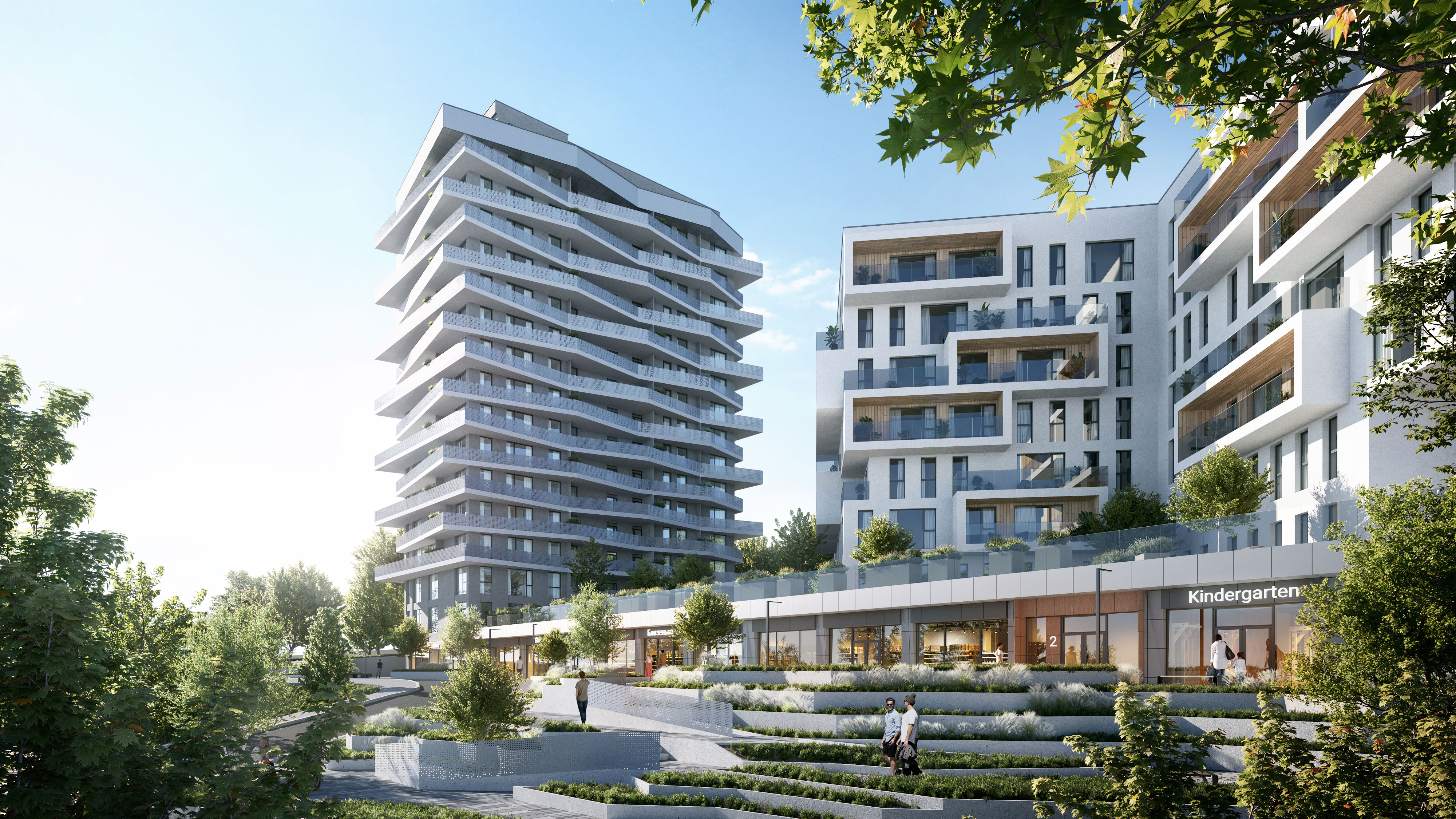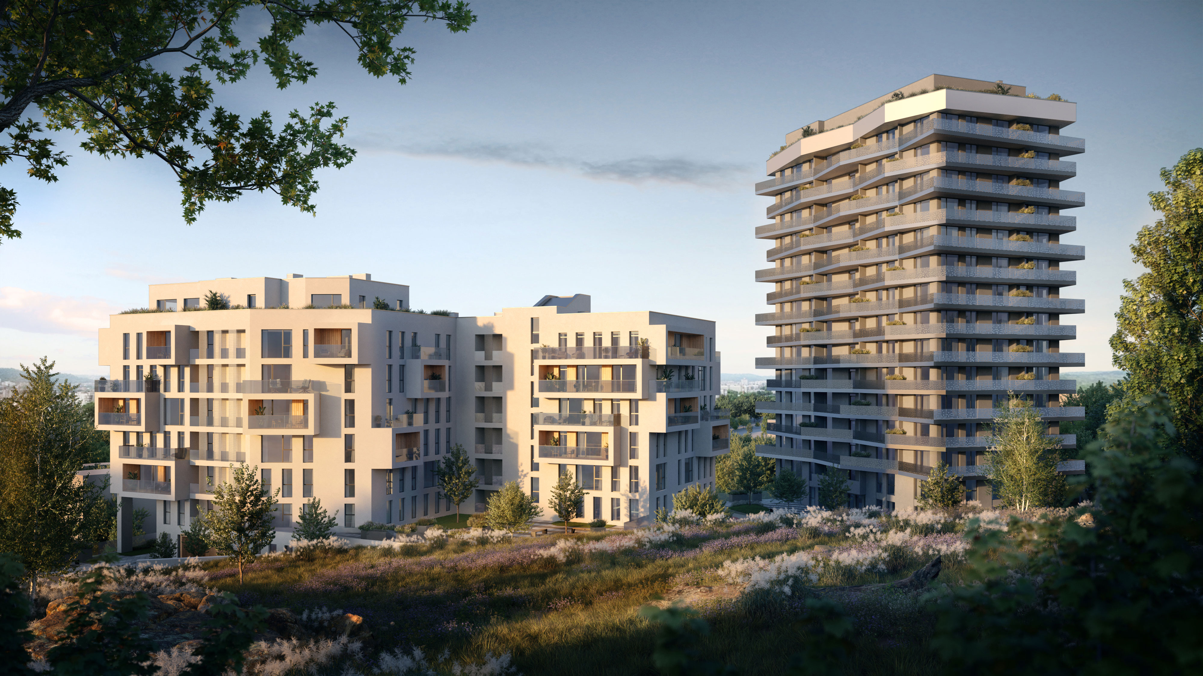 The plot of land with a mixed-use complex is located in a very green, relief and quiet location in the north of Lviv. The complex consists of three residential sections: two partially interconnected eight-storey buildings and a sixteen-storey building connected by a common stylobate containing public and commercial functions. The stylobate houses a cozy courtyard for residents with various playgrounds and landscaping.