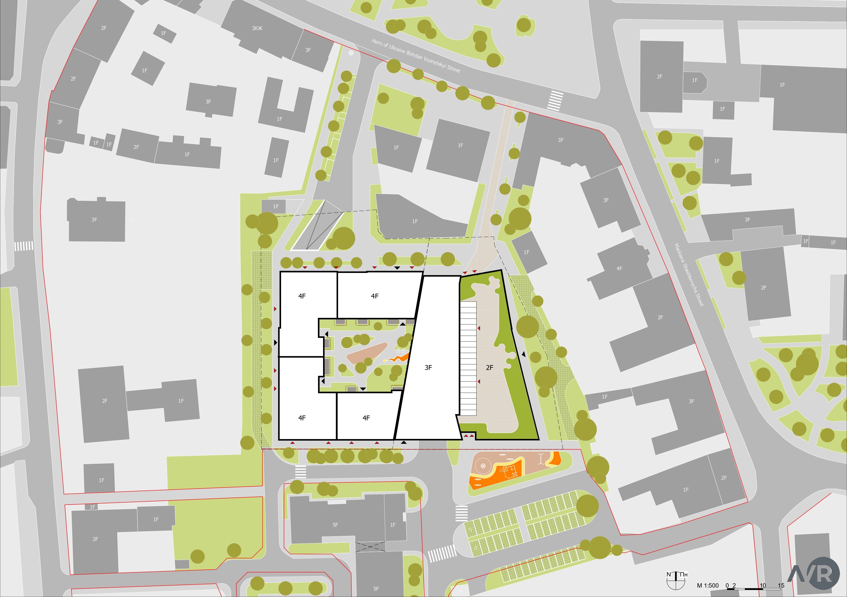 The mixed-use residential and commercial complex is located in the central part of Zolochiv – an area of active urban development. The project site borders key pedestrian and transport routes, ensuring convenient access to public institutions, schools, cultural facilities, and the city’s historic center.