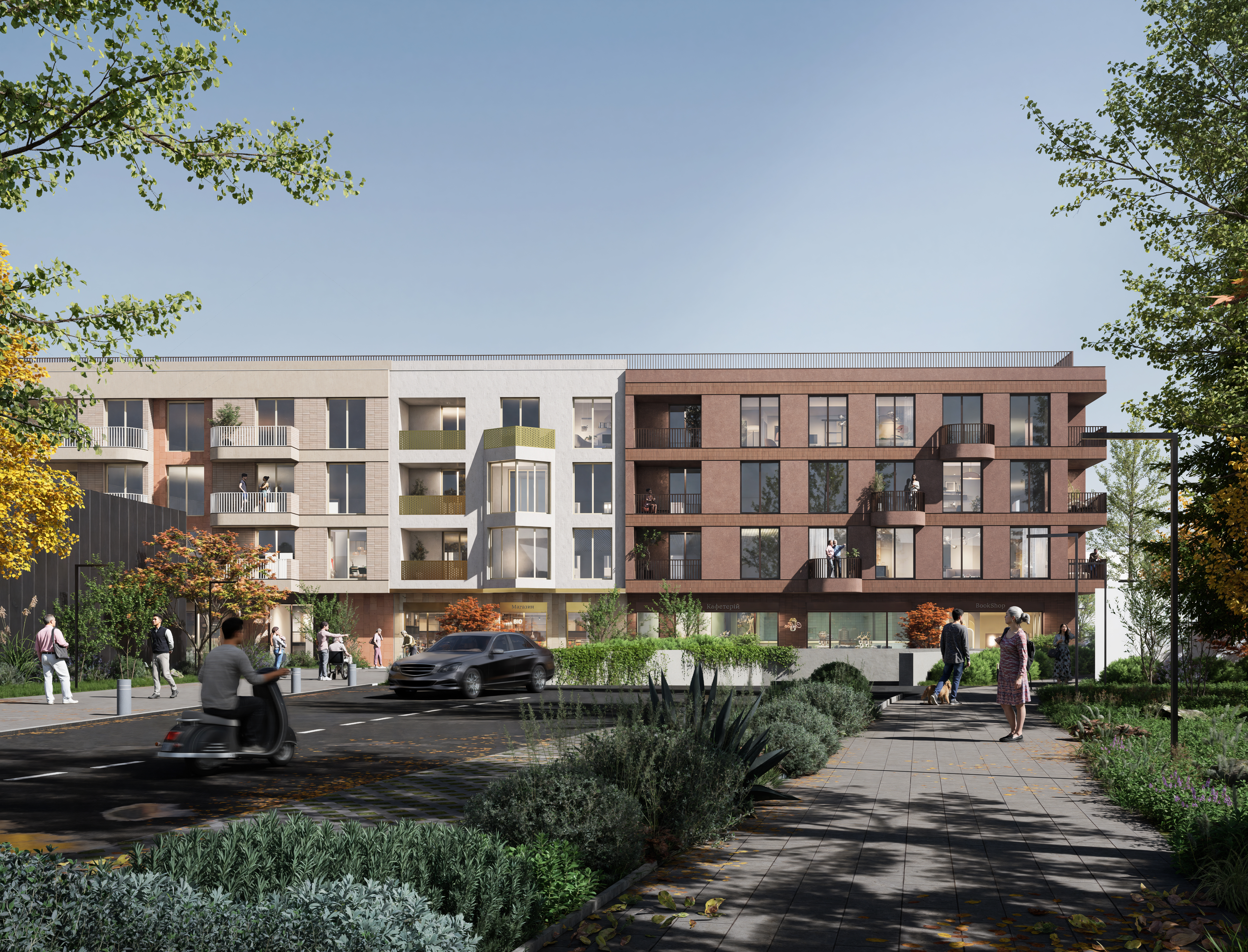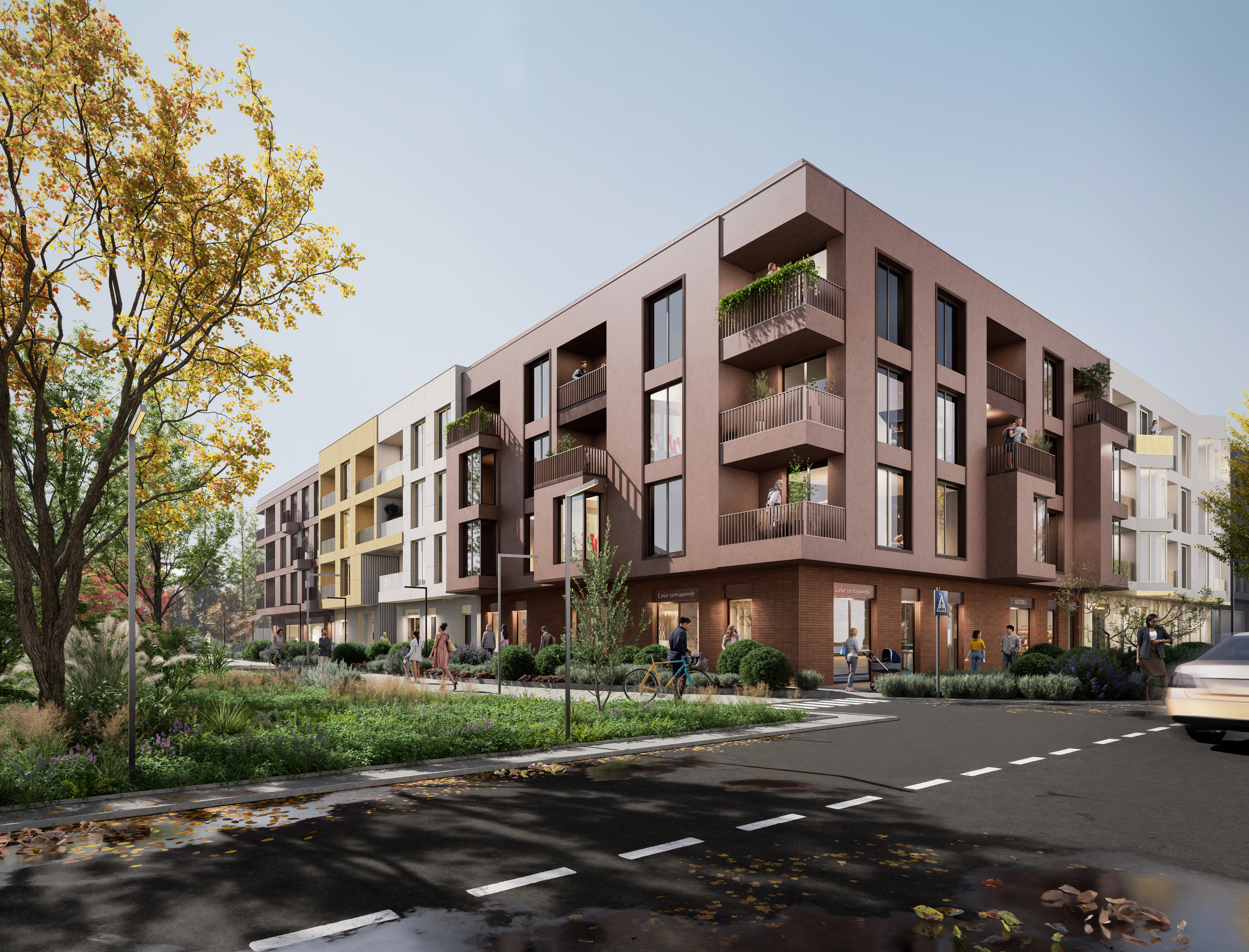 The site is formed within the existing urban fabric yet partially recessed into the block, adjoining mid-rise buildings from the 1990s. The low building height, underground parking, well-considered spatial layout, and articulated façade design give the project an intimate character, while the active ground floor with commercial spaces and the shopping center create a vibrant, livable urban environment.