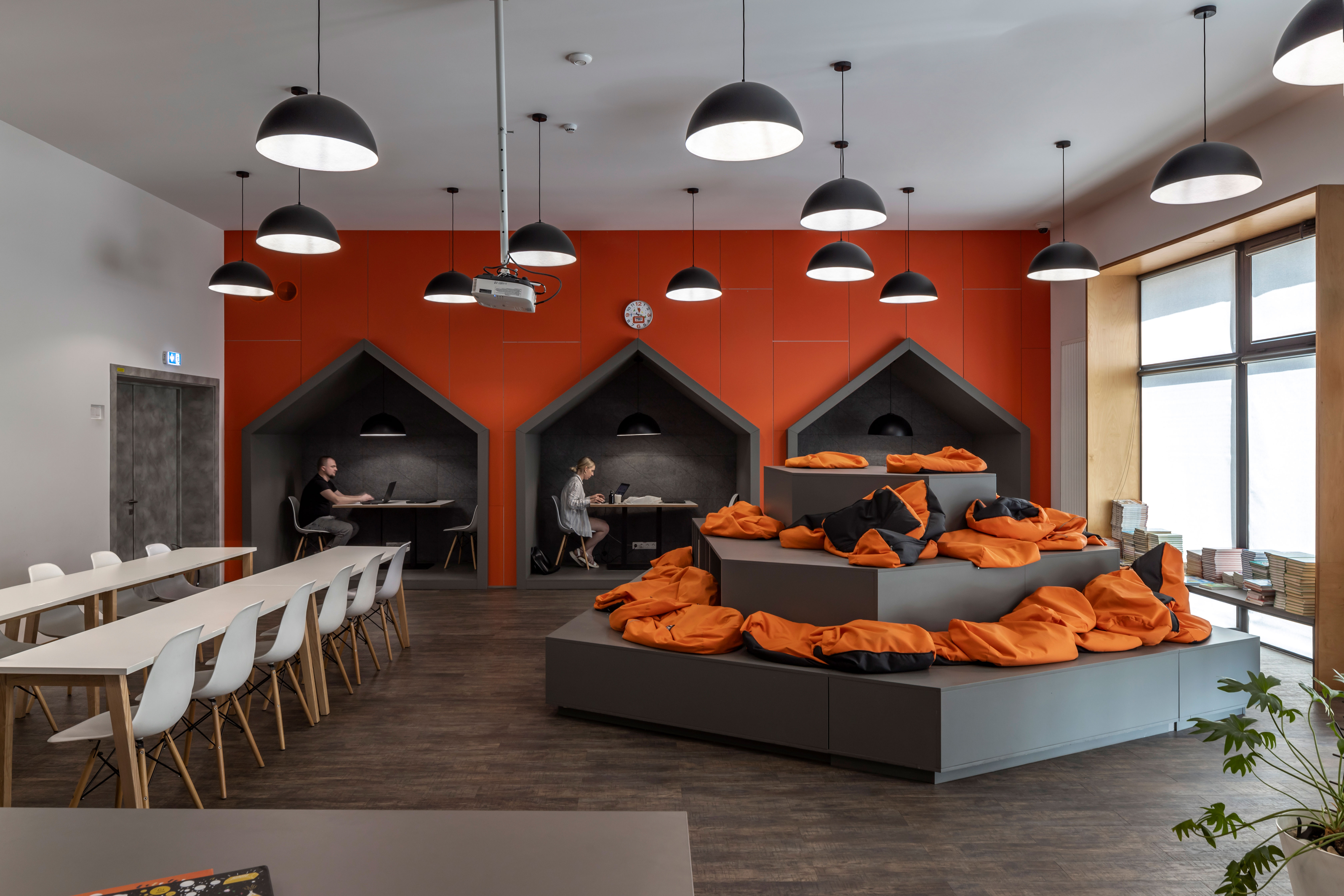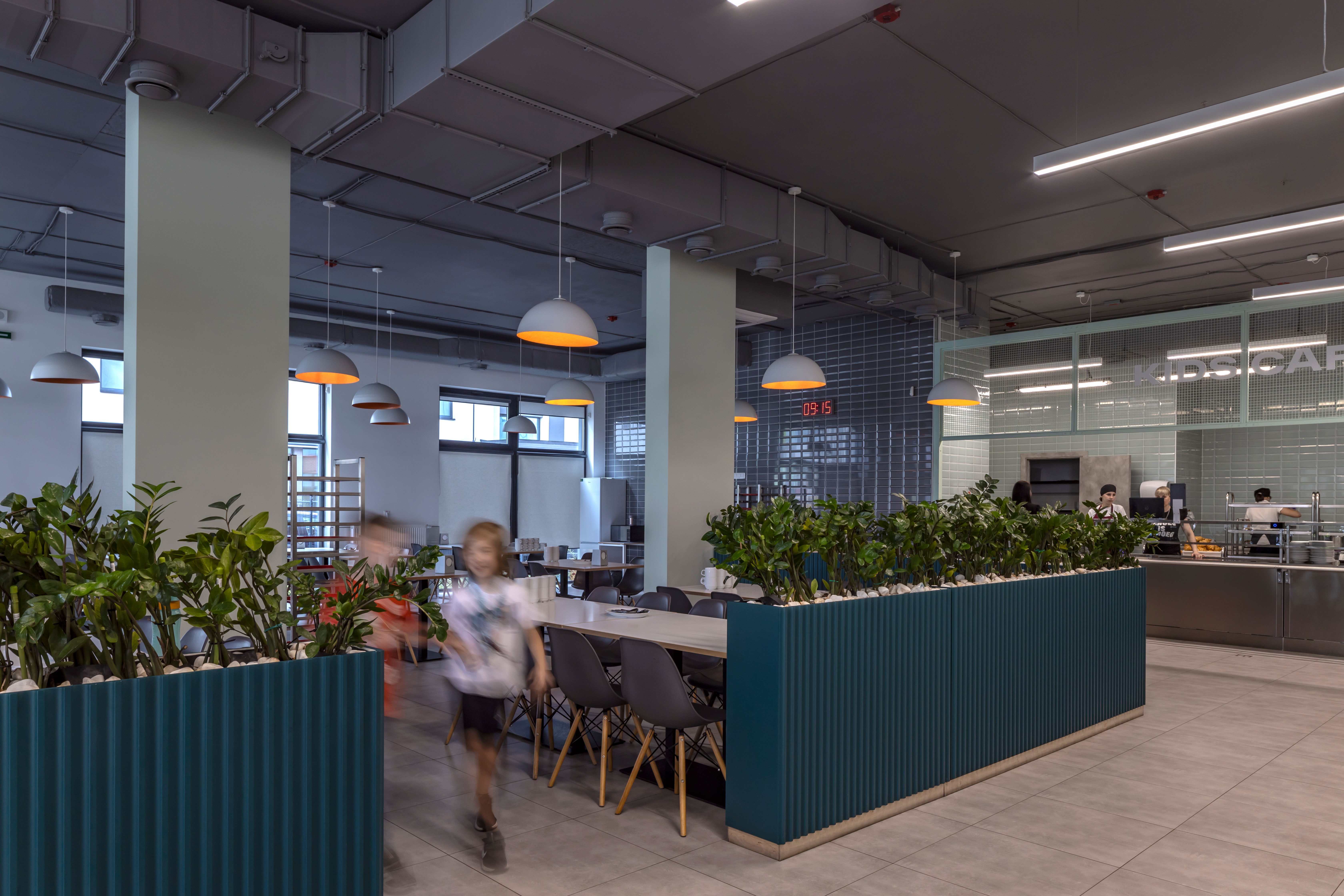 All communication zones with tall windows are situated around the inner courtyard, creating a beautifully lit space, and the window sills serve as additional relaxation areas for the children.
