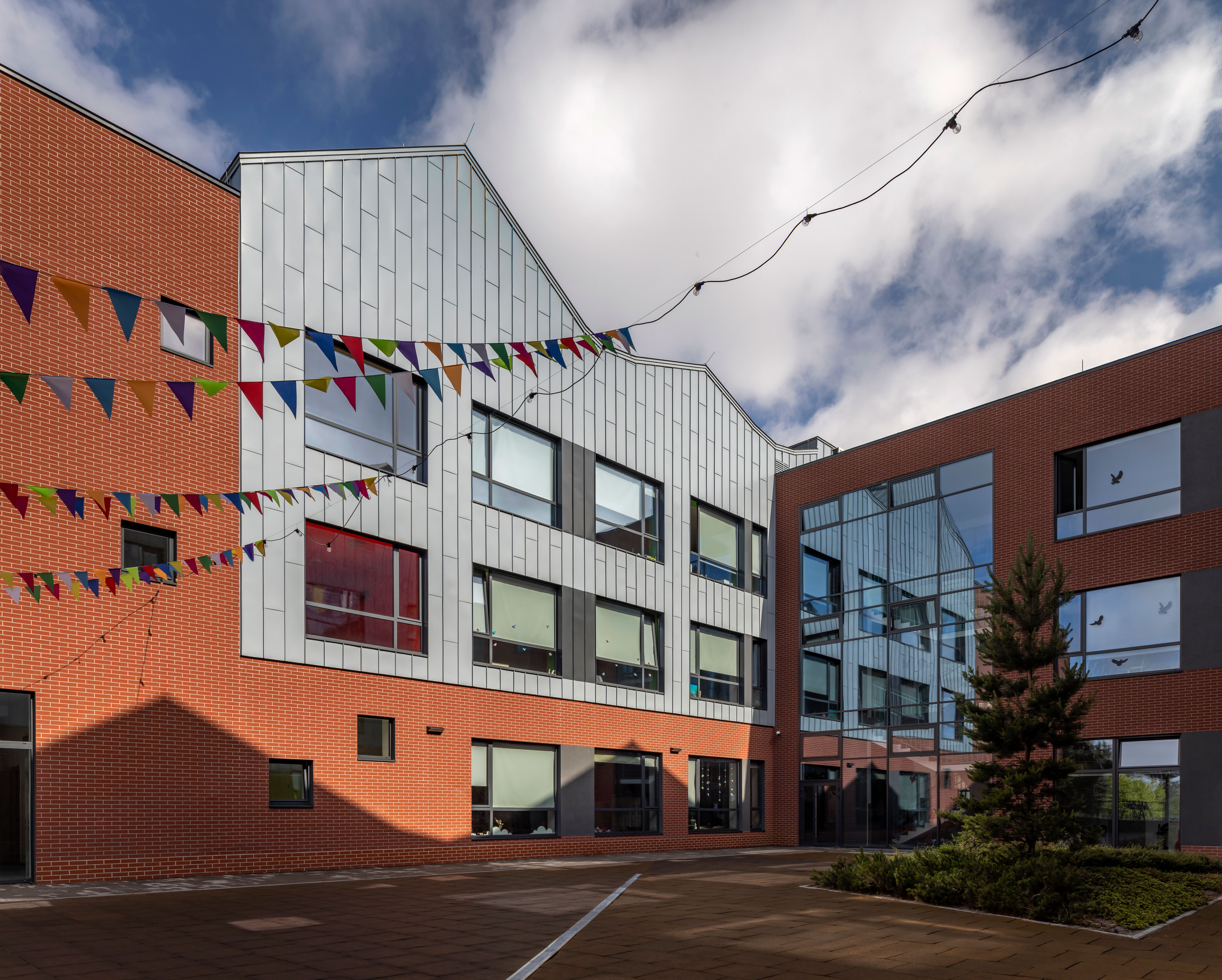 The architects facedn the mission to make the new micro-district more attractive, and the school was envisioned to breathe life into the residential development. Therefore, they designed a comfortable, aesthetic, functional, and safe space for a school accommodating 500 students of different ages.