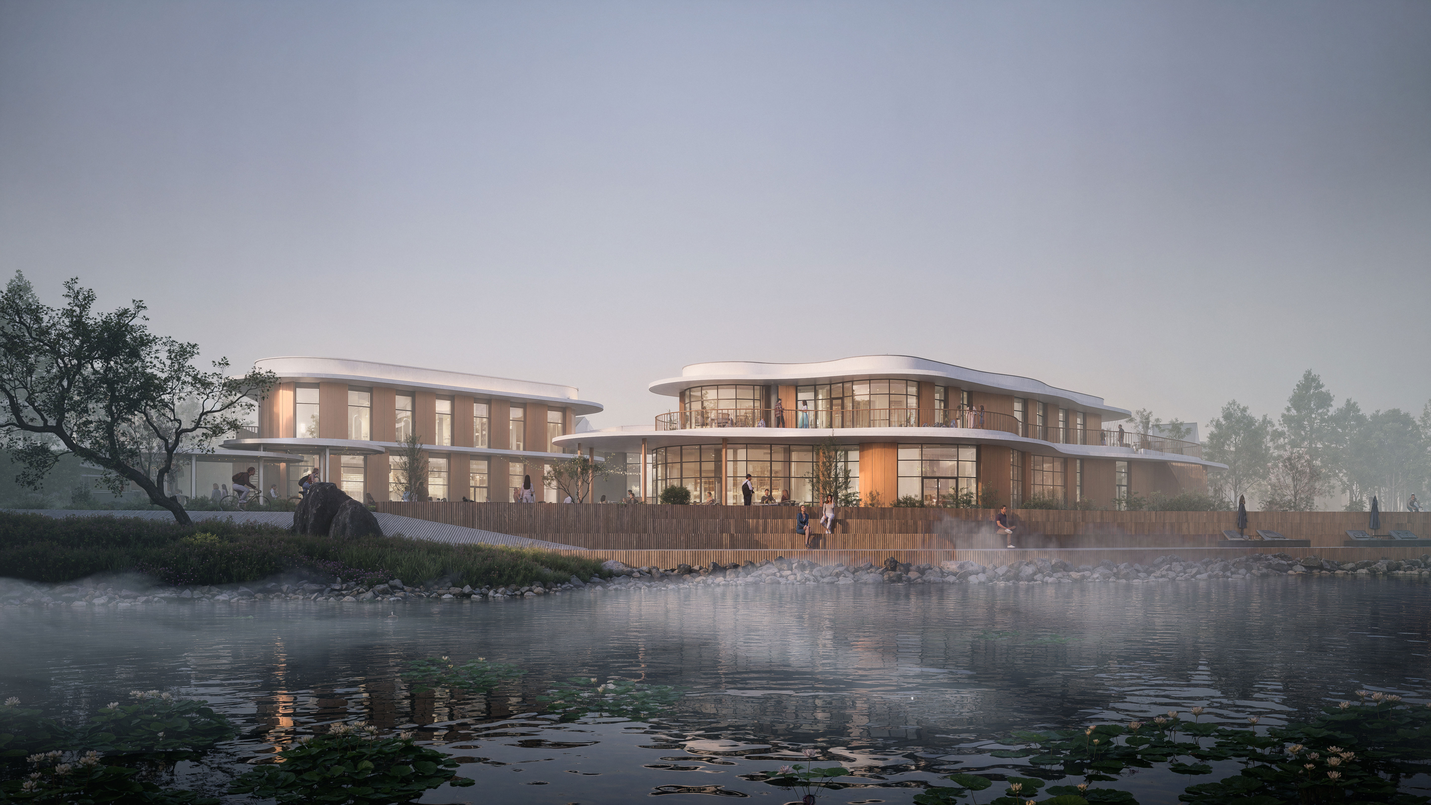 The planning solutions have smooth, curvilinear forms, inspired by the shoreline and the calm dynamics of water. The cantilevered protrusions of the ceilings emphasize this plasticity, while simultaneously performing the function of sun protection and canopies that protect visitors from rain and sun.