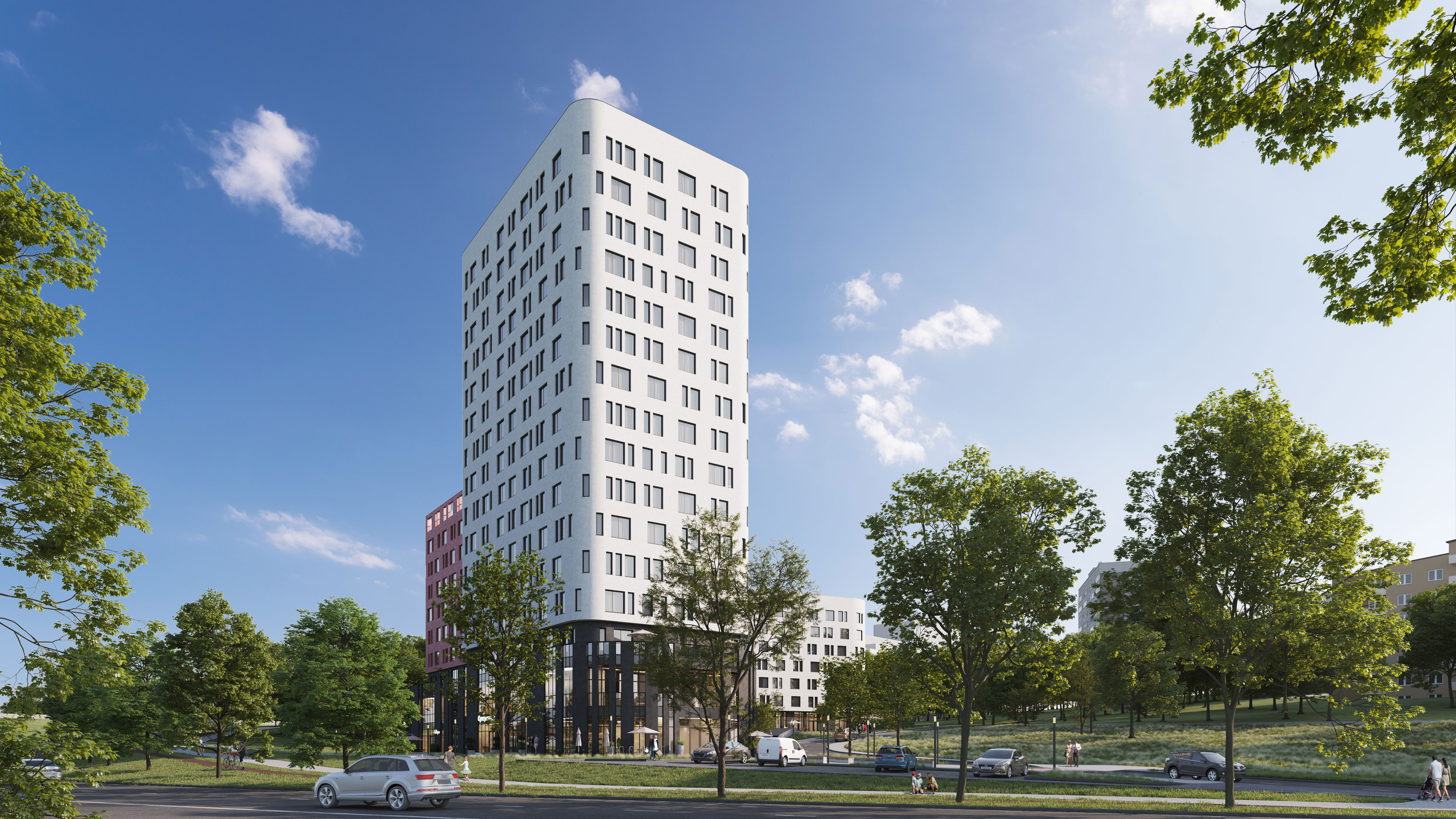 Another key task was the design of a facade system that would remain visually minimalistic yet functionally efficient. All technical components – including air conditioning units – were placed in designated zones, preserving the clean architectural image. The color palette of white and pastel pink adds lightness, while the darker-toned sculptural canopies on the podium provide visual grounding for the lower levels.