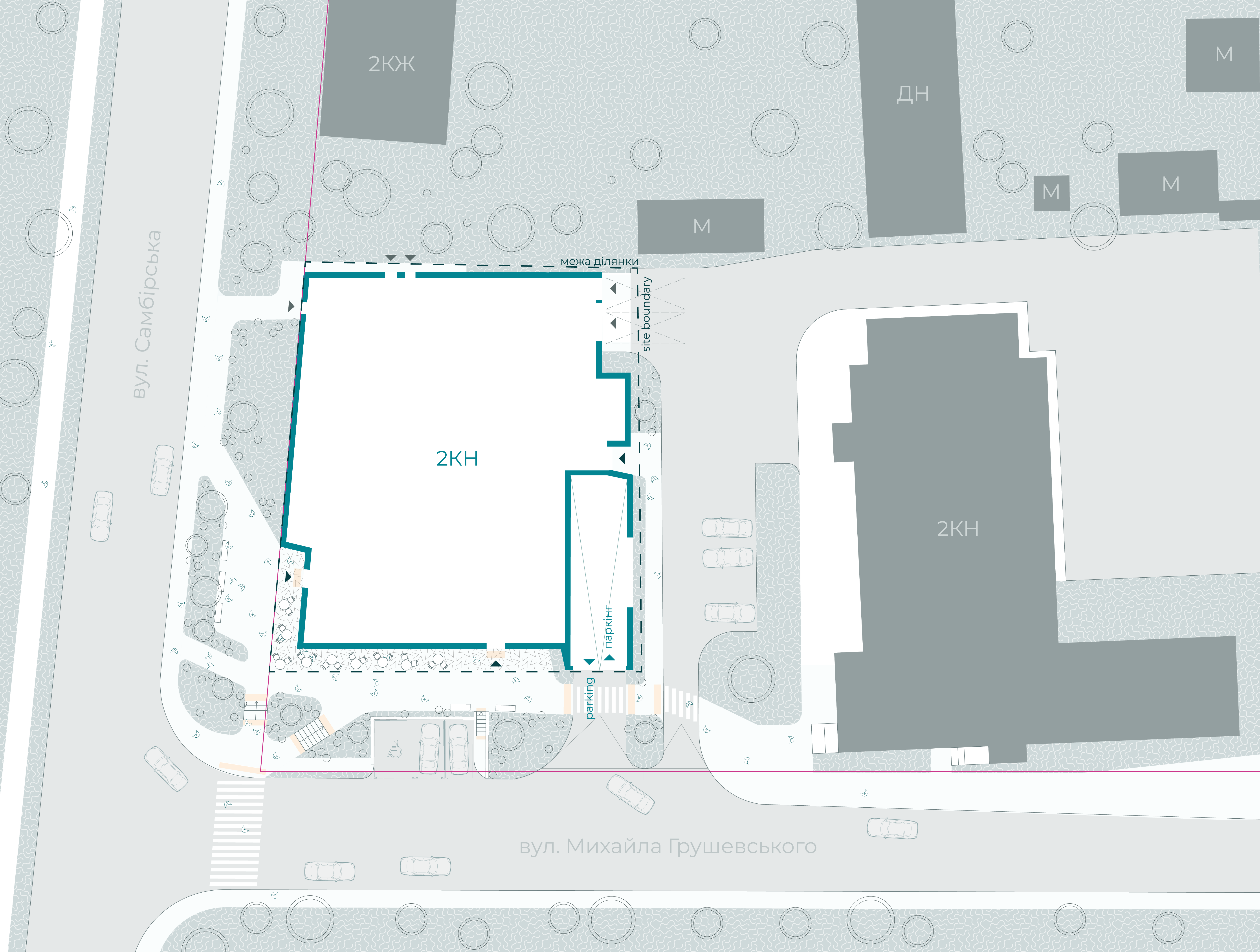 Генплан сформовано на основі продуманої циркуляції пішоходів і транспорту, разом з мінімальним втручанням у природній ландшафт. Передбачено два входи в будівлю для зручного доступу з різних напрямків. Озеленення несе не тільки декоративну, але й інтеграційну функцію, з’єднуючи архітектуру з природним середовищем.