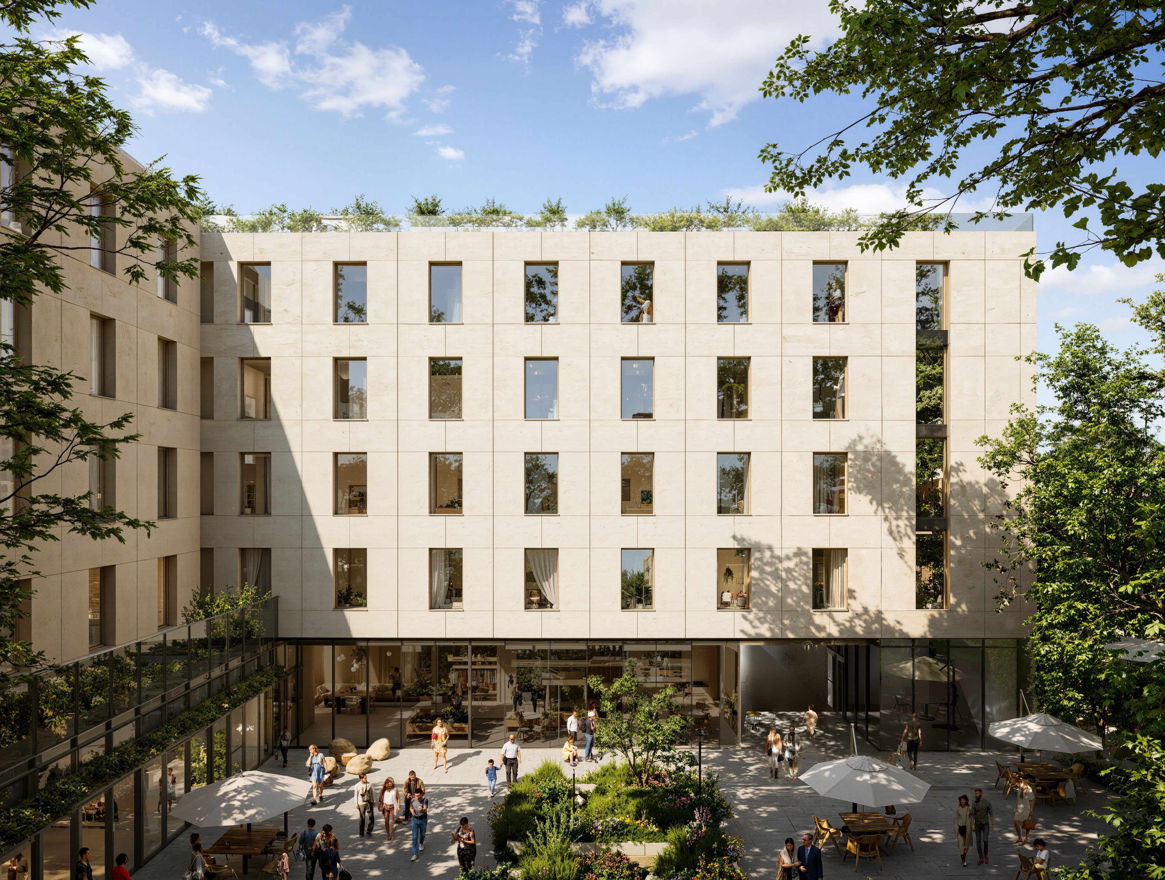 The key architectural idea is the introduction of a terraced hotel volume that is adapted to its surroundings and functions as a mediator between the public urban space and the private inner courtyard environment.