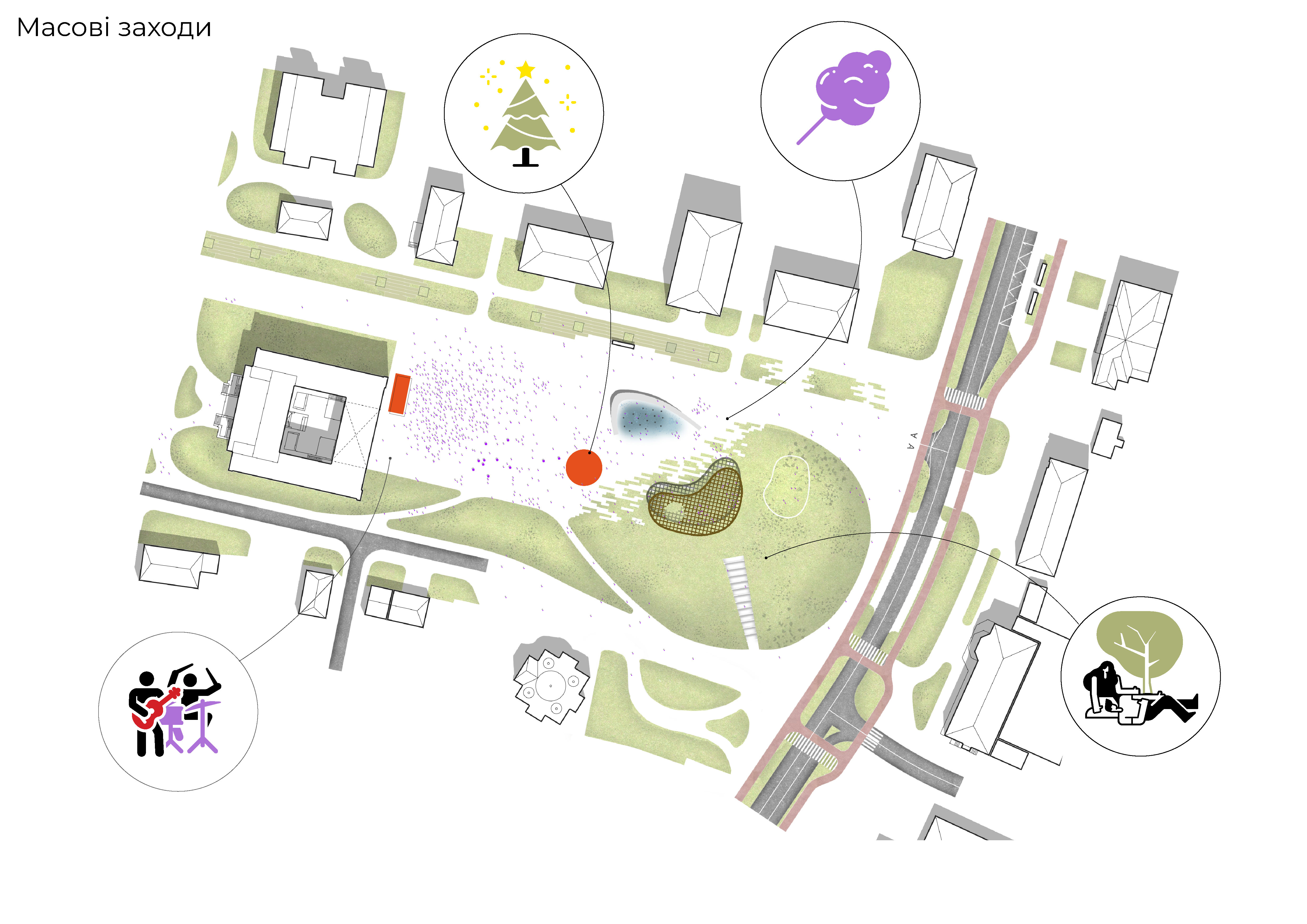 The functional zoning of the square is based on ensuring its social dimension and versatility. The central area features several key zones: a space for large-scale events, concerts, open exhibitions, and fairs; a recreational zone with a pedestrian fountain and a multifunctional pergola — a new relaxation spot for the community where people can enjoy aromatic coffee or read a book outdoors; and a children’s area combining a modern playground with an open space for artistic activities.