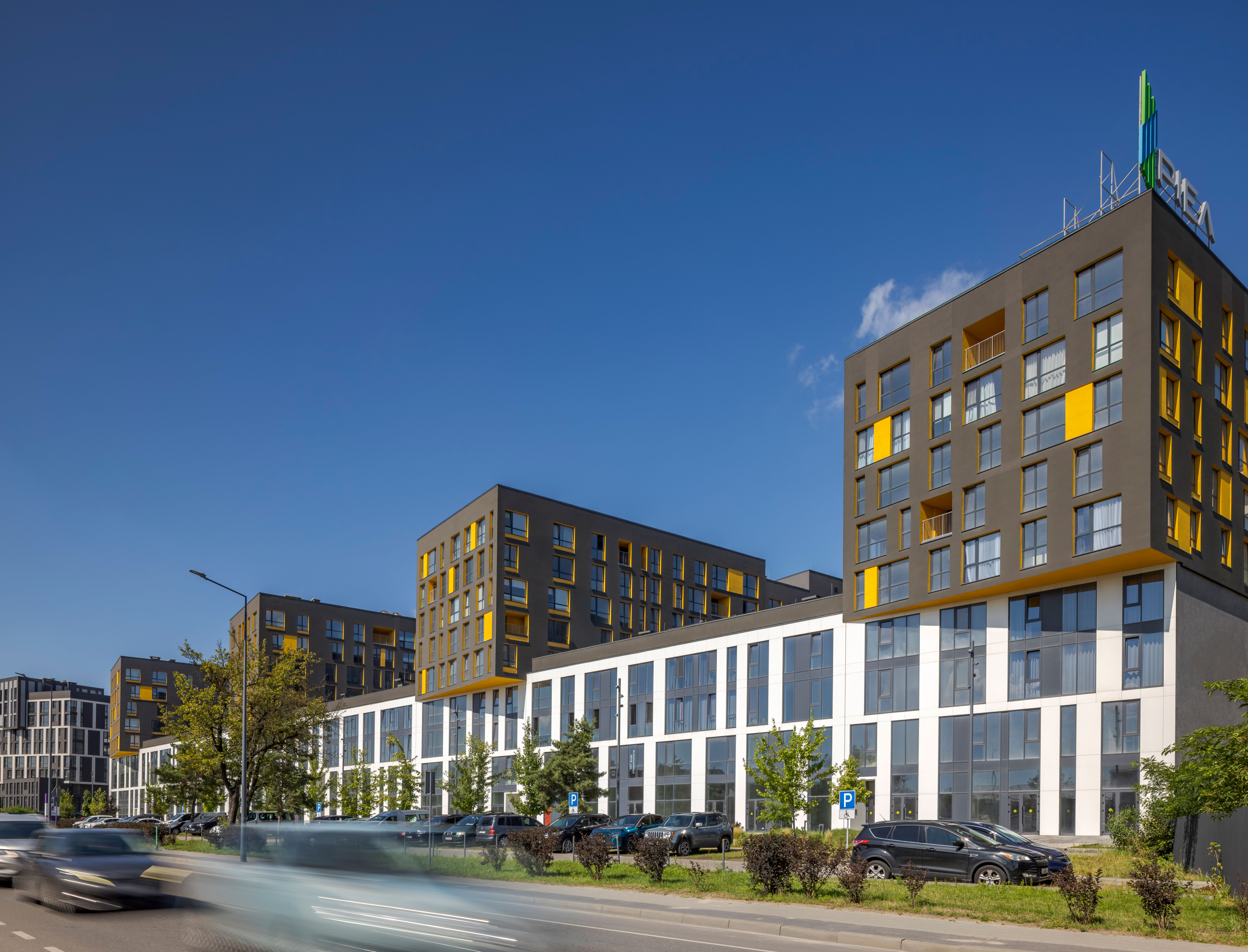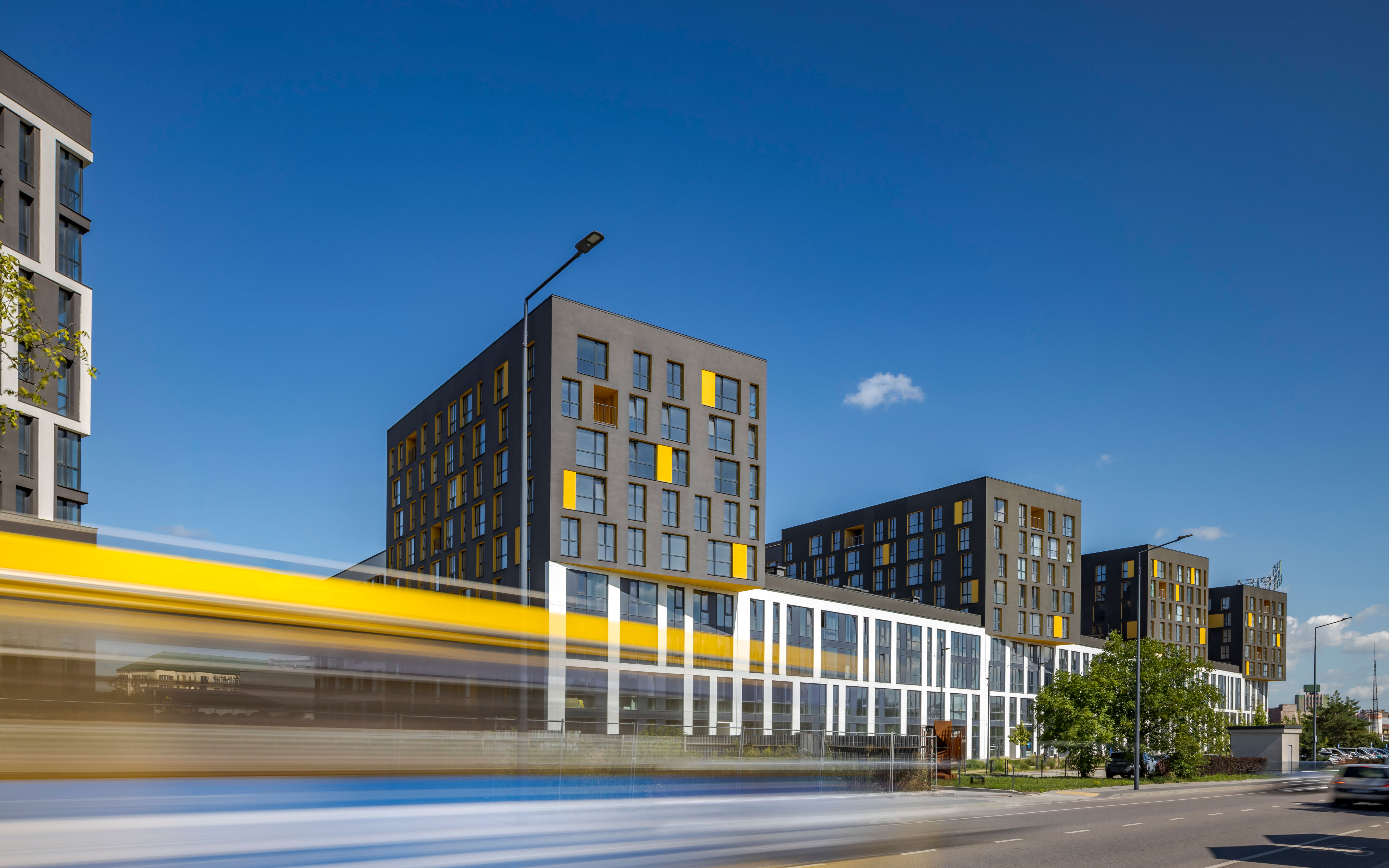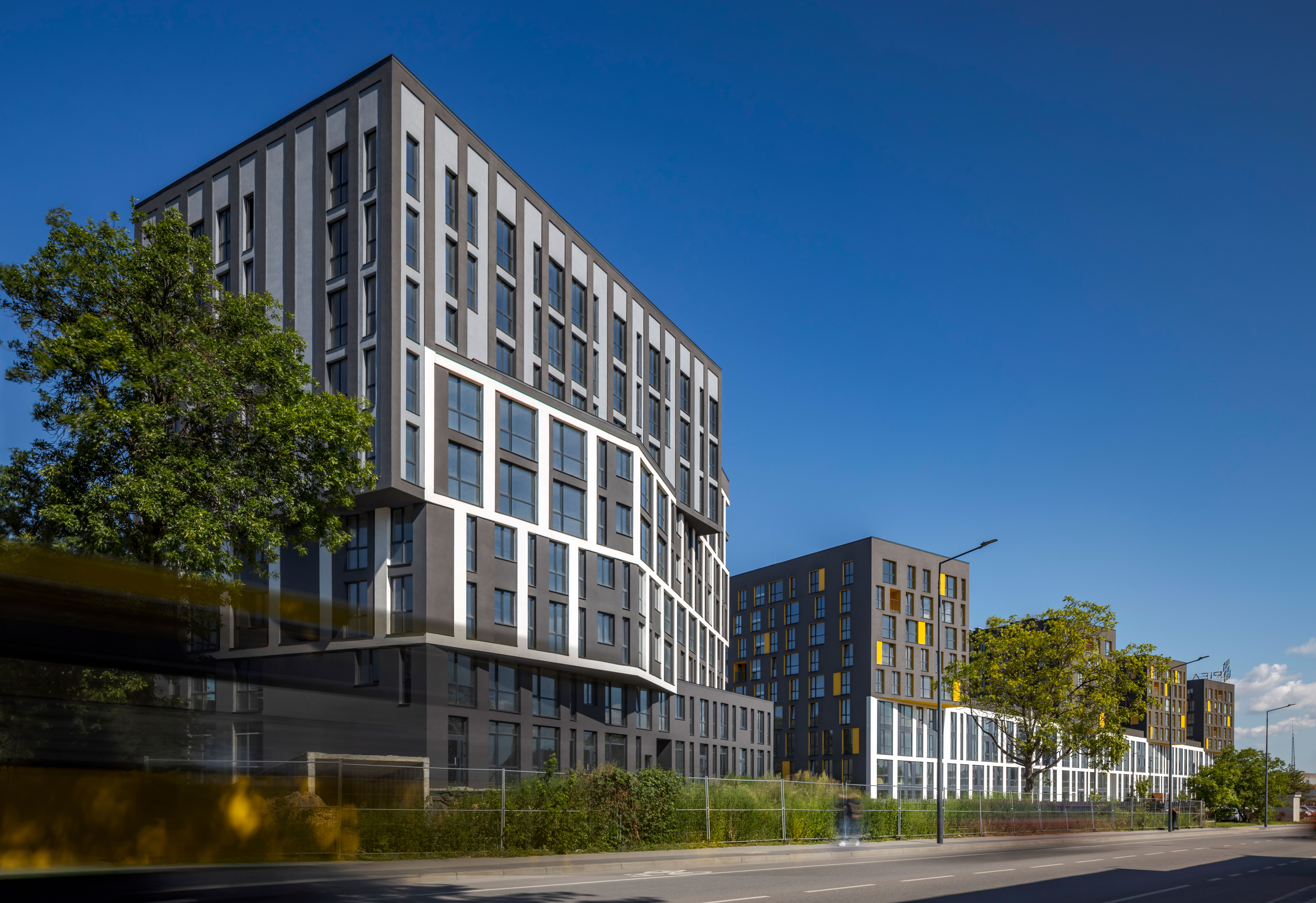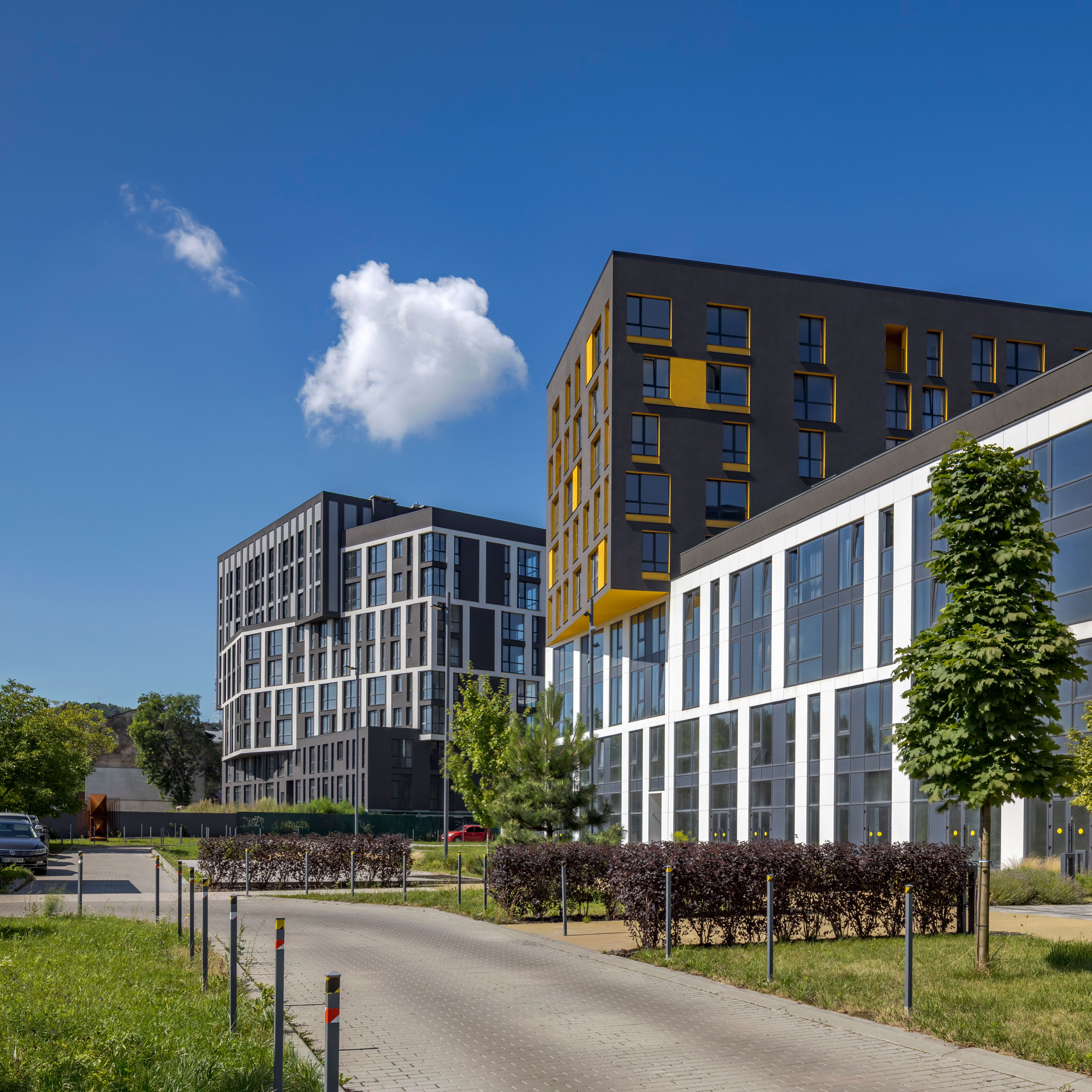 The uncluttered modern architecture with clear facade graphics harmoniously unites office buildings located on the side of the noisy Bohdana Khmelnytskoho Street, apartments and apartment buildings with cozy green courtyards. Three courtyards form recreational spaces for the residents of the complex and several public areas.