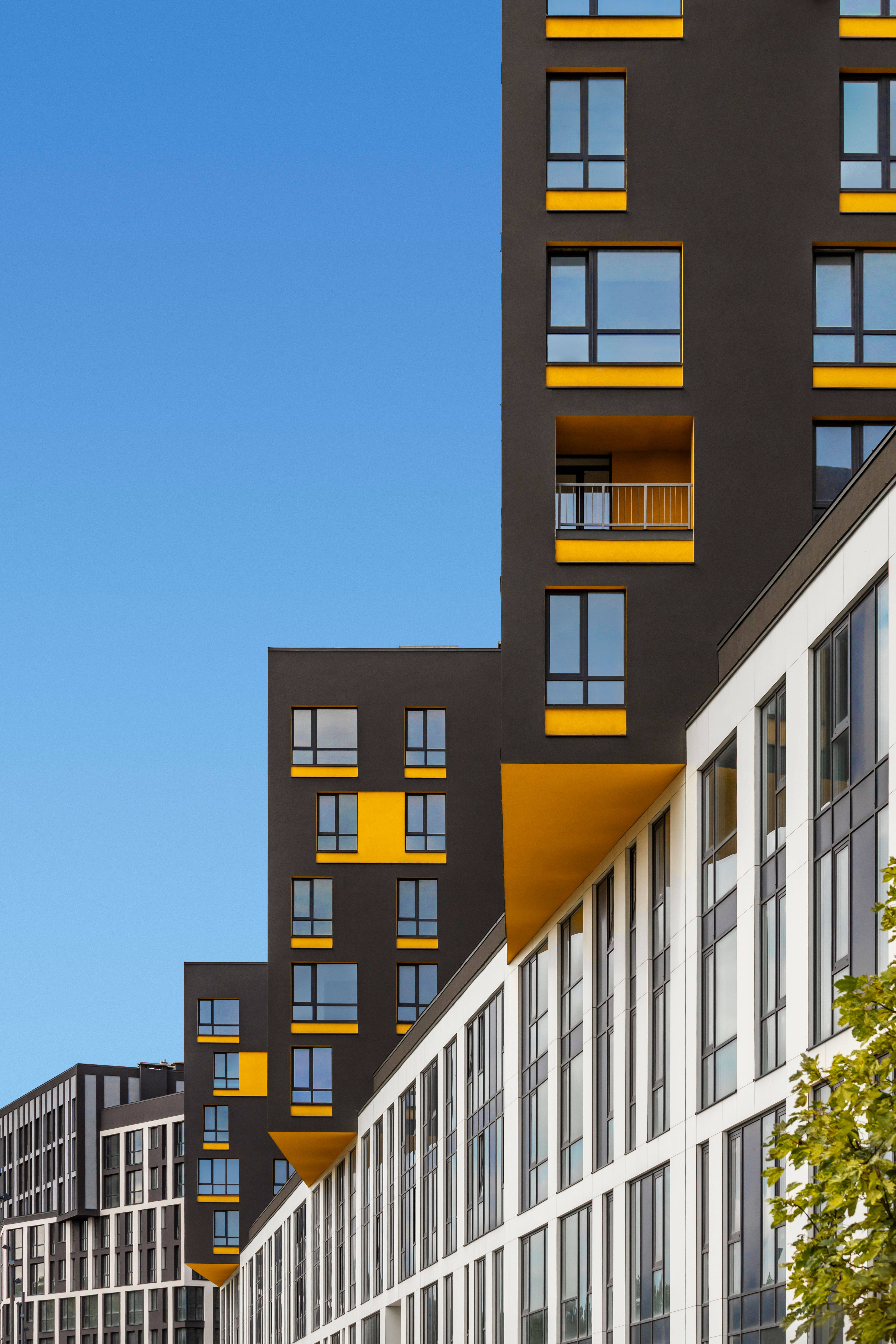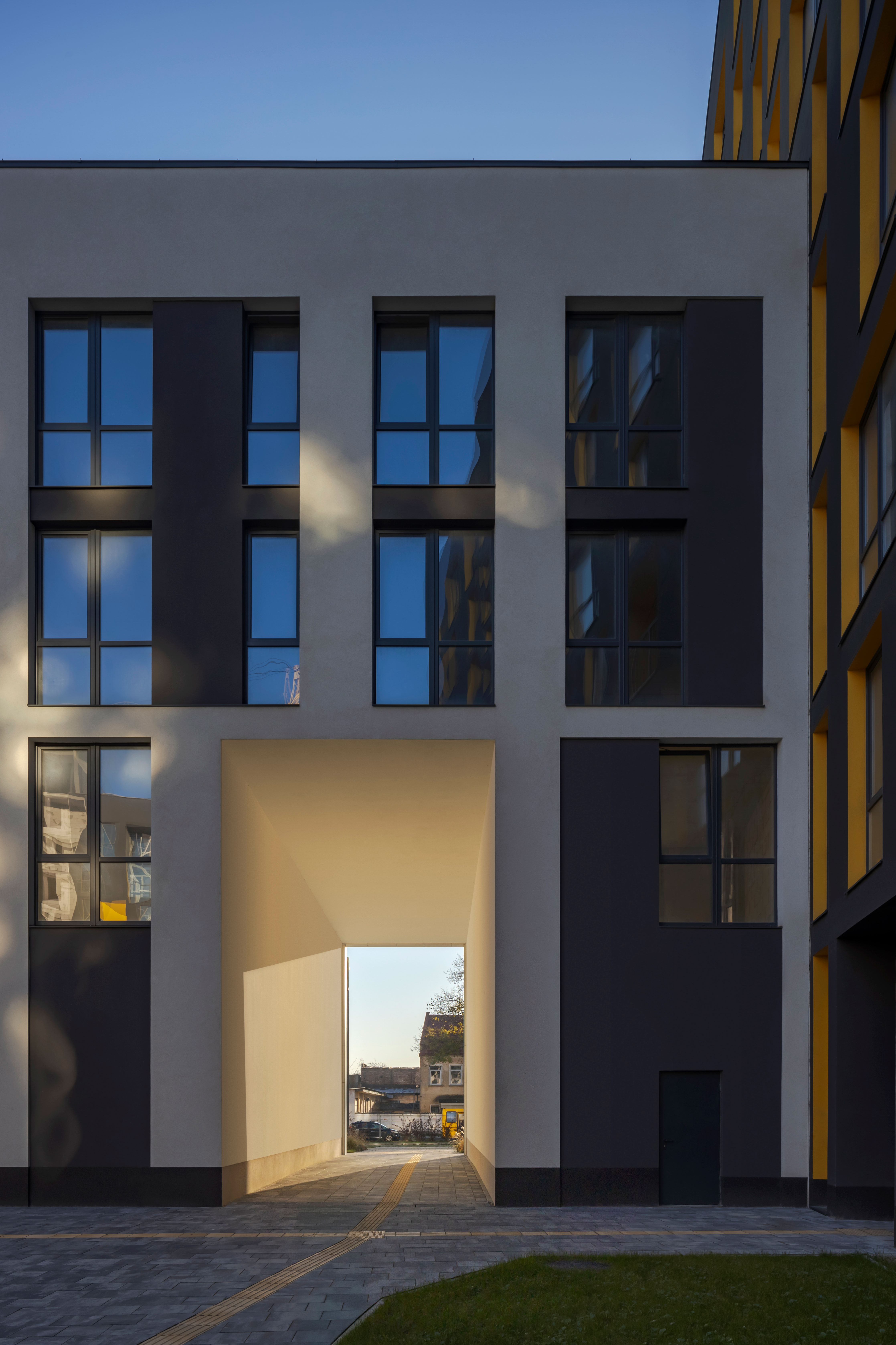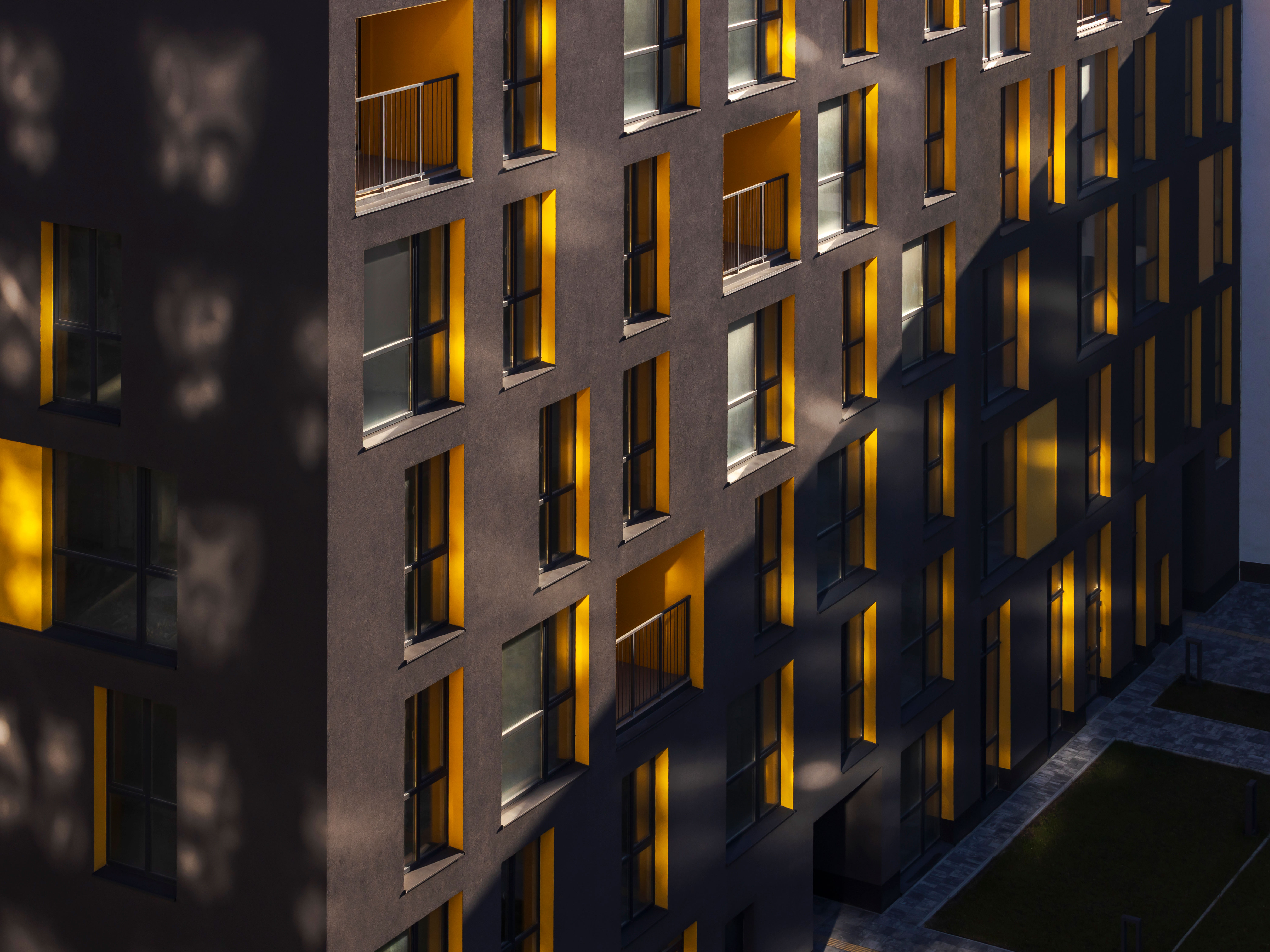 The uncluttered modern architecture with clear facade graphics harmoniously unites office buildings located on the side of the noisy Bohdana Khmelnytskoho Street, apartments and apartment buildings with cozy green courtyards. Three courtyards form recreational spaces for the residents of the complex and several public areas.