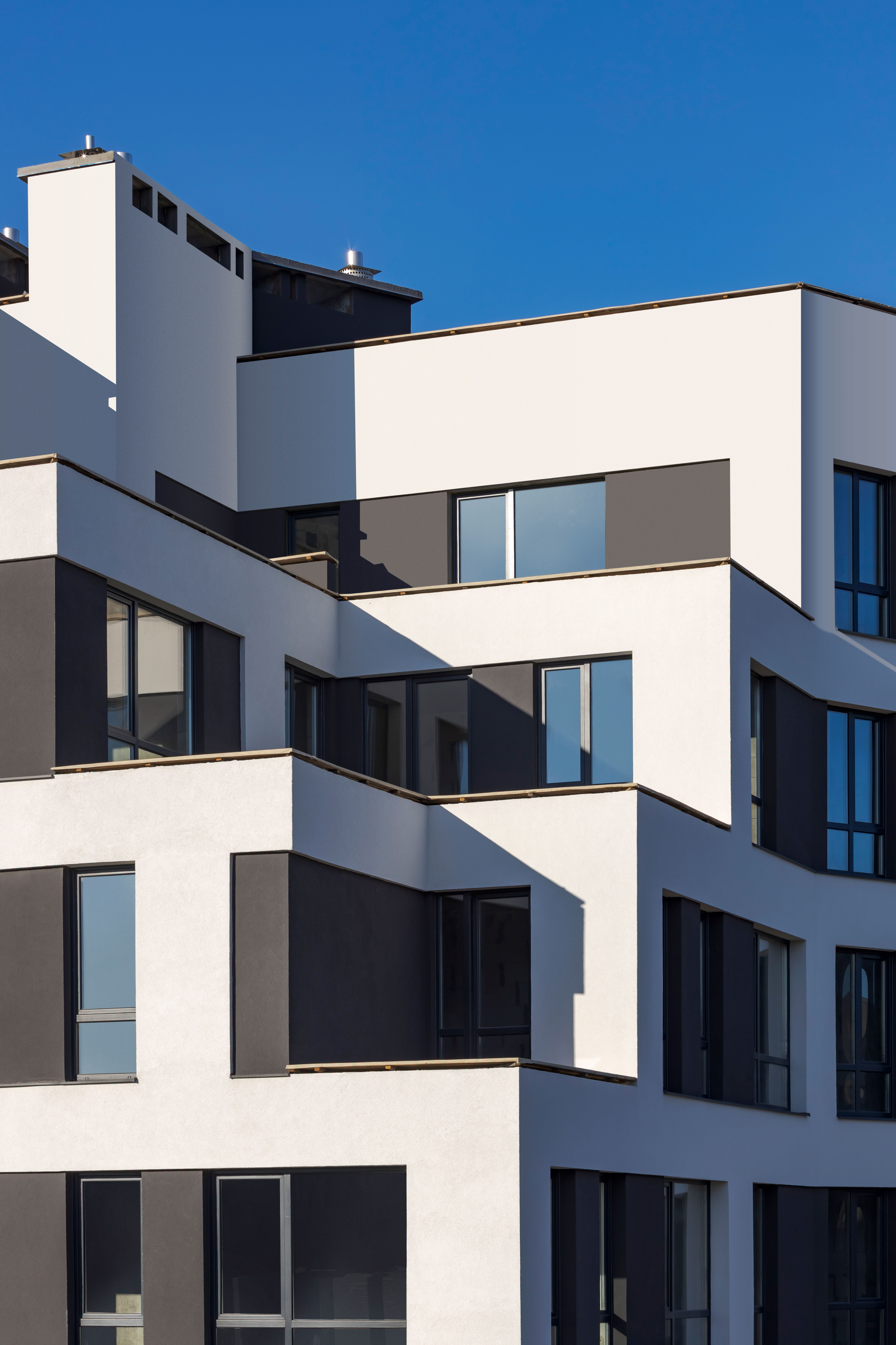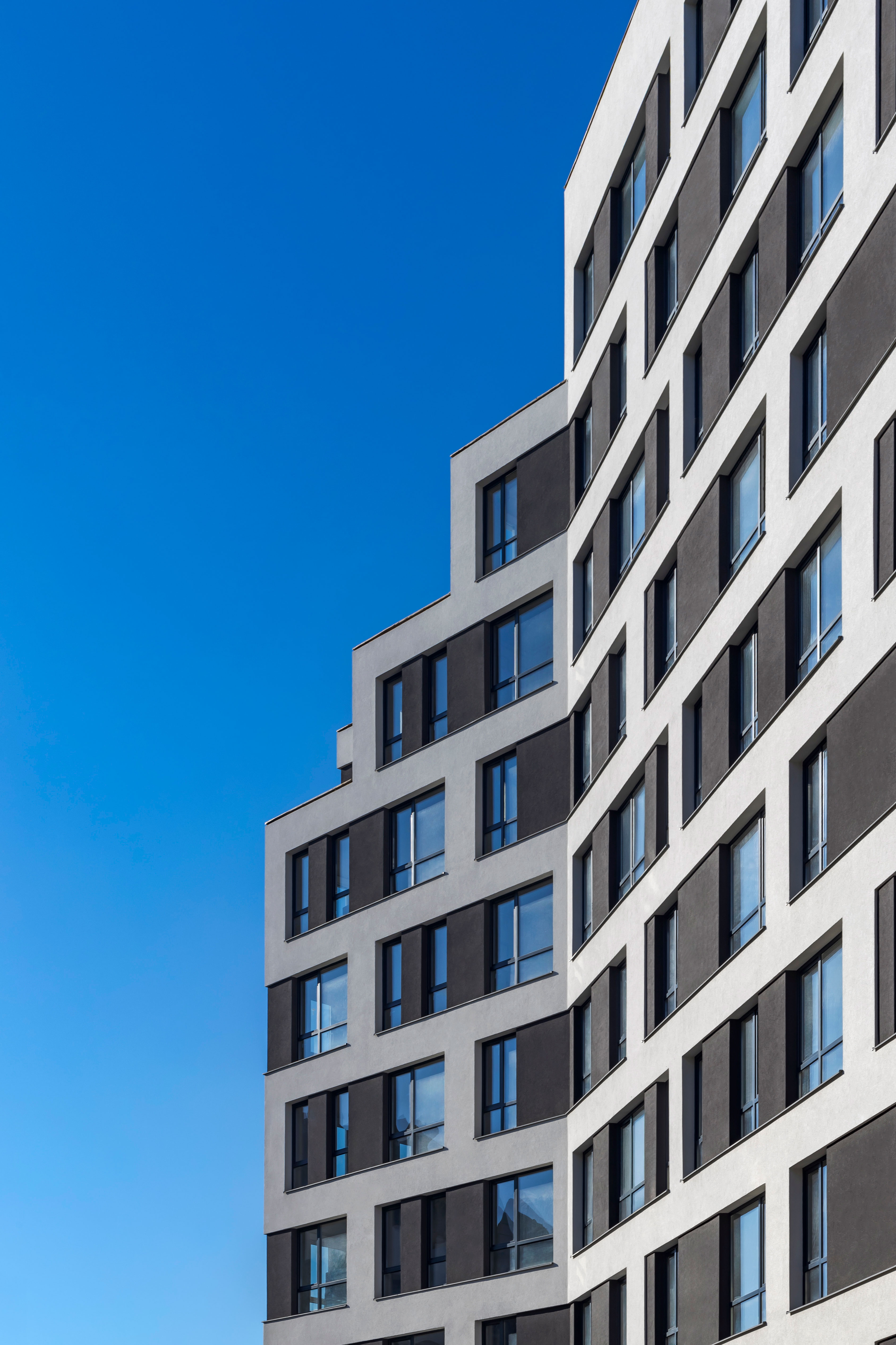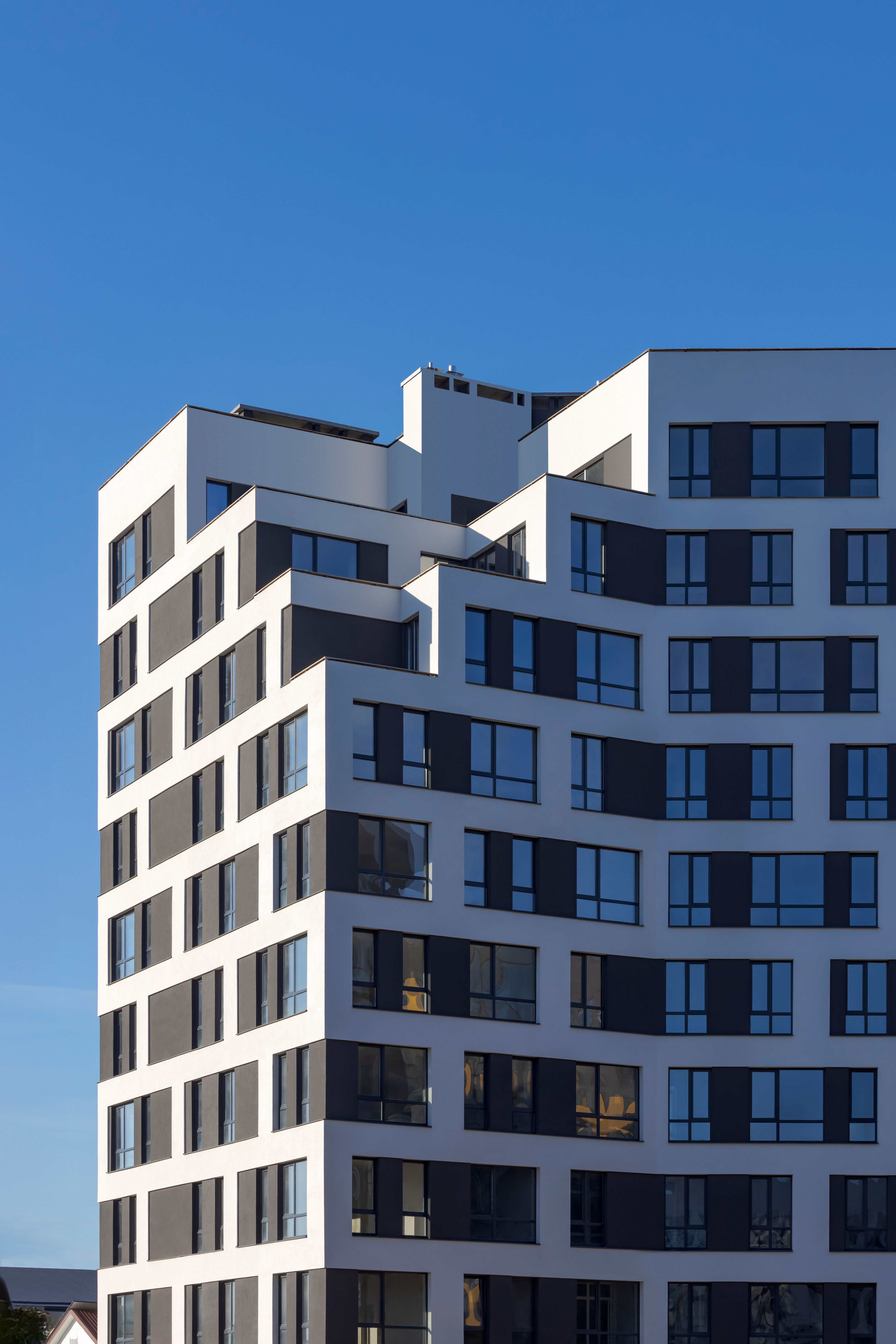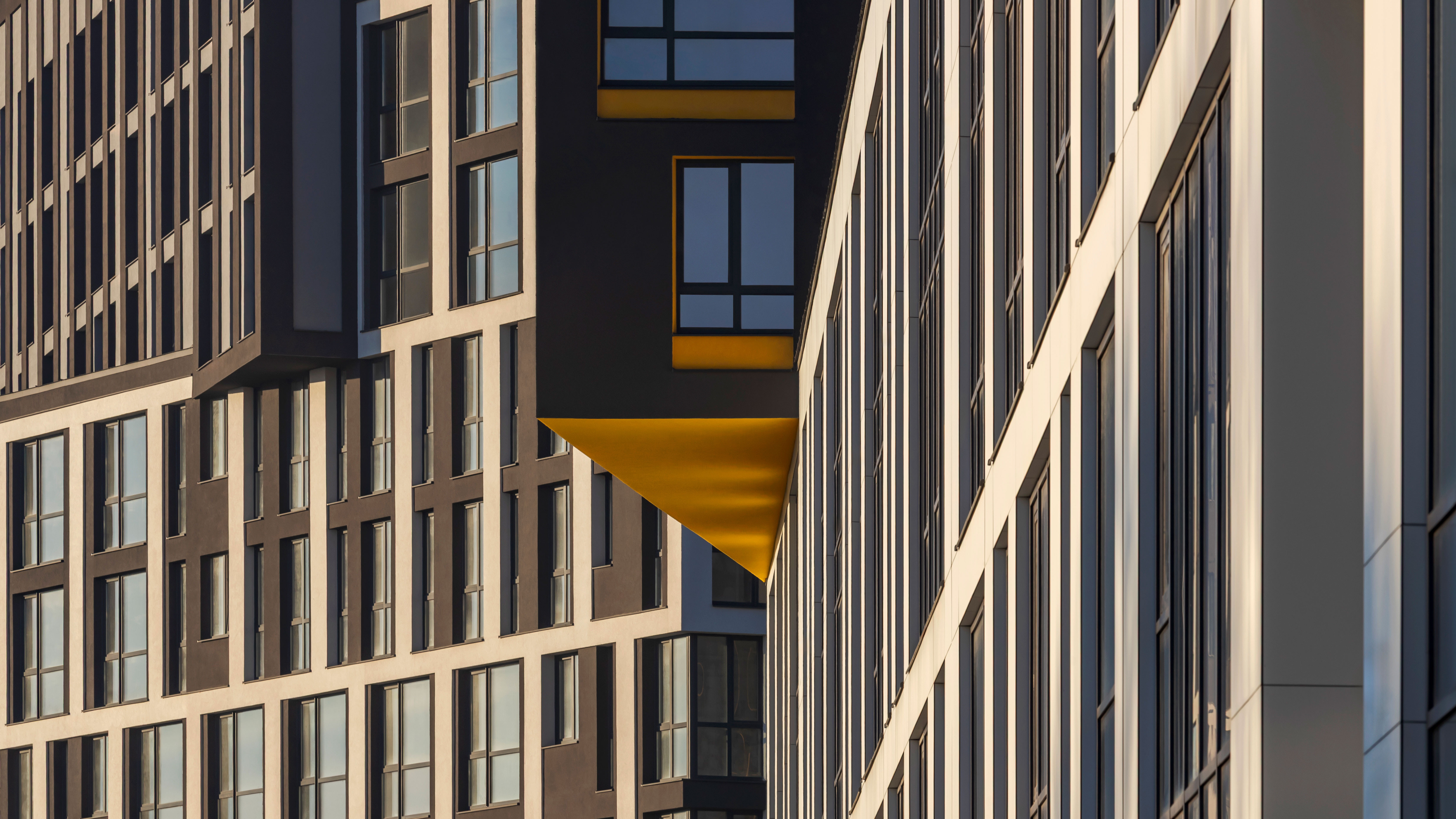 The uncluttered modern architecture with clear facade graphics harmoniously unites office buildings located on the side of the noisy Bohdana Khmelnytskoho Street, apartments and apartment buildings with cozy green courtyards. Three courtyards form recreational spaces for the residents of the complex and several public areas.