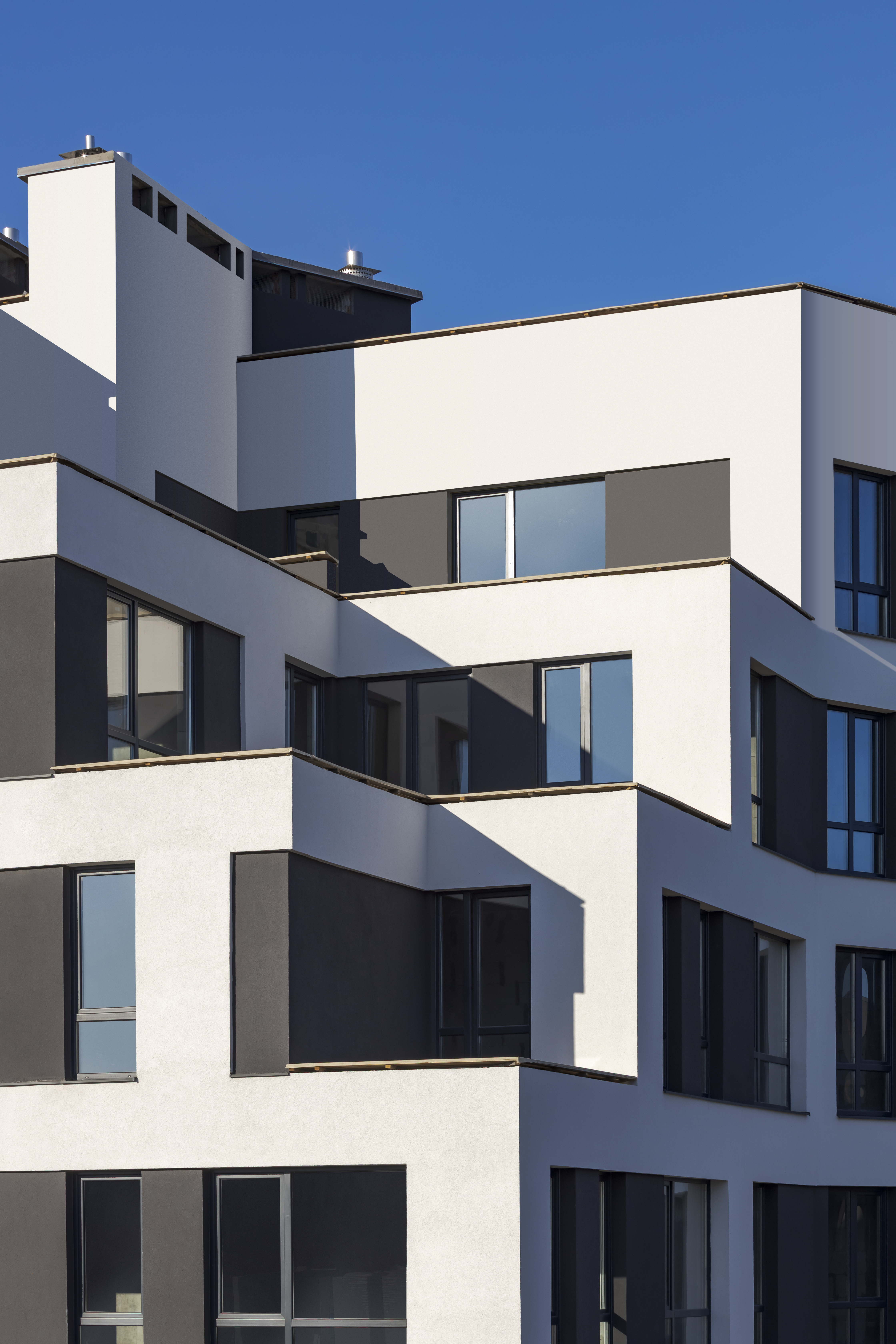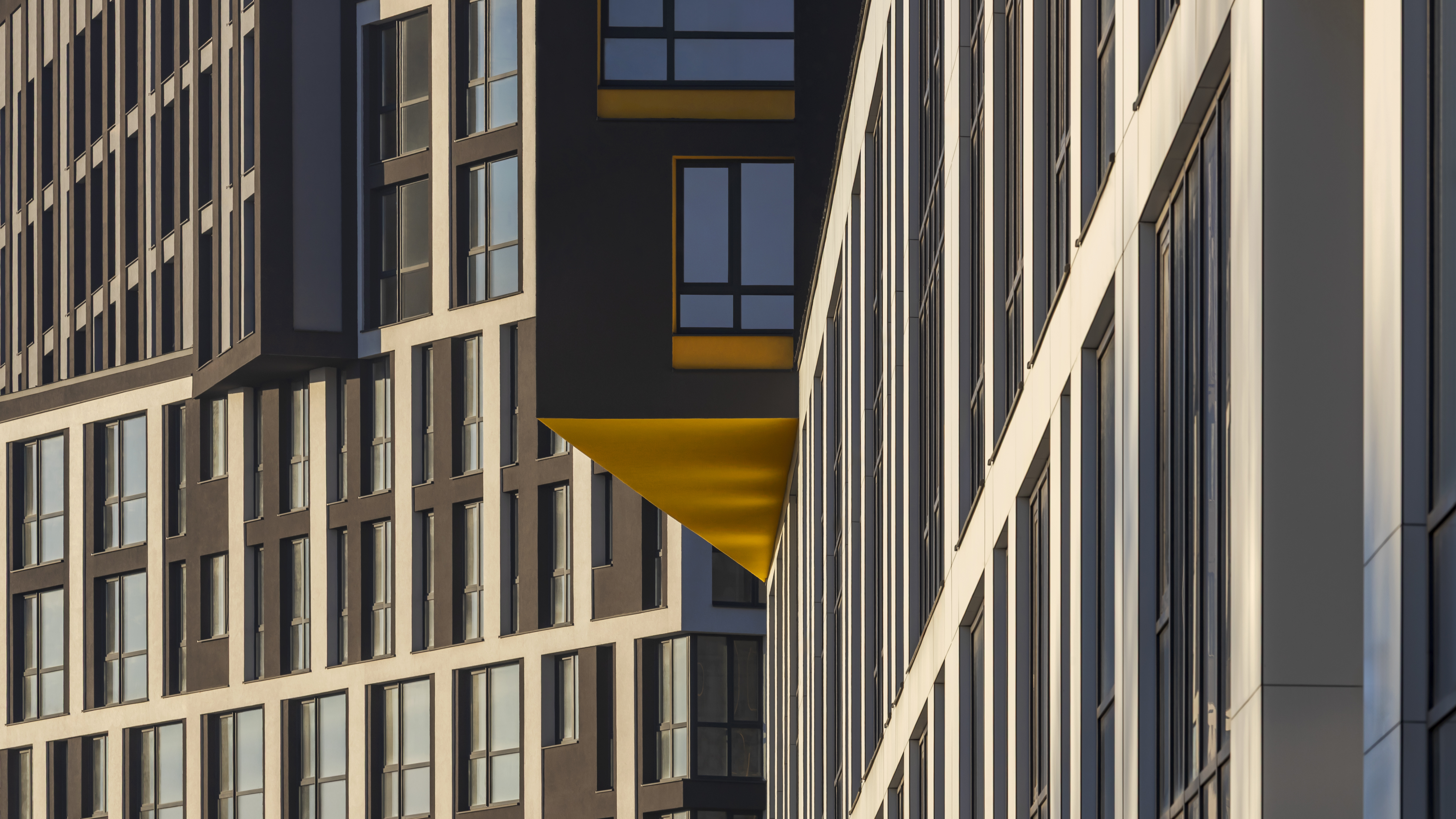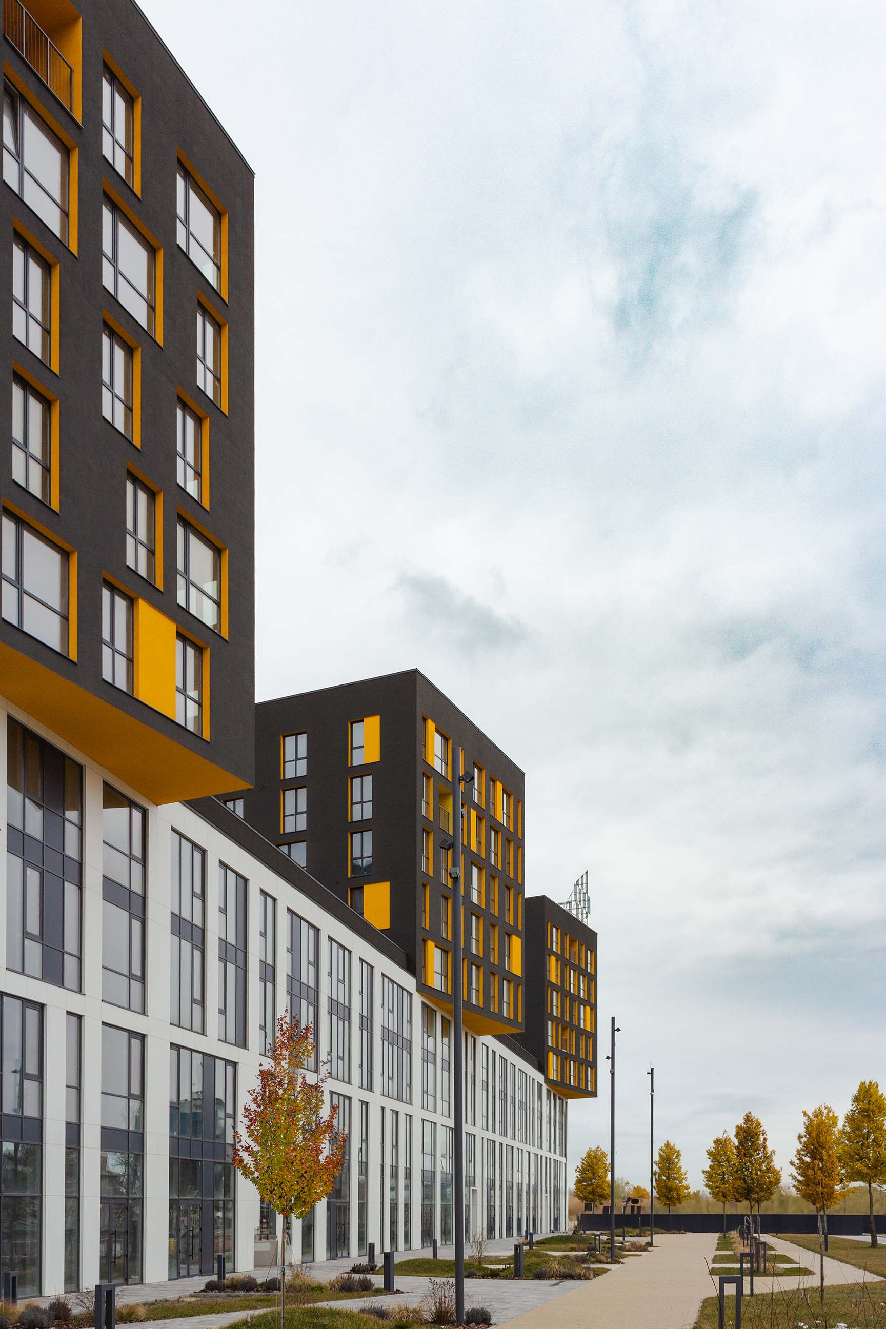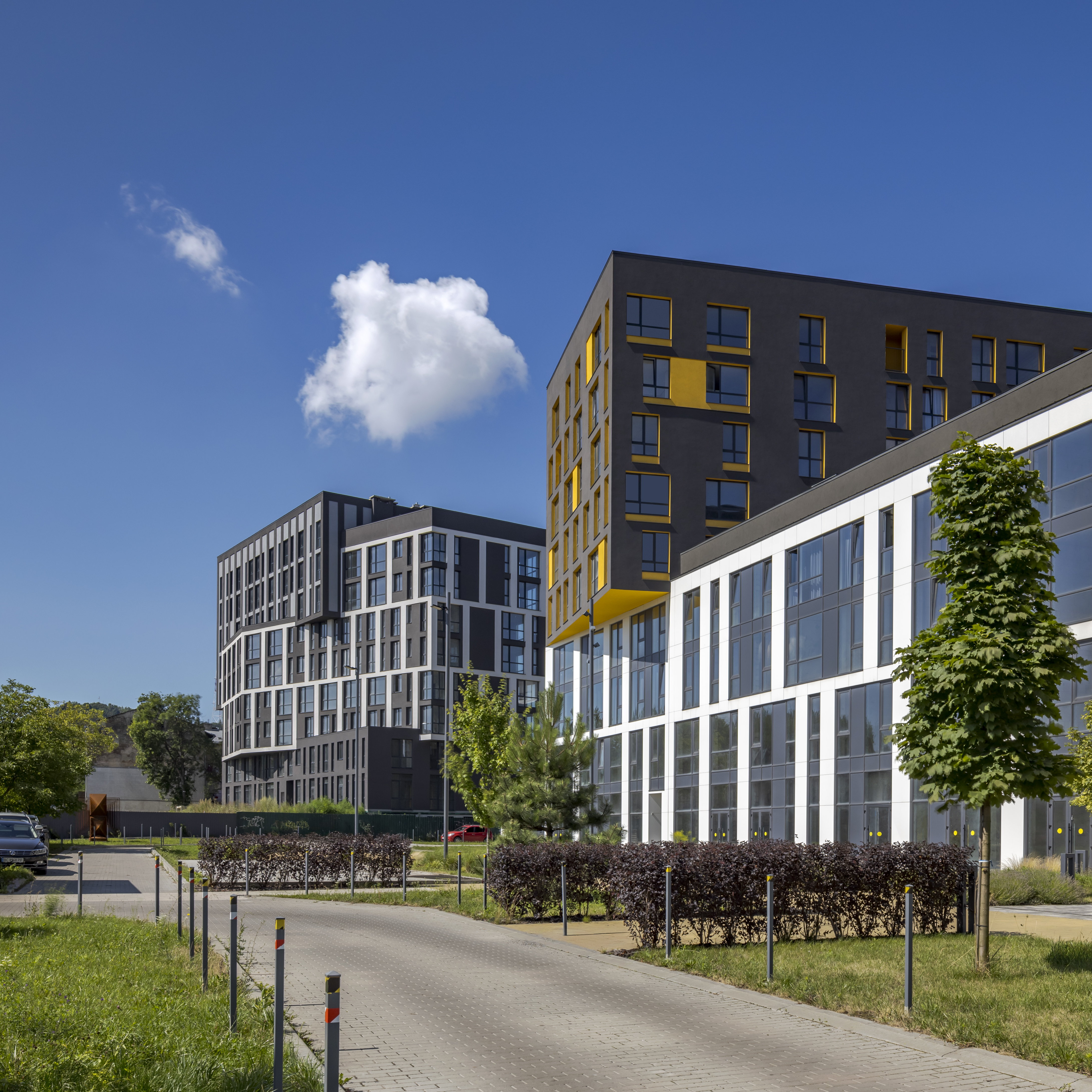 Лаконічна сучасна архітектура з чіткою графікою фасадів гармонійно об’єднує офісні будівлі, що розташовані зі сторони шумної вулиці Богдана Хмельницького, апартаменти та квартирні будинки із затишними зеленими дворами. Три внутрішні двори формують рекреаційні простори для мешканців комплексу та кілька громадських зон.