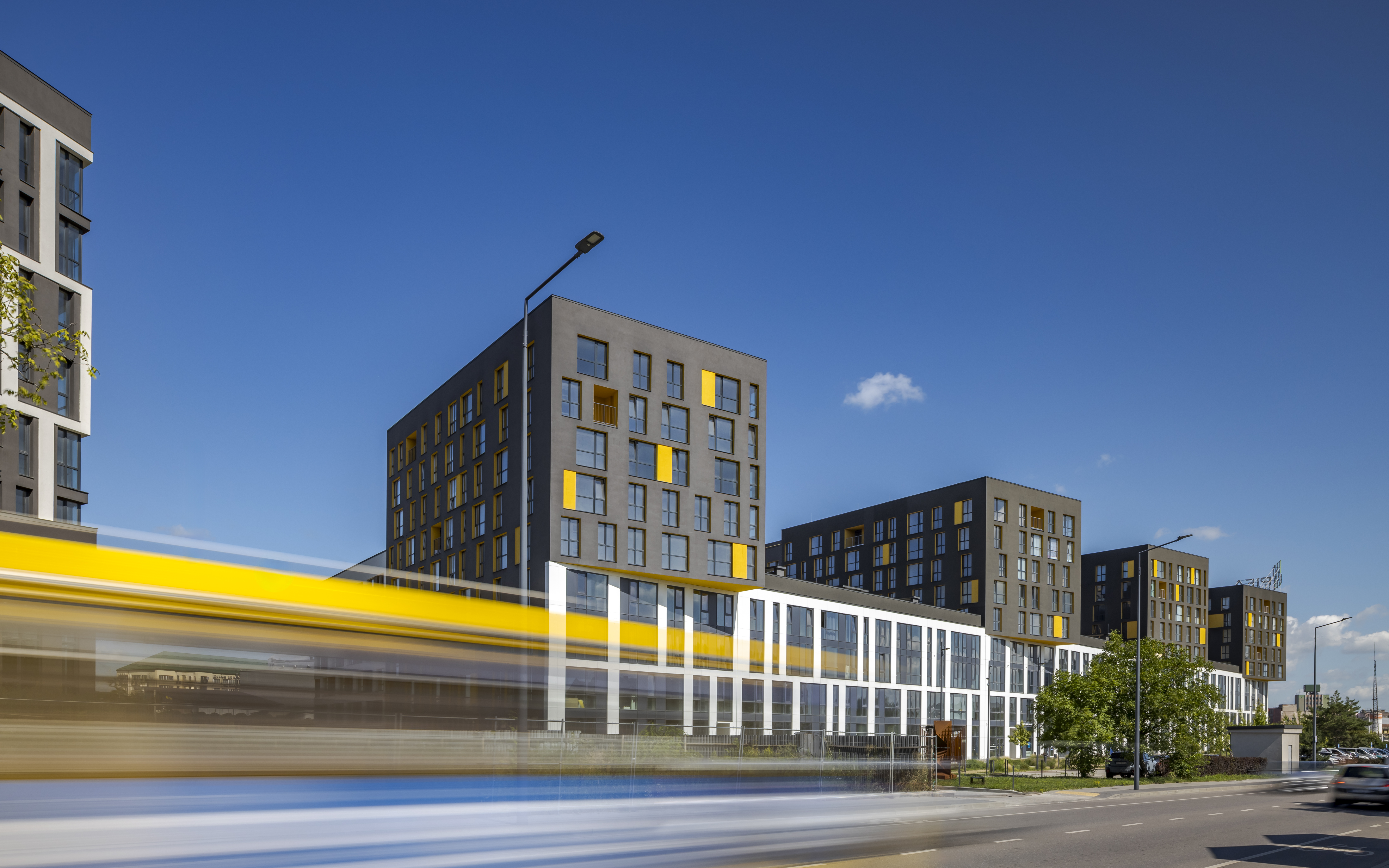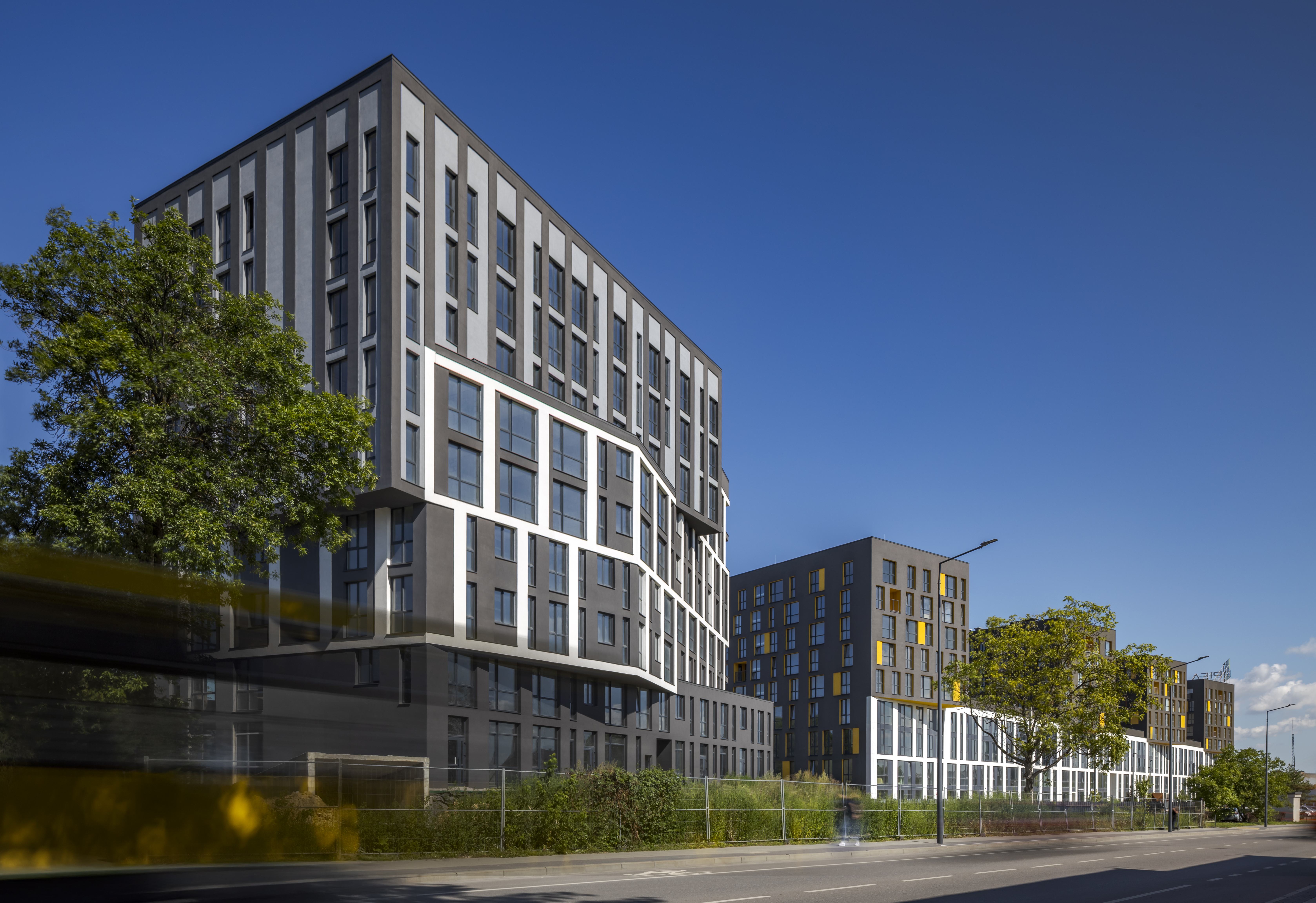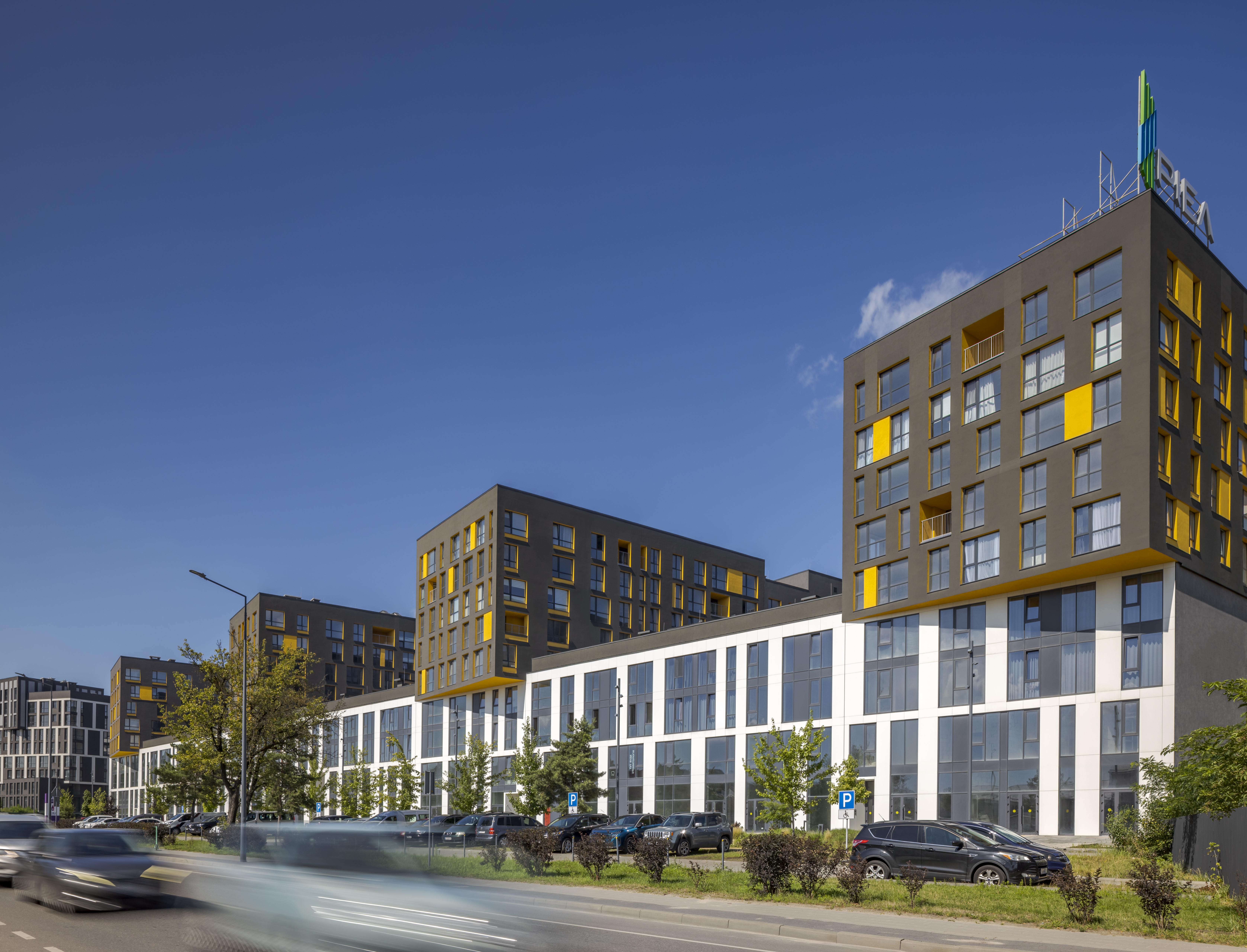 Структура комплексу передбачає суцільну чотириповерхову забудову, що формує фронт цієї вулиці, із точковими дев’ятиповерховими домінантами, які свідомо віднесені вглибину комплексу, відповідаючи генеральному плану міста. Відкритий простір нового фрагменту вулиці буде використовуватись як громадський простір, а не паркінг.