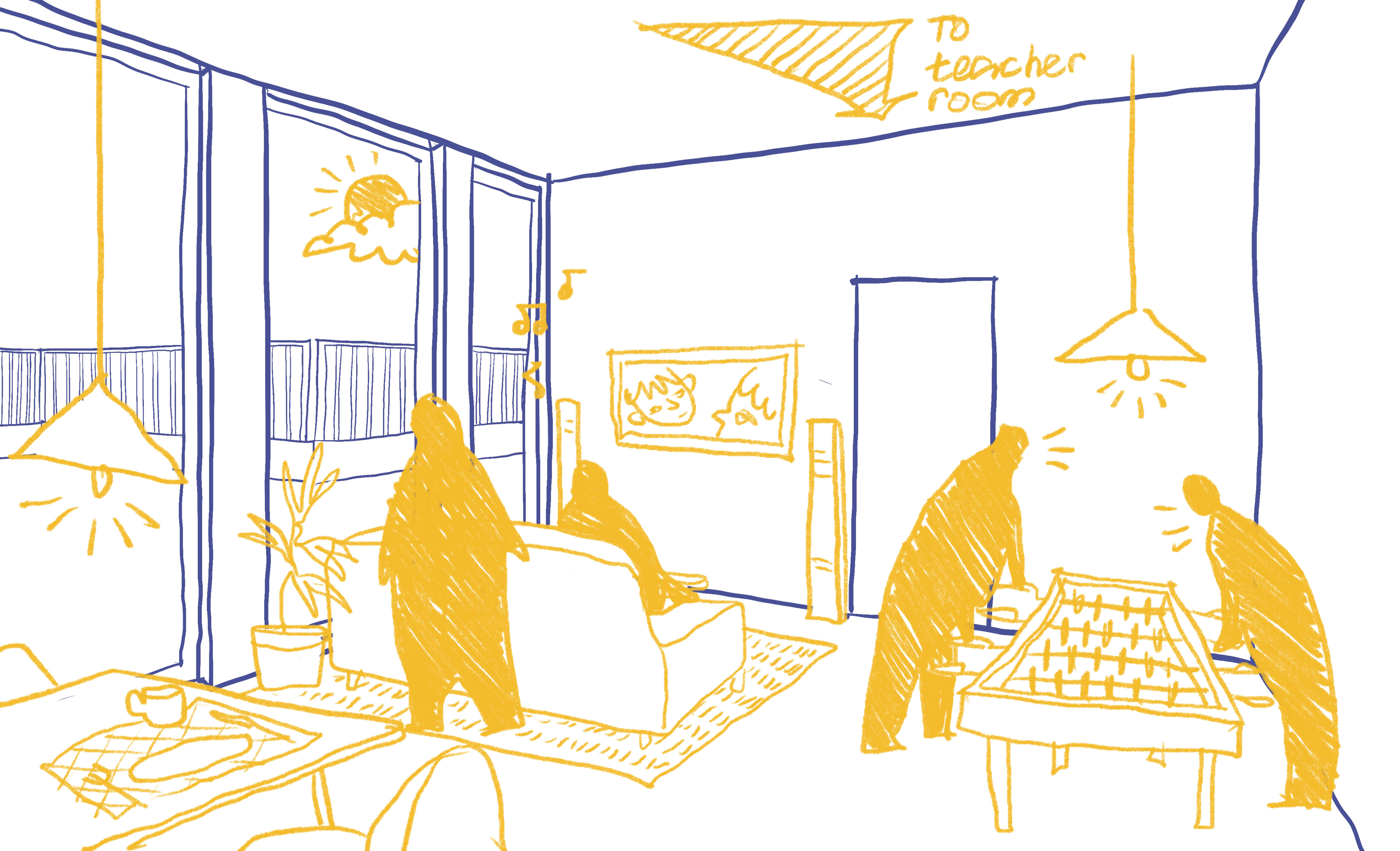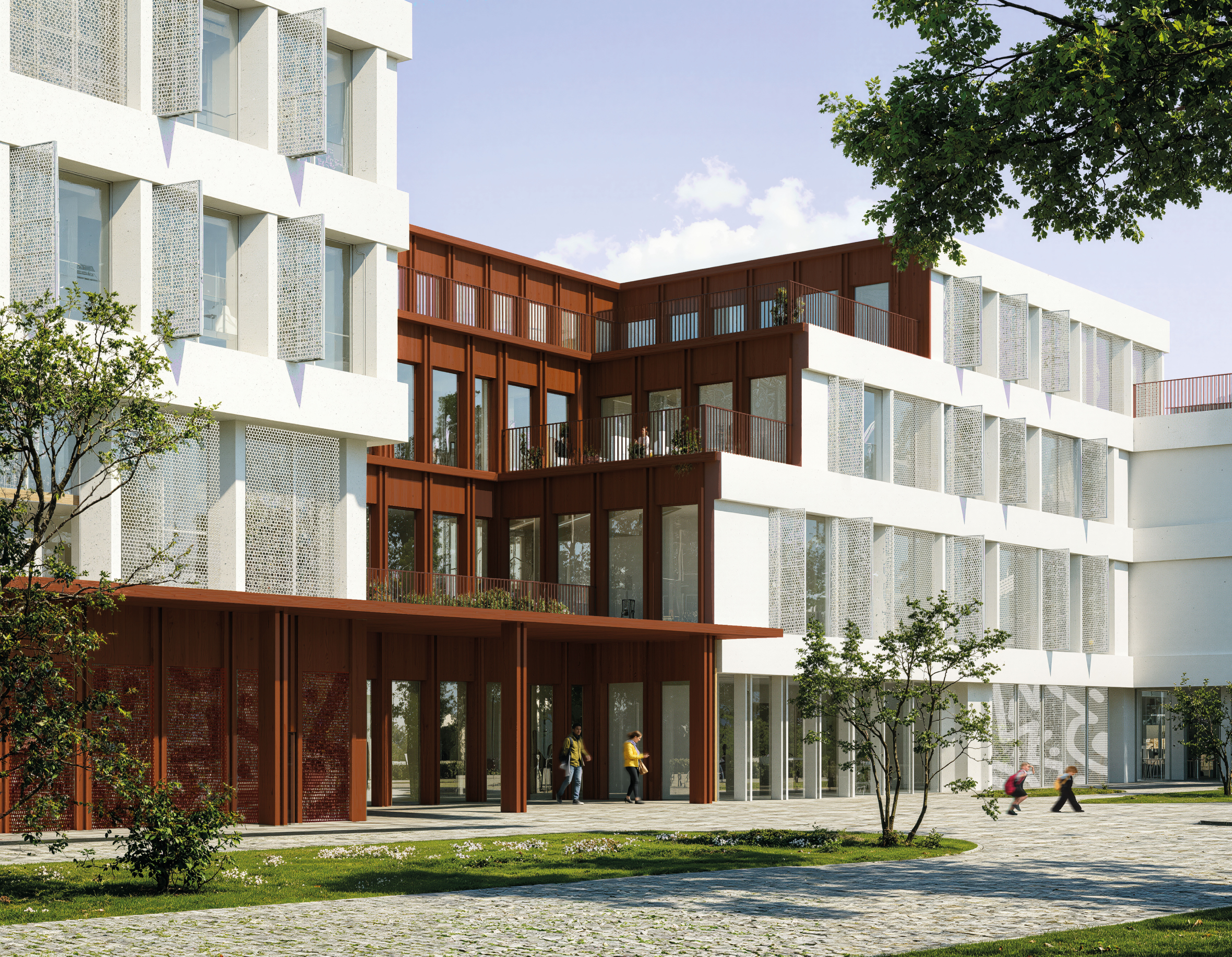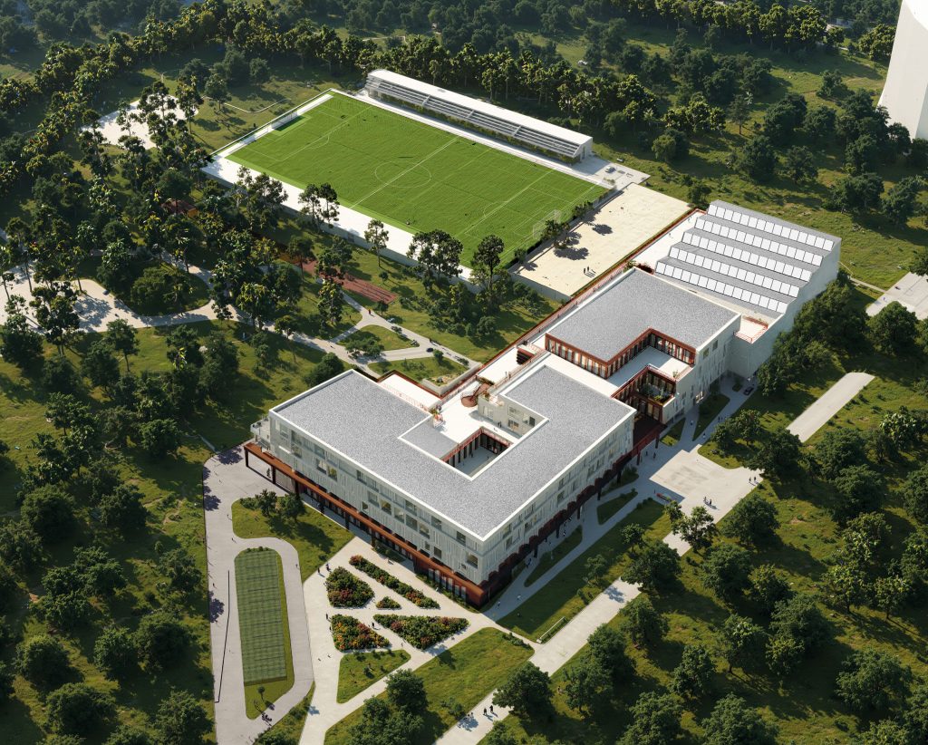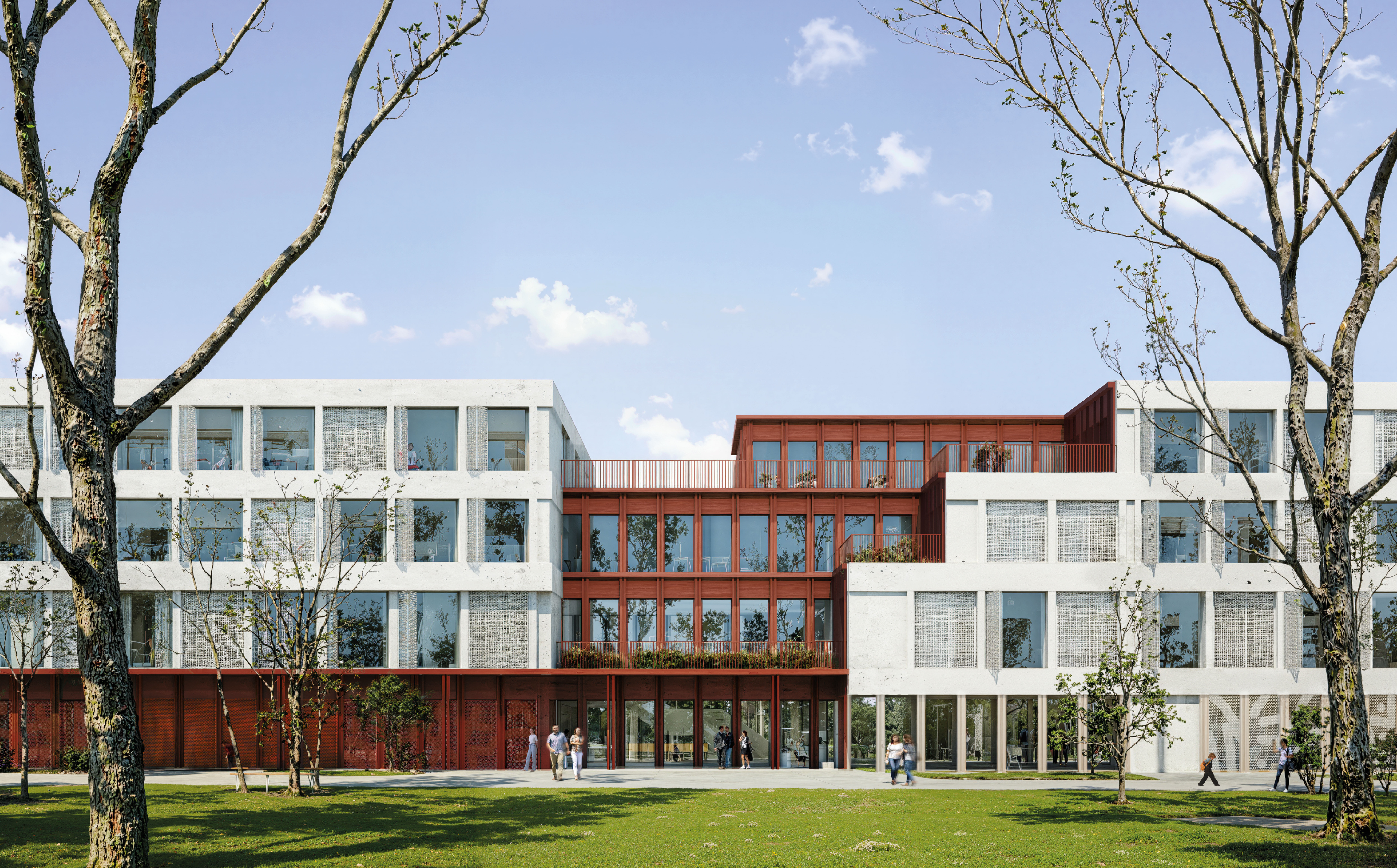 An important aspect of the design is the distinctive functional zoning: the ground floor serves as an open community center — it houses a large sports hall, a multi-purpose auditorium that can be adapted for various needs, a library, extracurricular clubs, and recreational spaces.