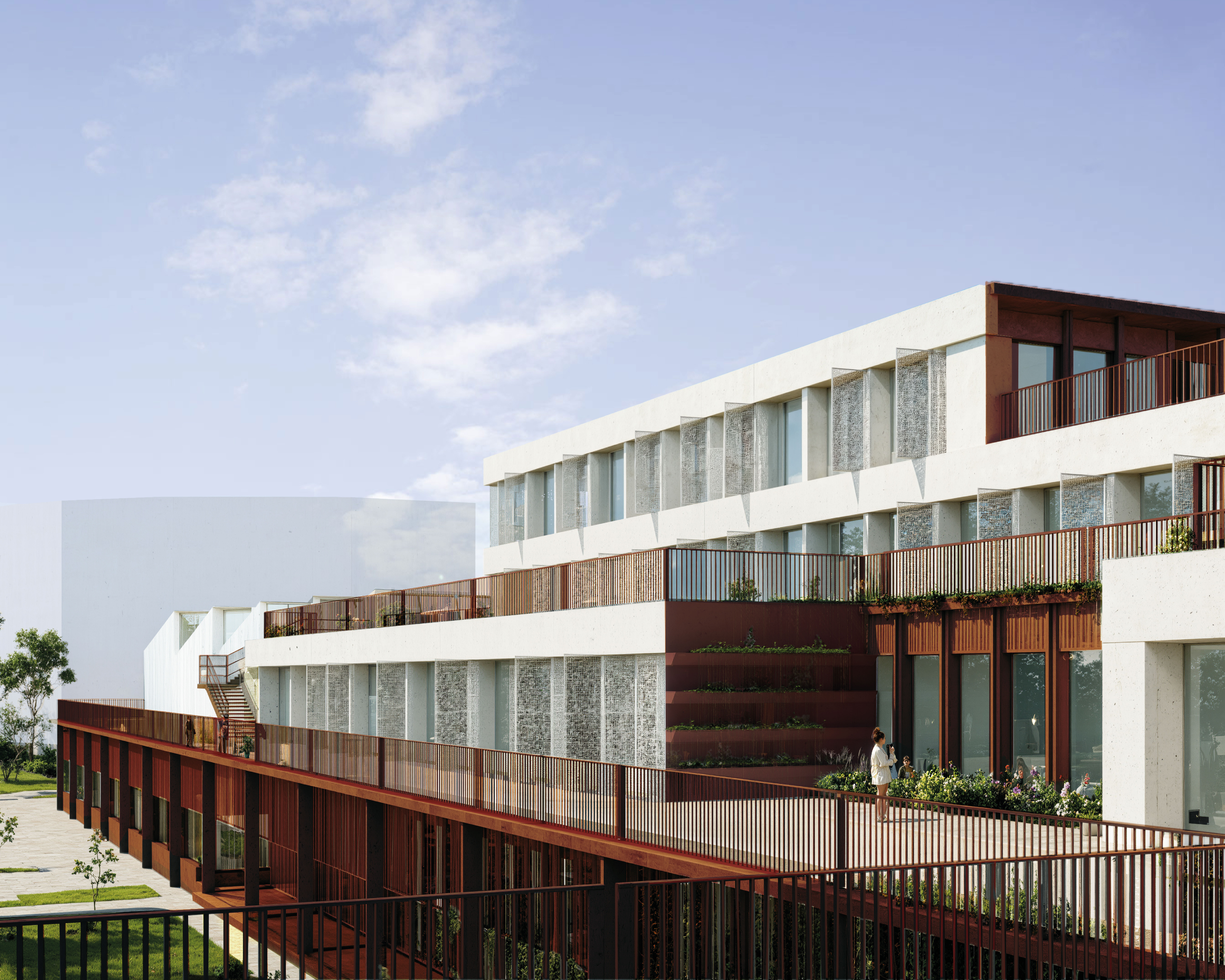 The facade design is enhanced by distinctive accents — red insets that seem to slice through the building’s volume, resembling natural fissures in stone. Rather than disrupting the integrity of the structure, these elements emphasize its depth and layered complexity. They serve not only as visual highlights but also as spatial cues, guiding movement and orientation within the building.