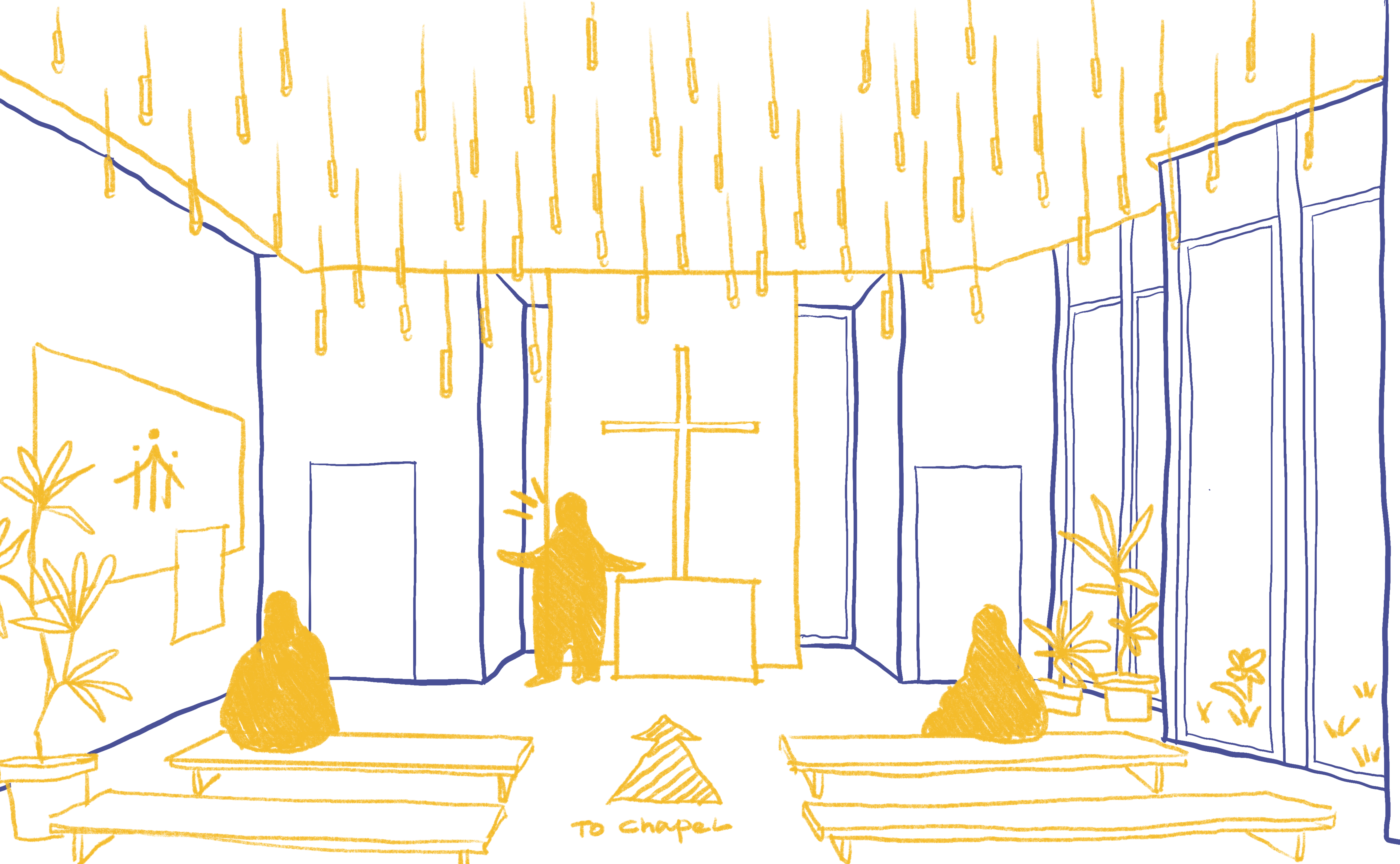 Додатковим викликом став духовний аспект, закладений у самому баченні замовника. Це відобразилось і на архітектурі. В простір гімназії було інтегровано дві каплички: одна з них ніби злита з простором актової зали, що дозволяє проводити масштабні події з духовним наповненням, а друга – відкрита назовні та доступна для громади незалежно від роботи гімназії. Архітектурно вони вирішені просто, але змістовно – як простори тиші, зосередженості та спільності.