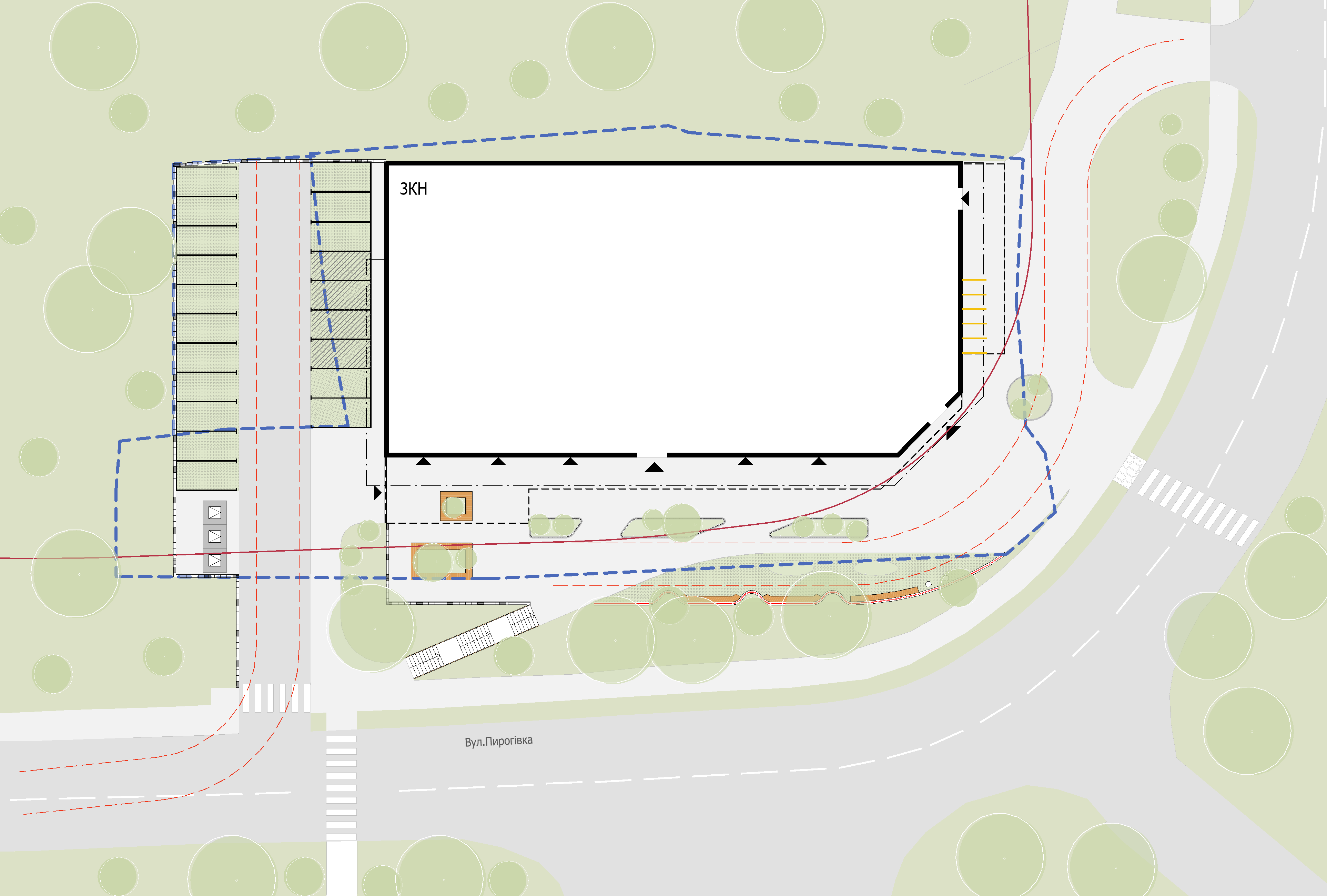Торговий центр на вулиці Пирогівка у Львові проєктується як багатофункціональний осередок локальної комерції та сервісів, що підсилює повсякденний маршрут району й формує впізнавану міську точку тяжіння. Триповерхова структура організована навколо зрозумілої системи входів і вертикальних зв’язків, які забезпечують швидке орієнтування та комфортний рух між рівнями. Архітектурний образ вирішено через поєднання прозорих площин та виразної фасадної пластики, що створює сучасний силует і водночас працює як єдине, впорядковане тло для активного комерційного середовища.