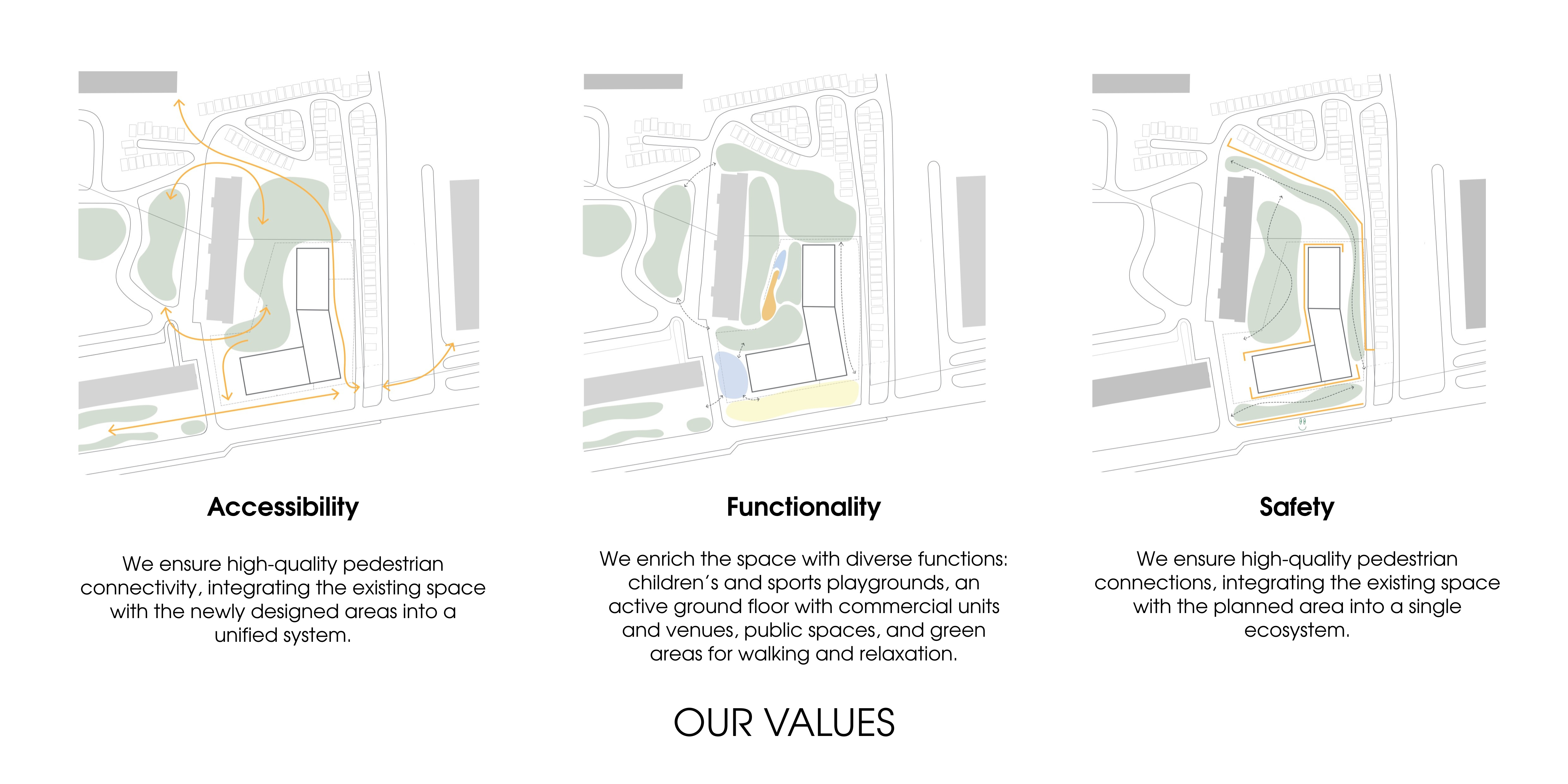 The master plan of the complex is thoughtfully designed down to the smallest detail — it’s a cohesive space with clearly defined functional zones. The inner courtyards are free from cars and transformed into green recreational areas with playgrounds and sports facilities. Commercial spaces on the ground floors provide daily conveniences for residents without the need to leave the complex. Pedestrian alleys, landscaping, bicycle parking, and a spacious public square in front of the main entrance all contribute to a comfortable, accessible, and visually appealing urban environment.
