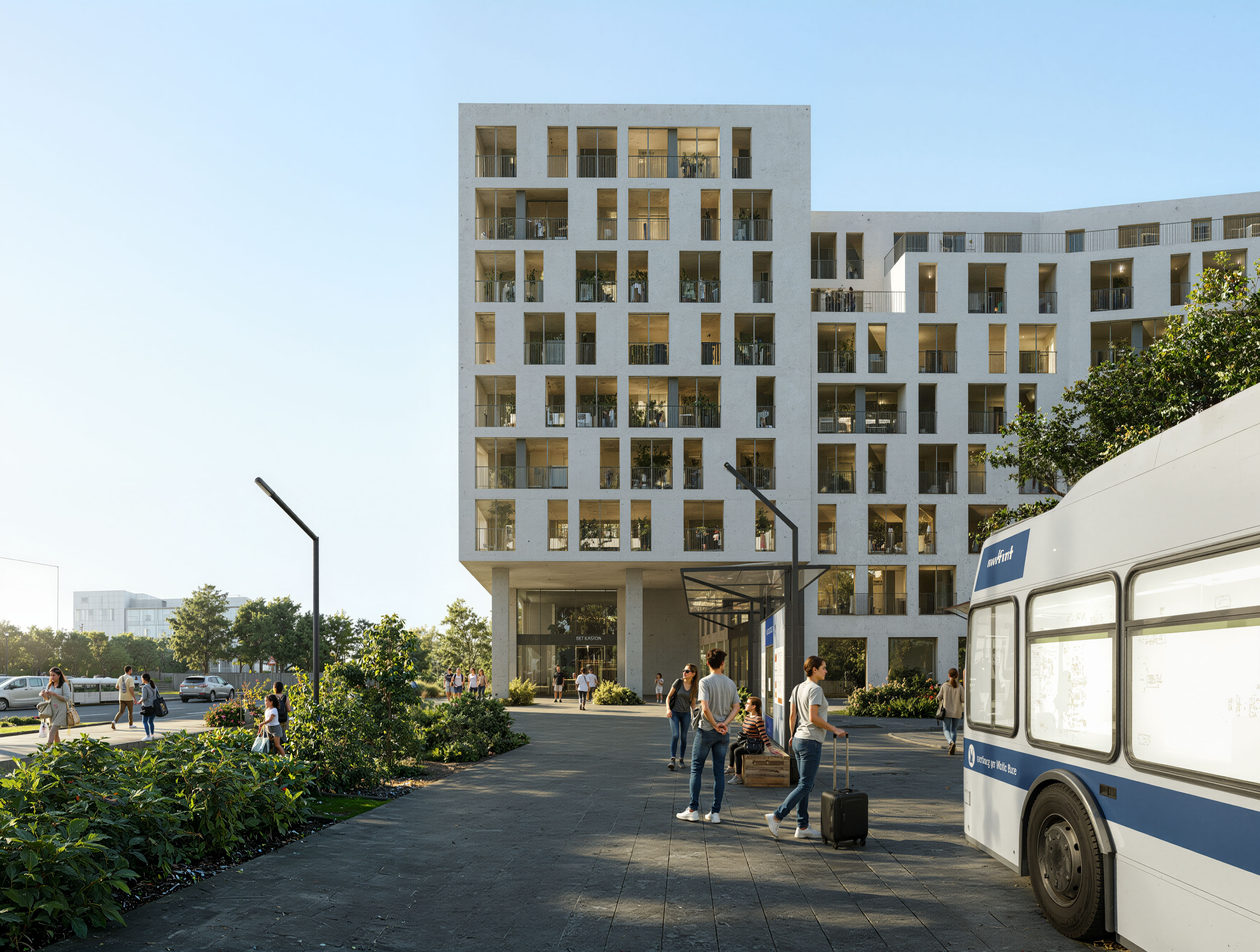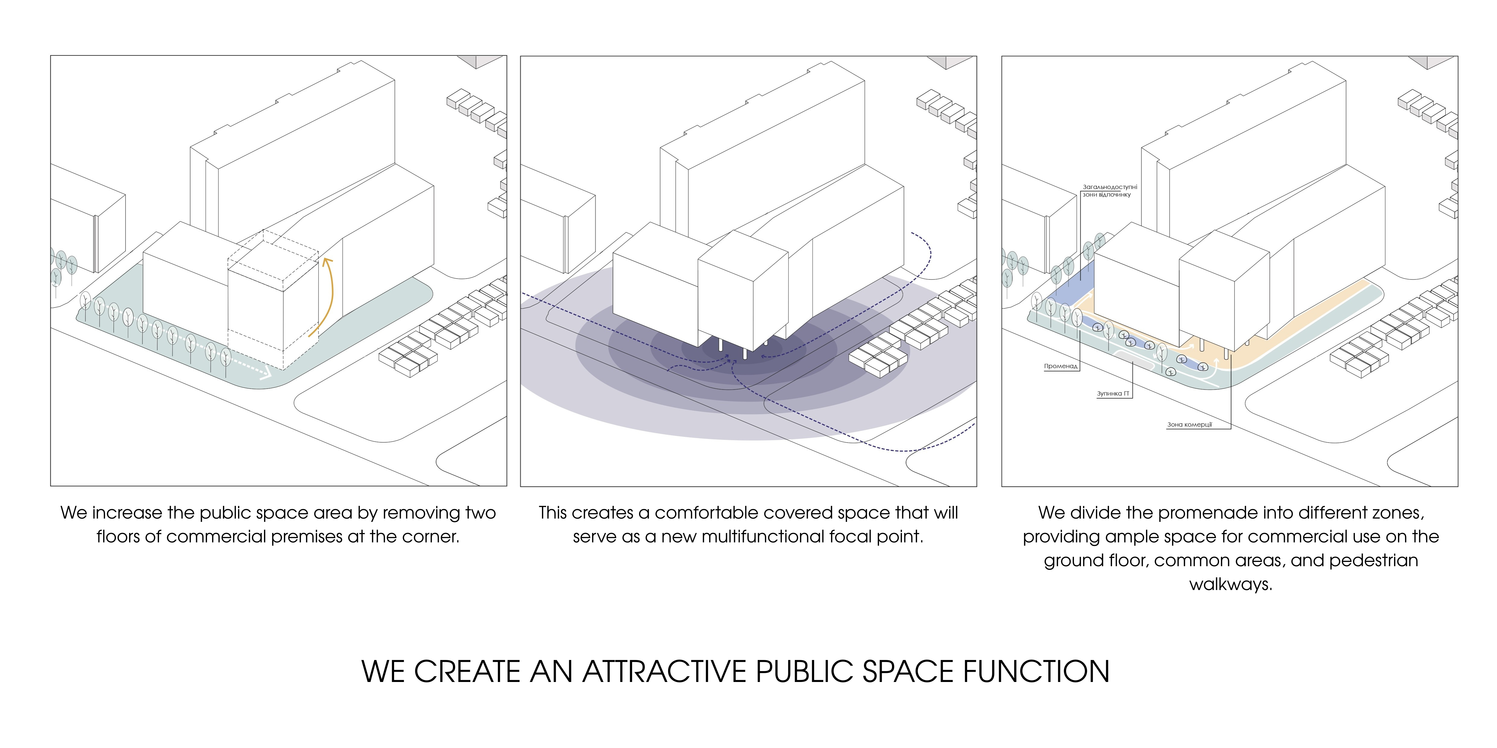 The architecture of the complex is an attempt to interpret urban life through the lenses of light, space, and human interaction. The building features a distinctive terraced form with gradual changes in height, creating a soft silhouette line that harmoniously blends into the surrounding development. This multi-level composition helps avoid a monolithic impression and makes the architecture feel more “human,” understandable, and open.
