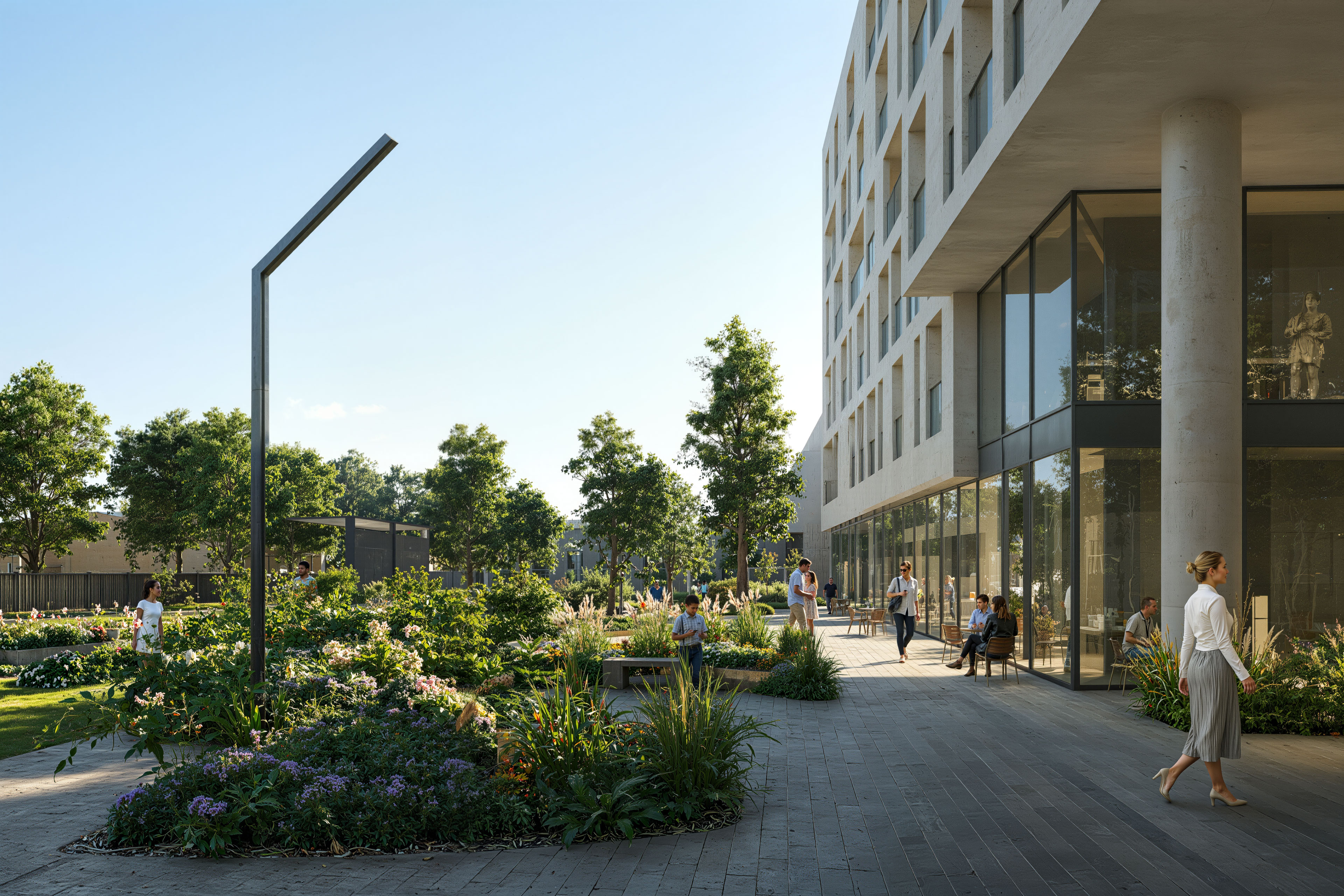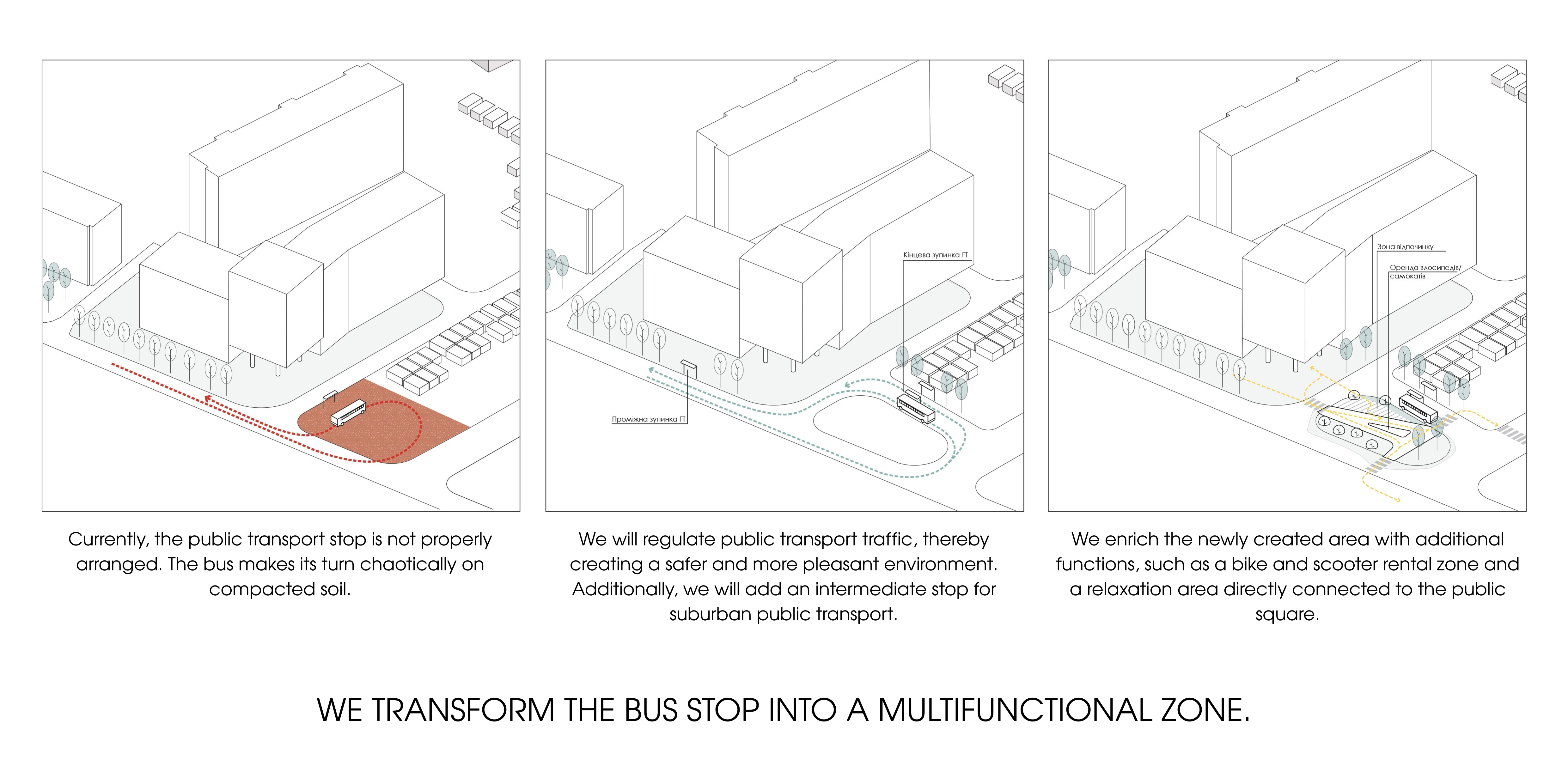 The square seamlessly flows into a compact transport hub that unites stops for city buses, suburban transport, as well as bicycle parking and scooter and bike rental points. This solution significantly improves the location’s accessibility for both residents and visitors. Thanks to this multifunctionality, the space transforms into a key urban link in the neighborhood — conveniently connected, safely organized, and pedestrian-friendly. Green zones, street furniture, and barrier-free design further enhance the quality of life around the complex.