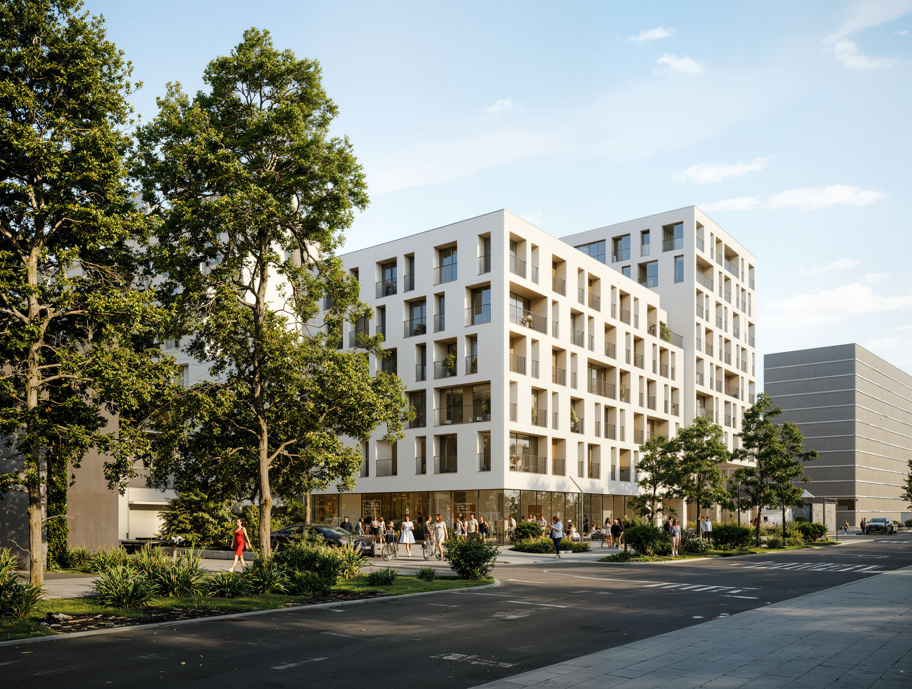 The project harmoniously integrates into the existing urban environment, creating not only a living space but also a new focal point for the neighborhood. The main urban highlight is the spacious public square beneath the building, serving as a modern city living room — a place for meetings, relaxation, and social interaction. Thanks to the glass facade on the first and second floors with commercial premises, the space features an active frontage that encourages vibrancy in the pedestrian zone.