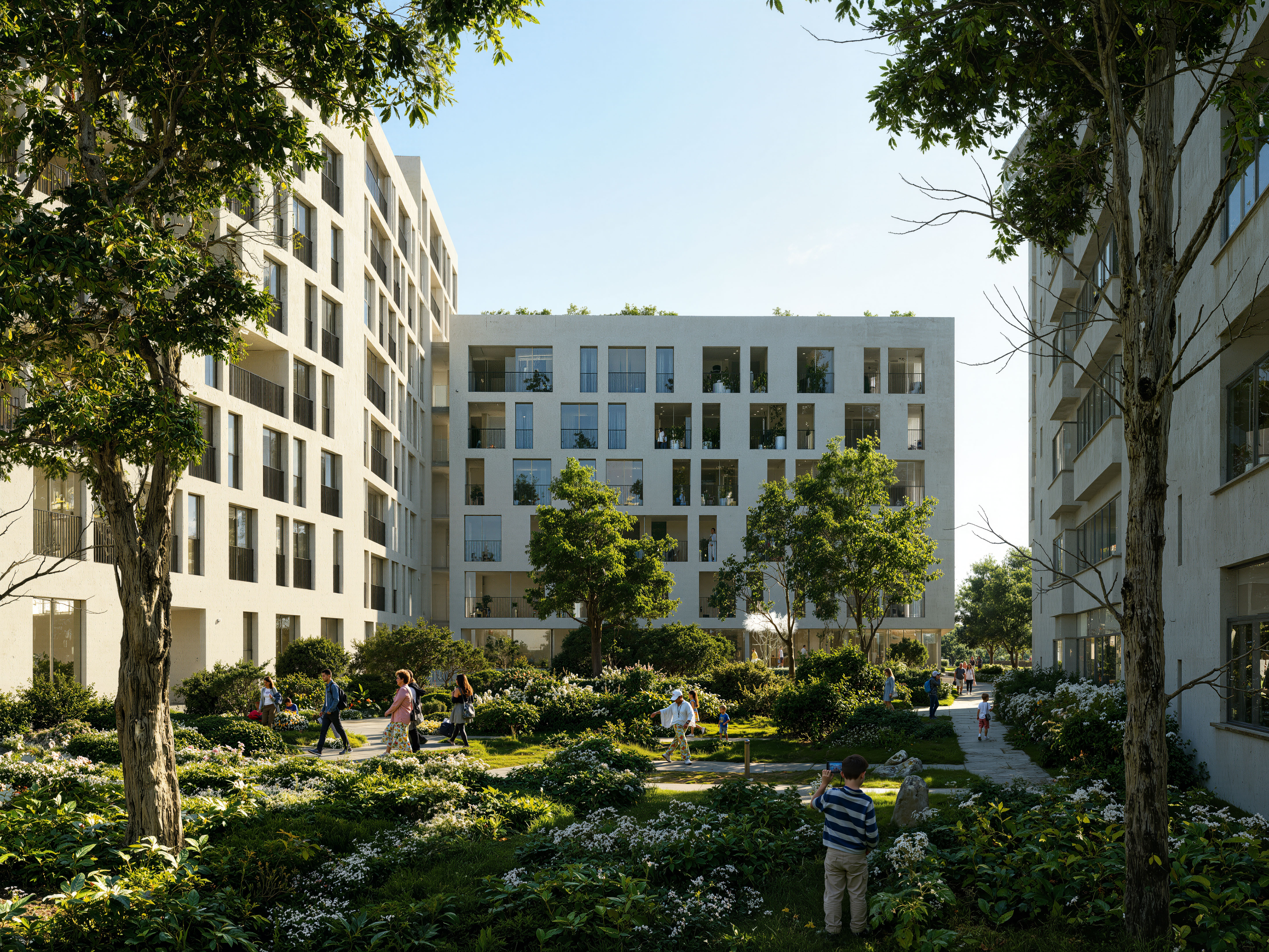 The facade is designed in a modern, restrained style, emphasizing geometry and the rhythm of openings. Deep loggias, varied window types, and vertical elements create a lively surface texture that changes throughout the day with the play of light and shadow. Light-colored finishes combined with wooden accents add warmth and elegance, while panoramic glazing ensures maximum connection between the interior and the outside environment. The architecture of the complex not only creates a comfortable space for residents but also elevates the district to a new level of visual culture.