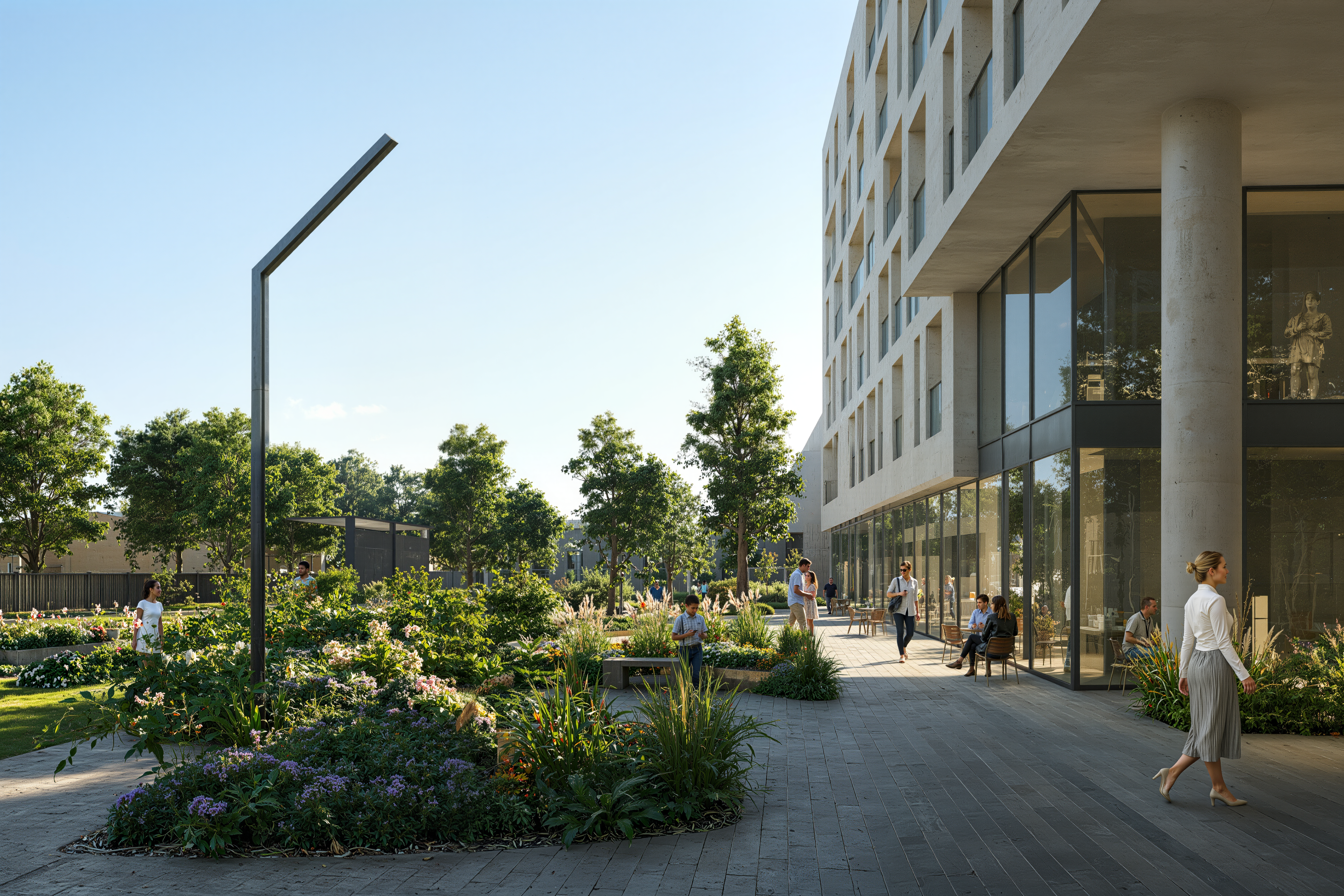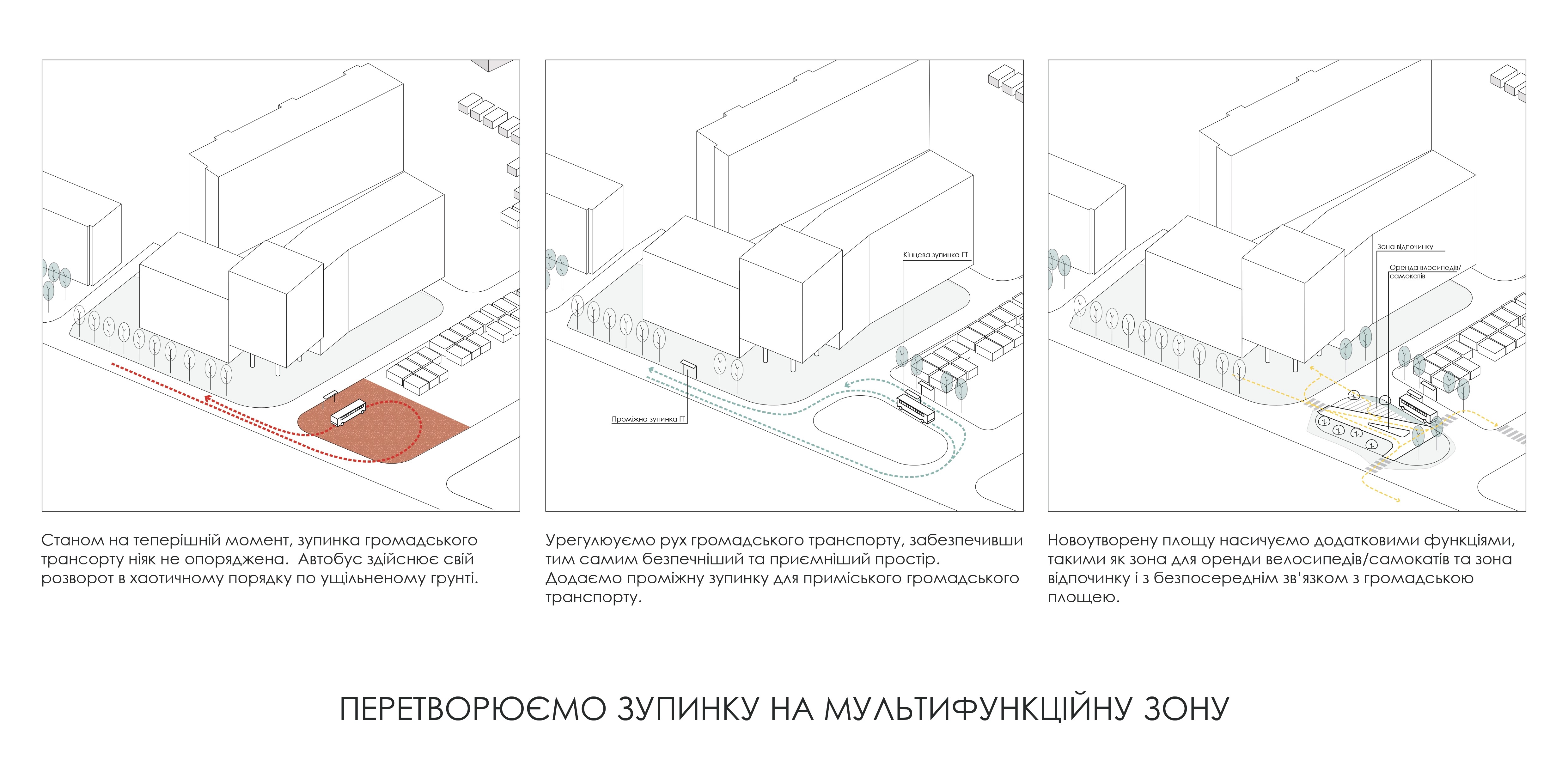 Площа органічно перетікає у компактний транспортний хаб, що об’єднує зупинки міських автобусів, приміського транспорту, а також велопарковки, пункти прокату самокатів і велосипедів. Це рішення значно покращує доступність локації як для мешканців, так і для відвідувачів. Завдяки цій мультифункціональності простір перетворюється на ключову урбаністичну ланку району — зручно пов’язану, безпечно організовану й дружню до пішоходів. Зелені зони, вуличні меблі та безбар’єрне середовище лише підсилюють якість життя навколо комплексу.