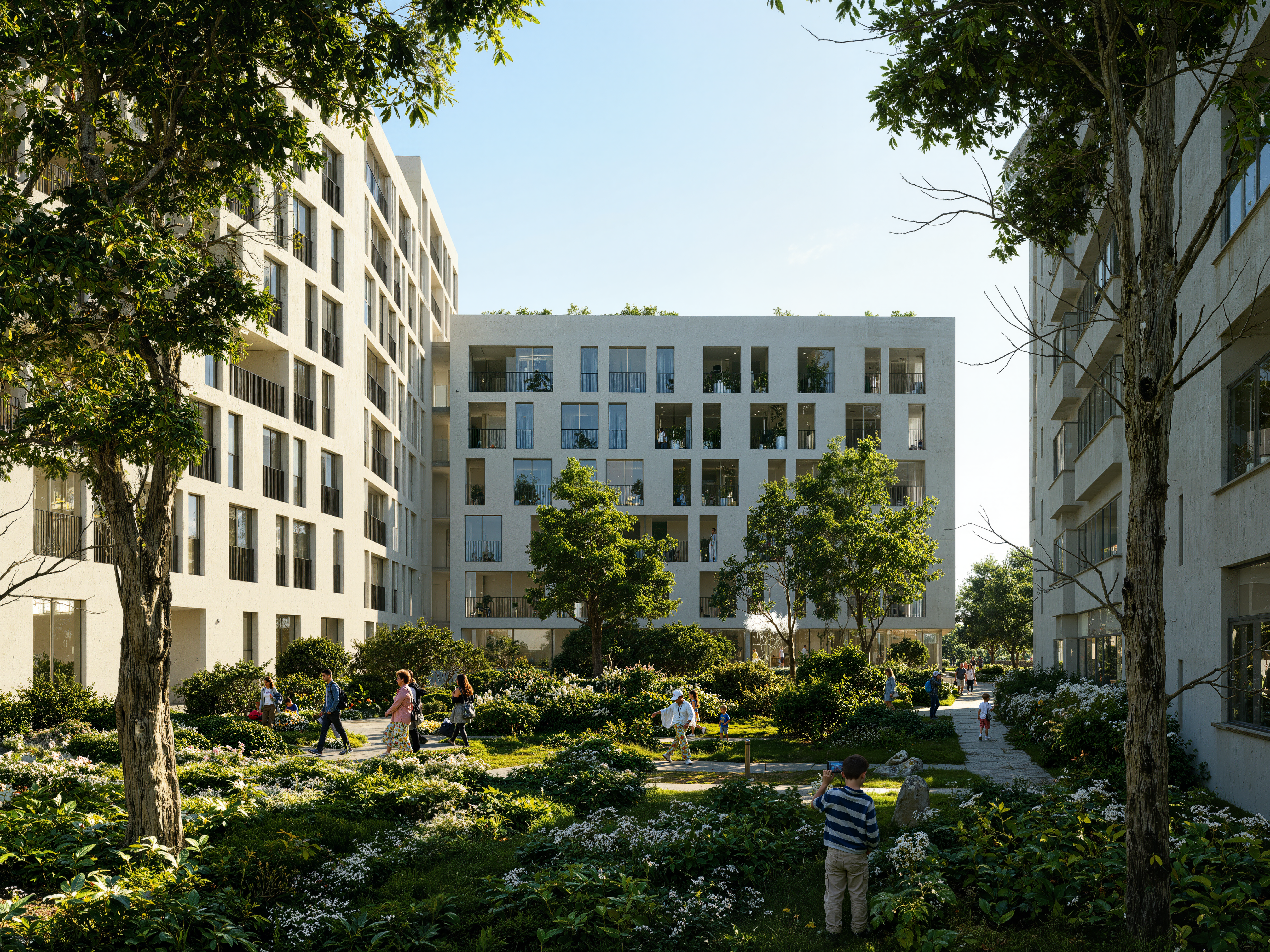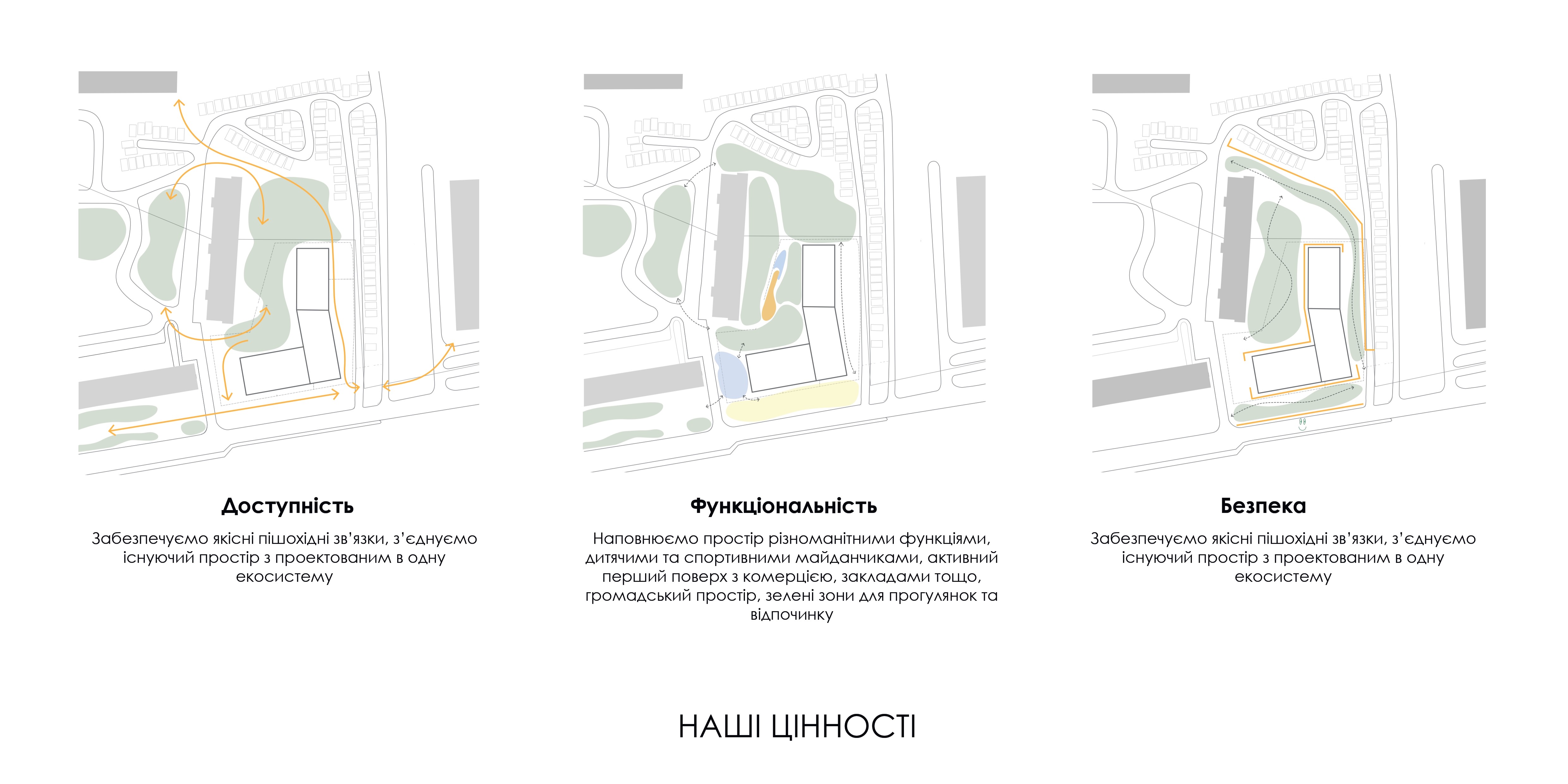Генеральний план комплексу продуманий до дрібниць — це цілісний простір із розділеними функціональними зонами. Внутрішні дворики закриті від машин і перетворені на зелені зони відпочинку з дитячими та спортивними майданчиками. Комерційні приміщення на перших поверхах створюють комфорт мешканцям без потреби залишати територію комплексу. Пішохідні алеї, озеленення, велопарковки та простора громадська площа перед головним входом формують зручне, доступне й естетичне міське середовище.