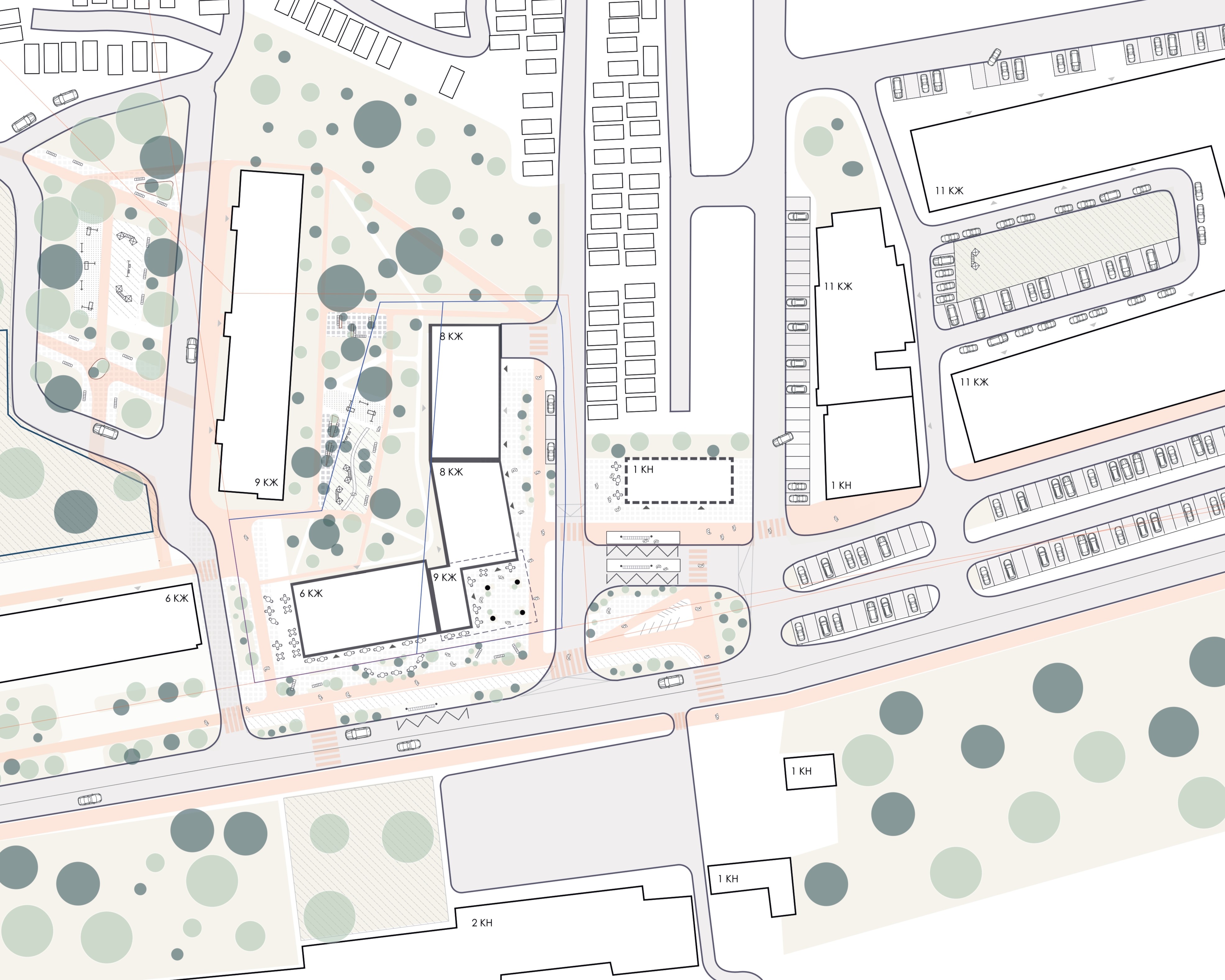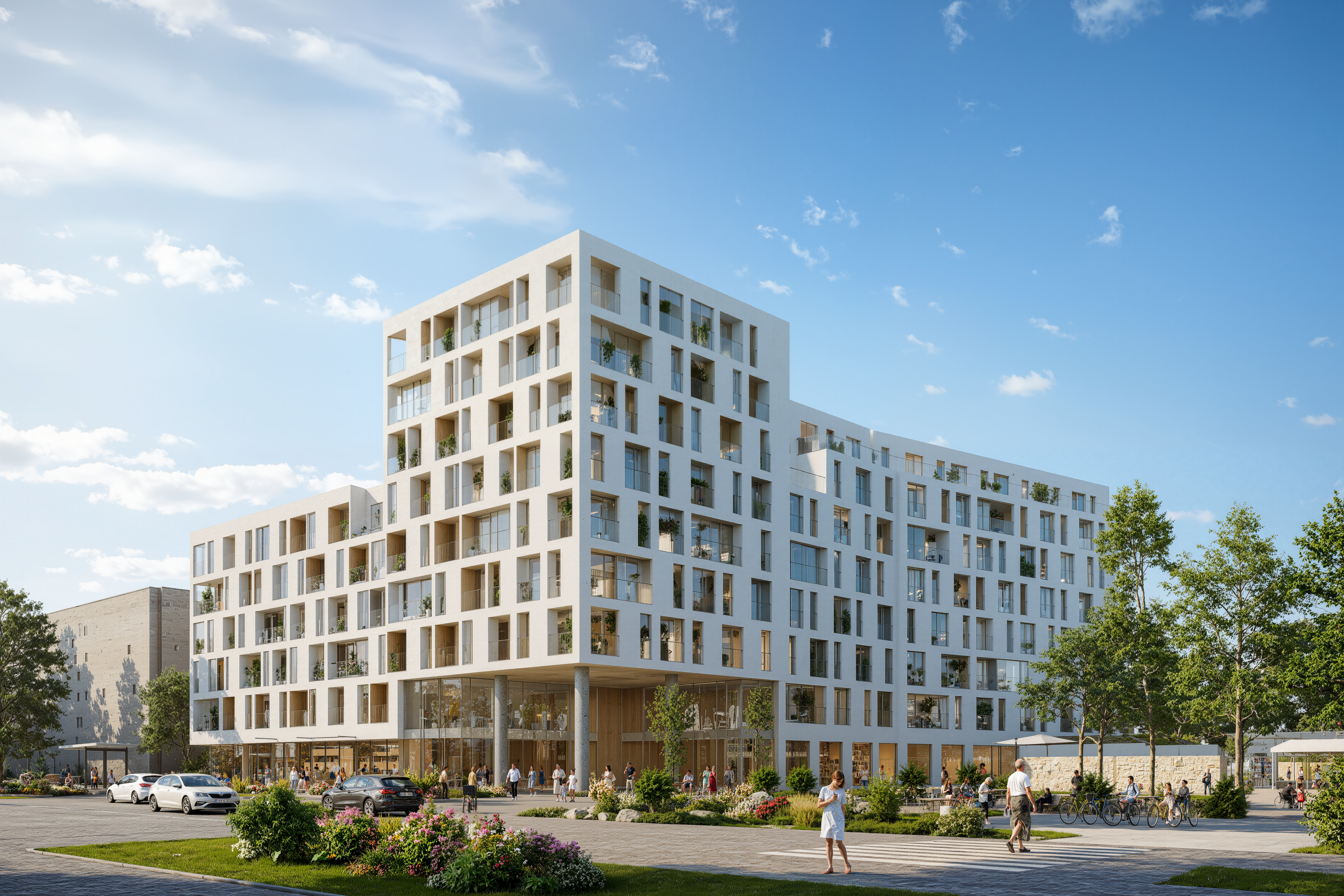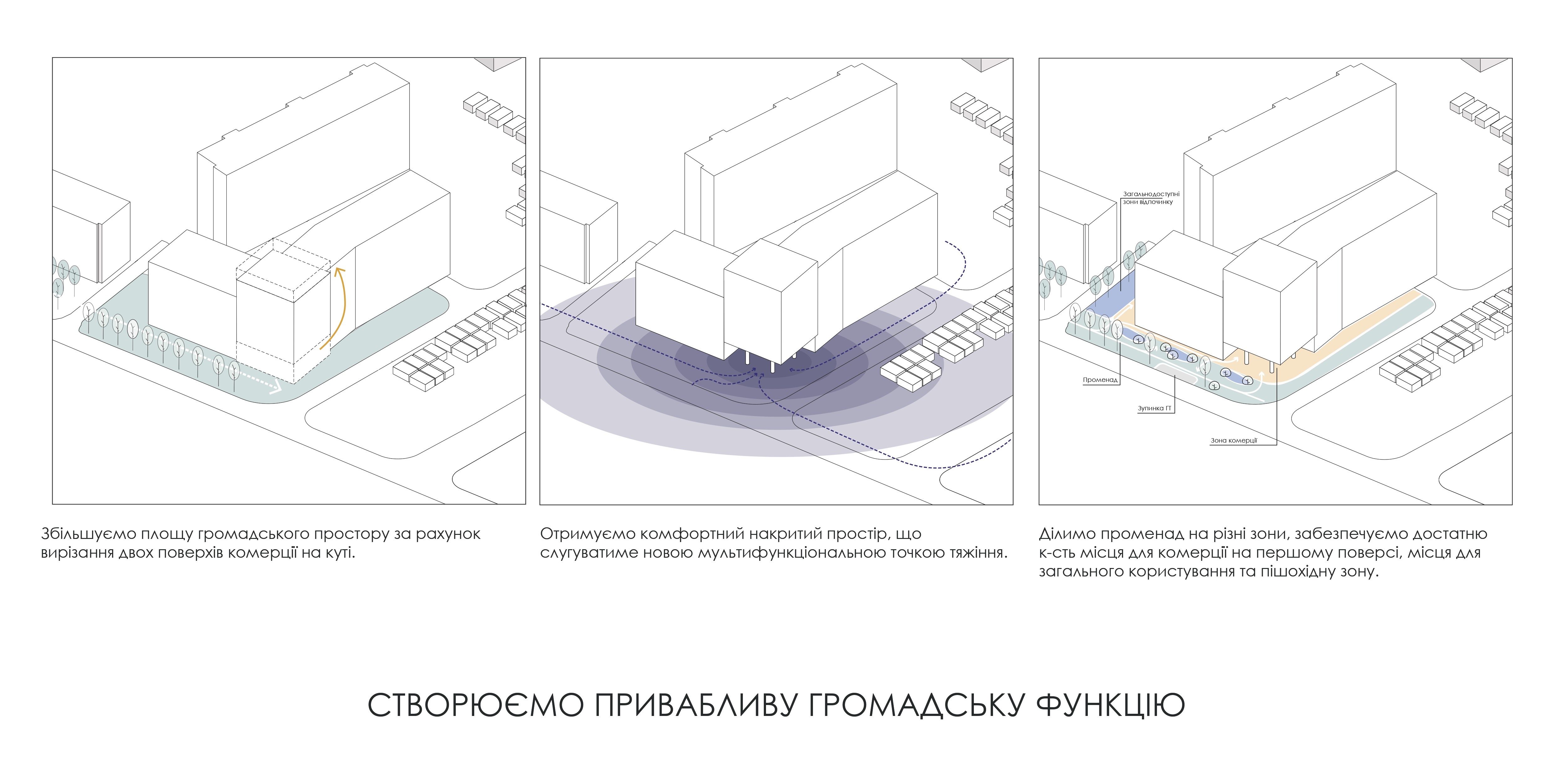 Проєкт гармонійно інтегрується в існуюче міське середовище, формуючи не лише простір для життя, а й нову точку тяжіння району. Основним урбаністичним акцентом стала простора громадська площа під будівлею, що виконує роль сучасної міської вітальні — місця зустрічей, відпочинку та взаємодії. Завдяки скляному фасаду першому та другого поверхів з комерційними приміщеннями простір отримує активний фасад, який стимулює життя в пішохідній зоні.