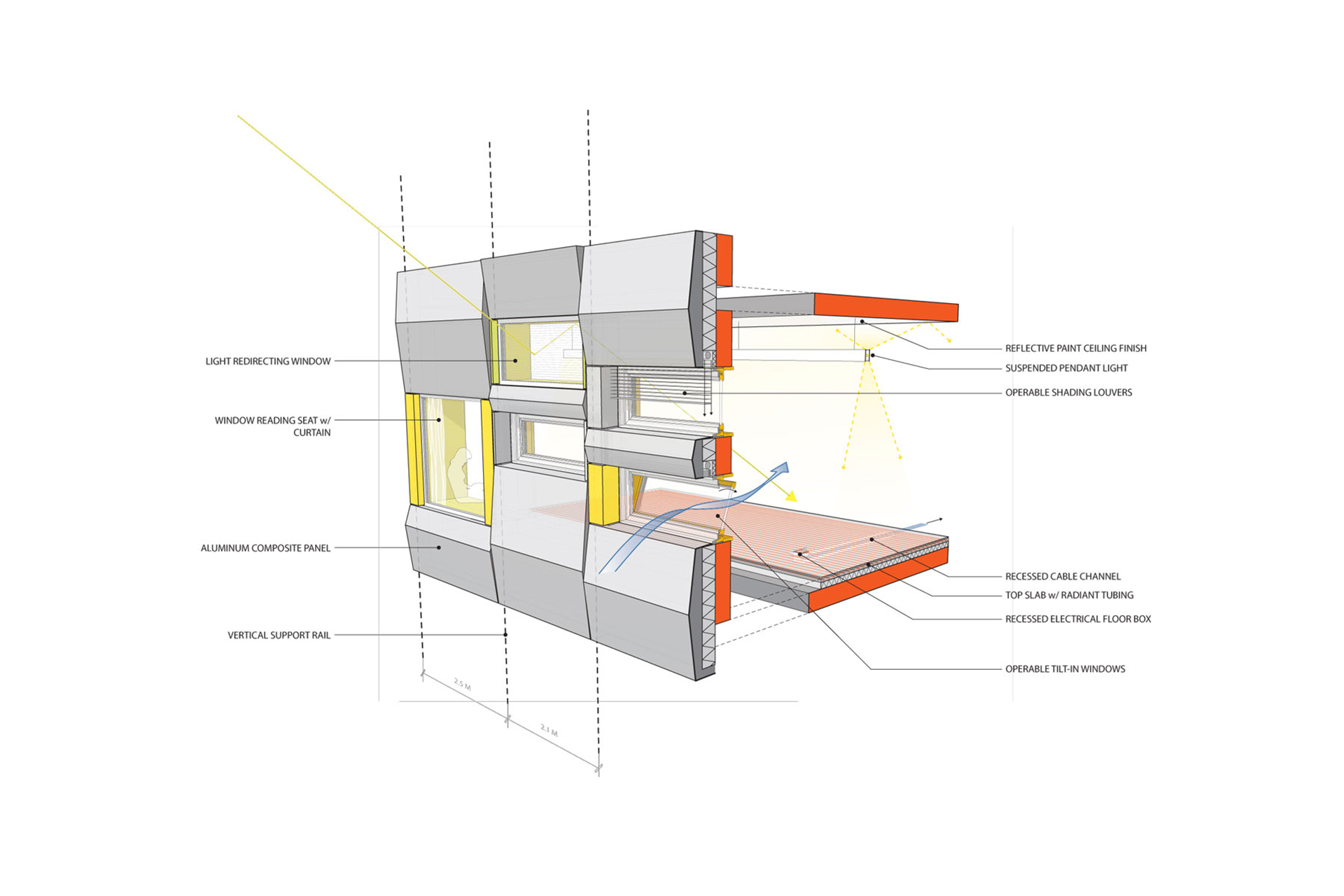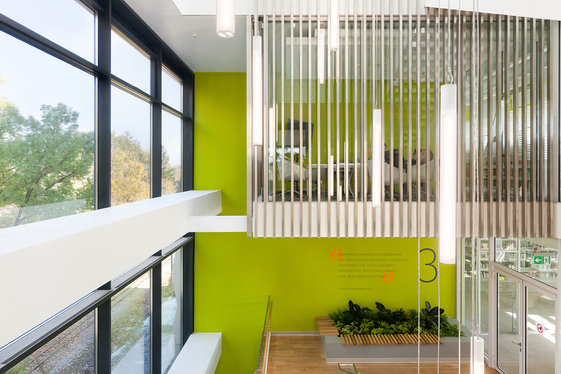 Ці заходи включають стратегічне розміщення скління в зонах книжкових полиць, пасивні системи затінення фасадів на повністю засклених фасадах, жалюзі для перенаправлення світла, розміщені у вибраних вікнах, та обширне зелене покриття даху. По всій будівлі також використовуються потрійне скління та світлодіодне освітлення – вперше для сучасної будівлі в Україні.