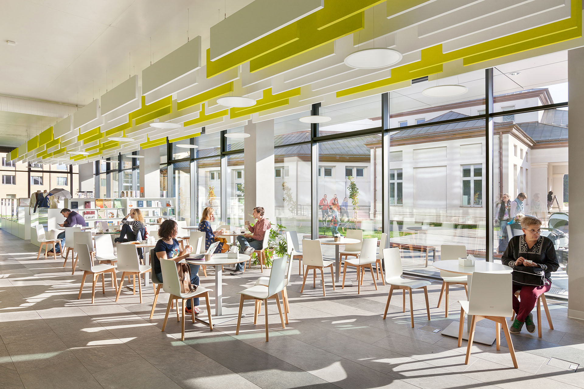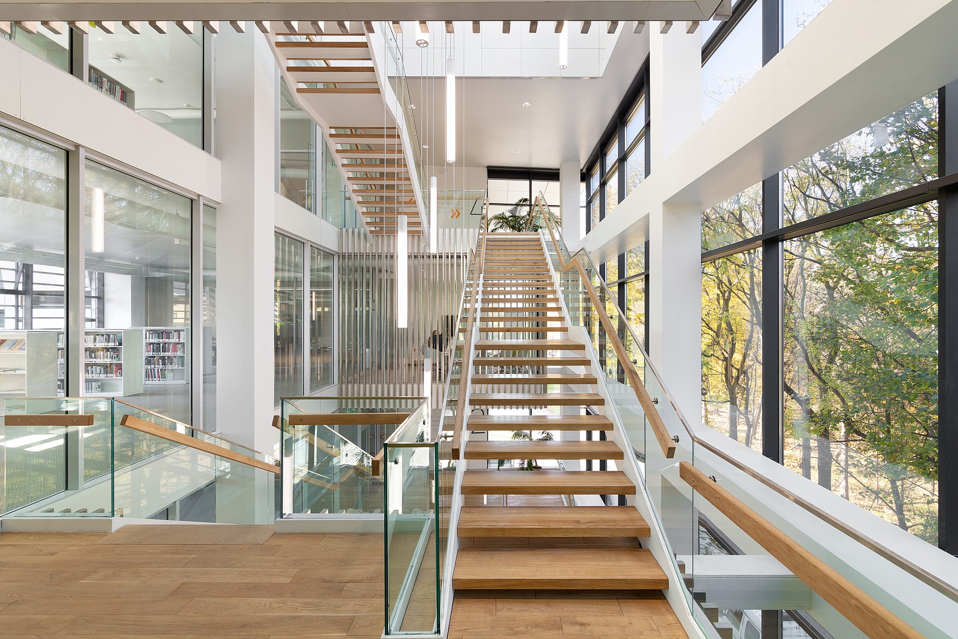 З архітектурної точки зору, термін відкритості відіграє важливу роль у дизайні будівлі. Ця концепція відображається в безбар’єрному першому поверсі будівлі. Тут розташовані читальні, виставкові та конференц-зали, а також кафе та книгарня університету. Верхні поверхи будівлі мають більш академічний характер, з переважно відкритою колекцією, різними читальними просторами, тихими зонами для навчання та кімнатами для групової роботи. Як громадська, так і академічна частини будівлі – це гнучкі простори, організовані навколо вертикального атріуму, з якого завжди відкривається вид на прекрасний парк, розташований поруч з кампусом.