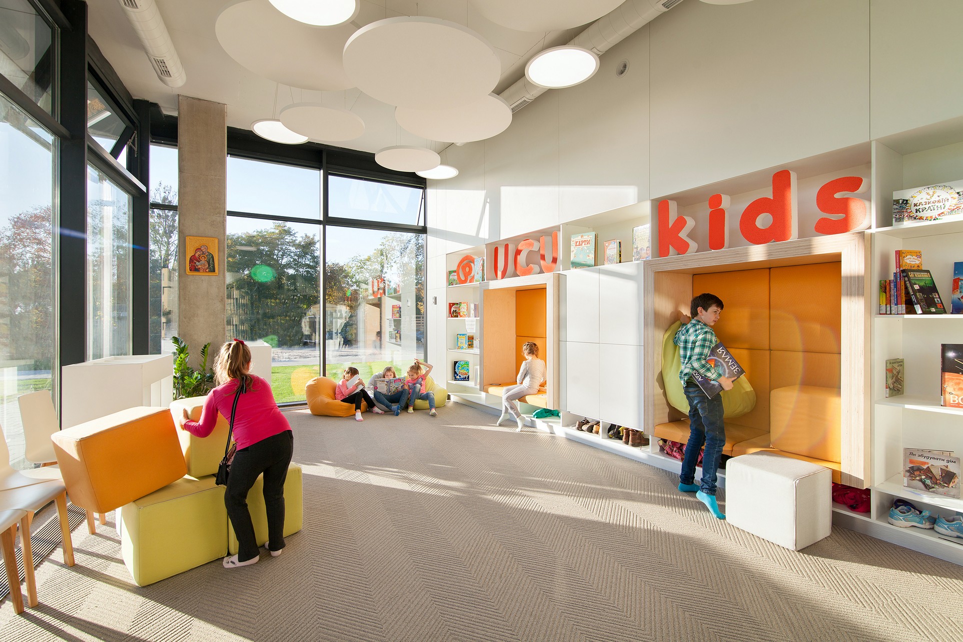 Конструкція виготовлена з литого бетону. Нижня сторона бетонних плит відкрита та пофарбована світловідбивною білою фарбою для посилення природного денного освітлення. Складені алюмінієві композитні панелі, створені з використанням геометричного візерунка та плетіння традиційної української вишивки, покривають фасади книжкової полиці та тихих зон для навчання, контролюючи надмірне сонячне світло та постійно надаючи будівлі змінного вигляду.