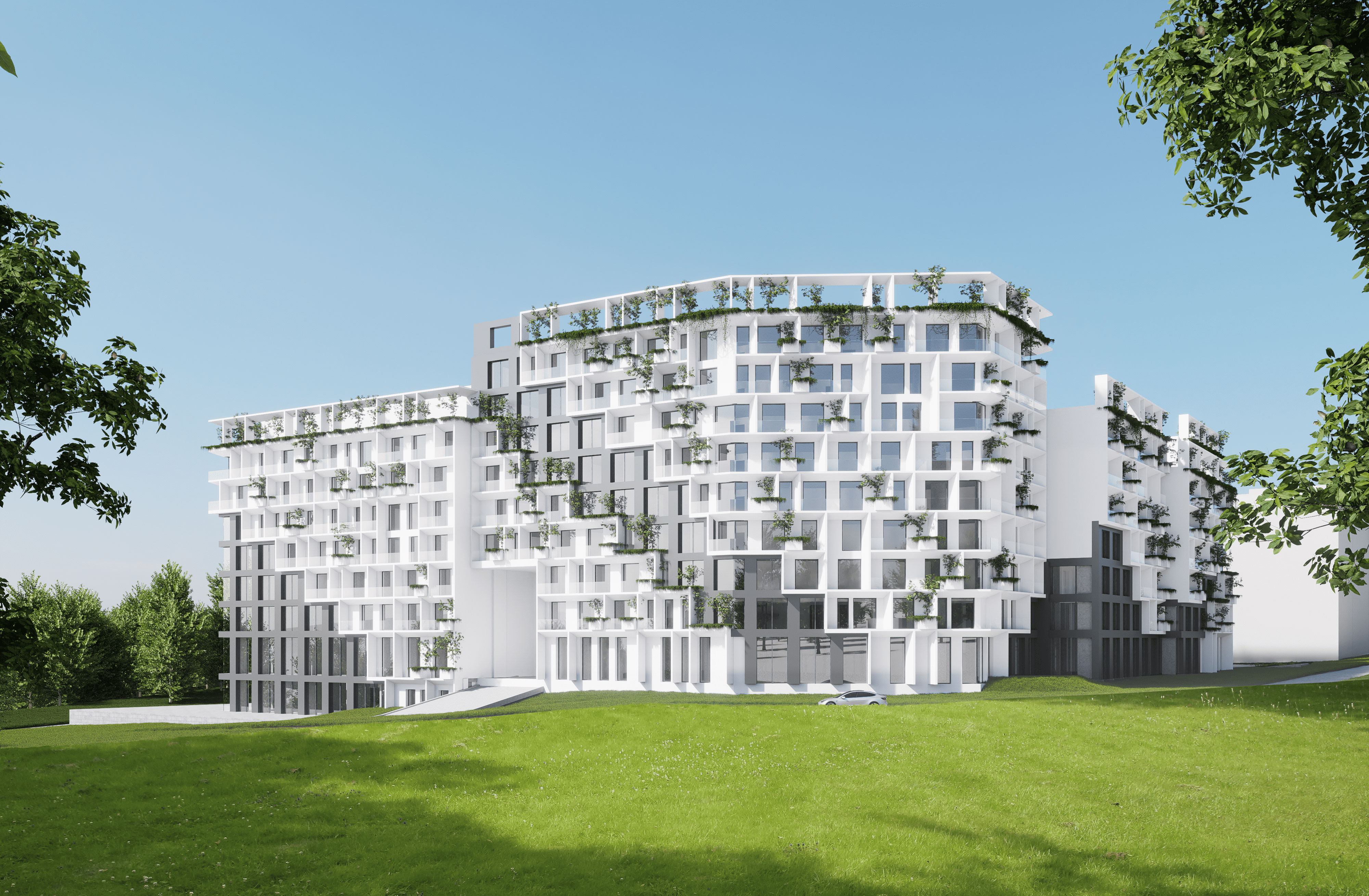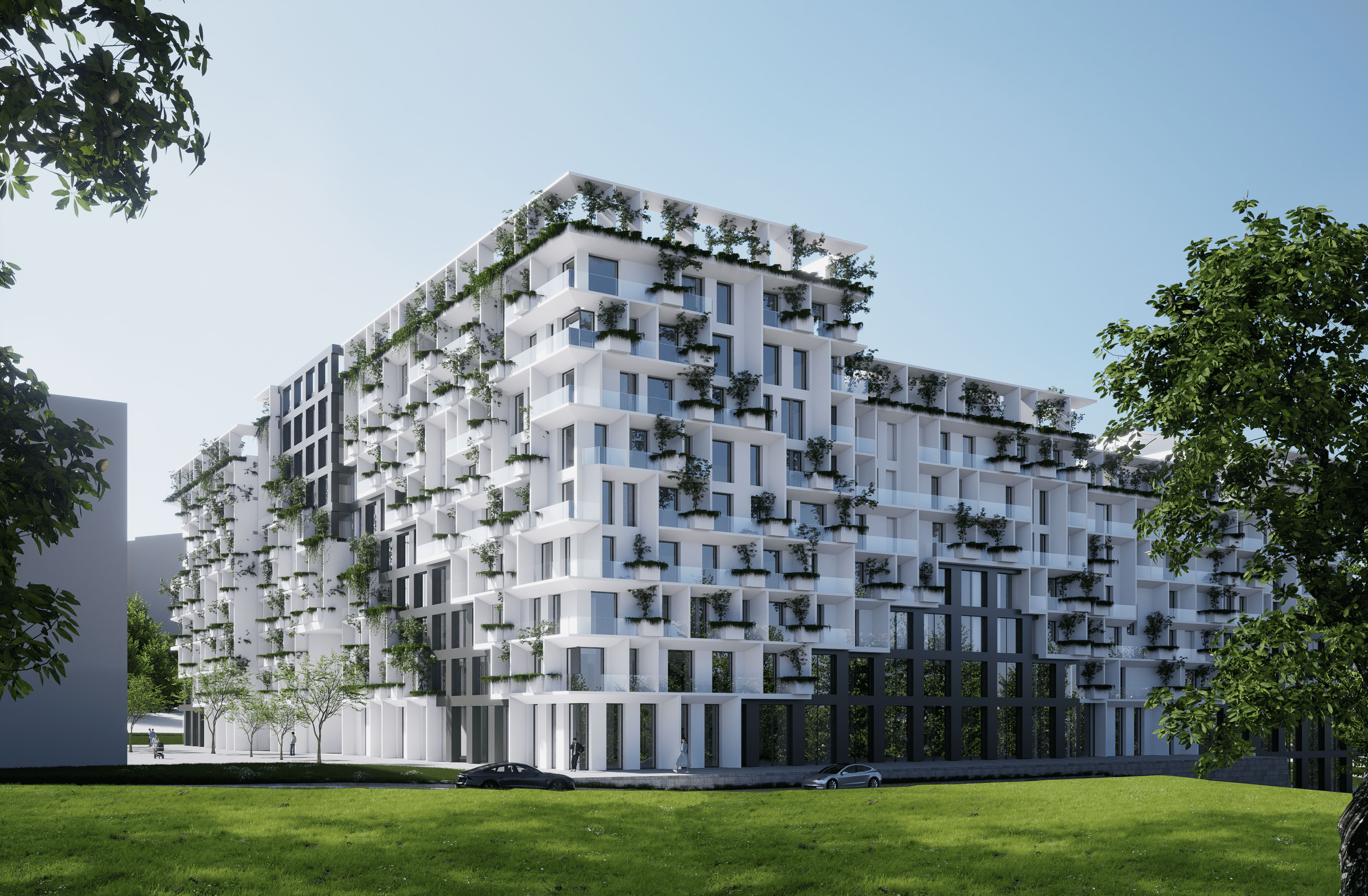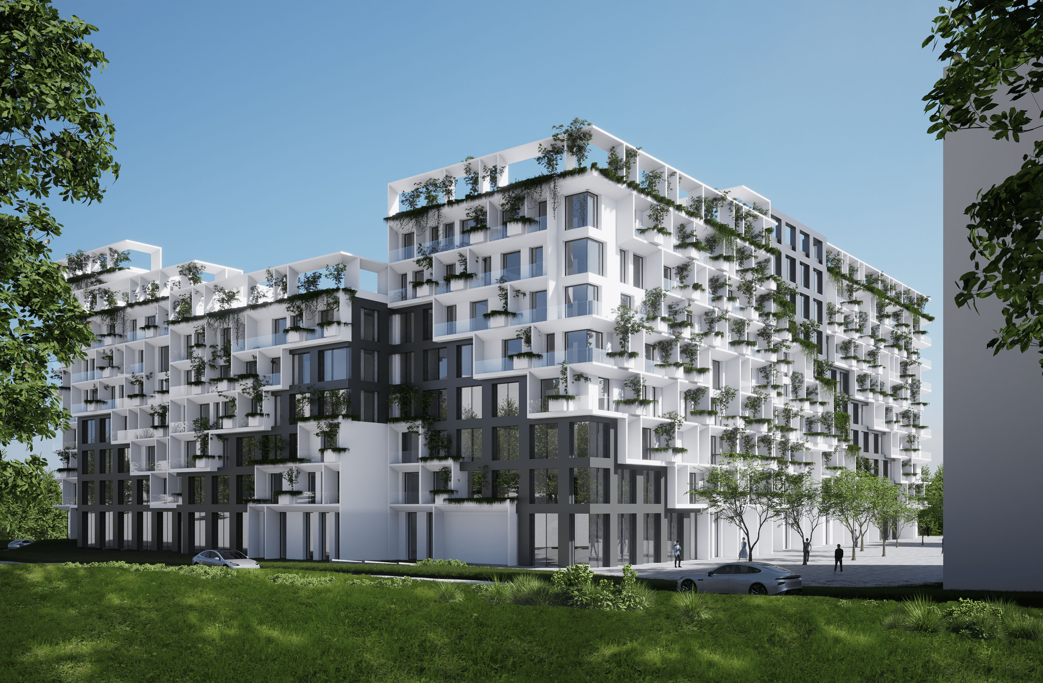The facade of the buildings is designed with contrasting elements that make it unique. White decorative prefabricated elements on the balconies create a dynamic pattern that never repeats, while the strict black mesh emphasizes the geometry of the buildings, adding rhythm to the architectural composition.