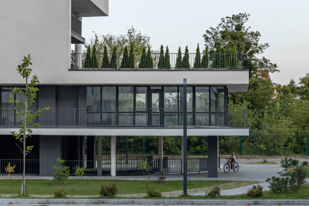 На рівні перших двох поверхів заплановано розмістити приміщення громадського обслуговування, що може покращити комфорт проживання мешканців району загалом. Комерційні та житлові частини будівлі мають різні вхідні групи і жодним чином не перетинаються.